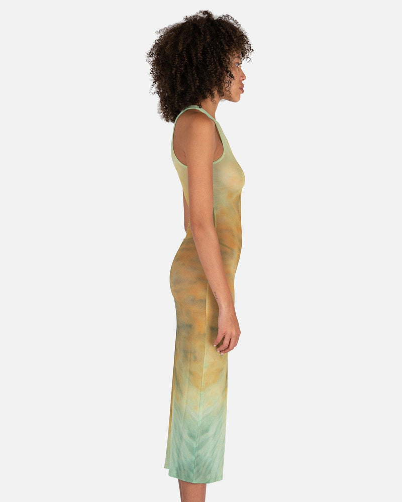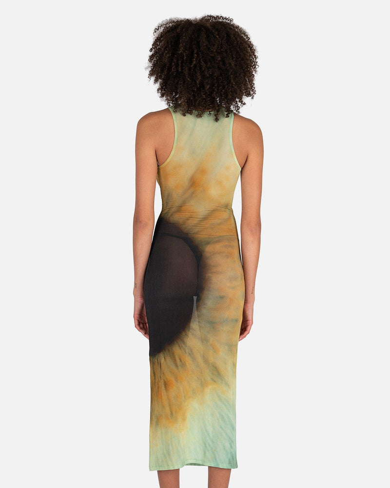 Paloma Wool women's sheer eye print dress in green. This sleeveless dress has a bodycon fit and an enlarged image of an iris across the body.