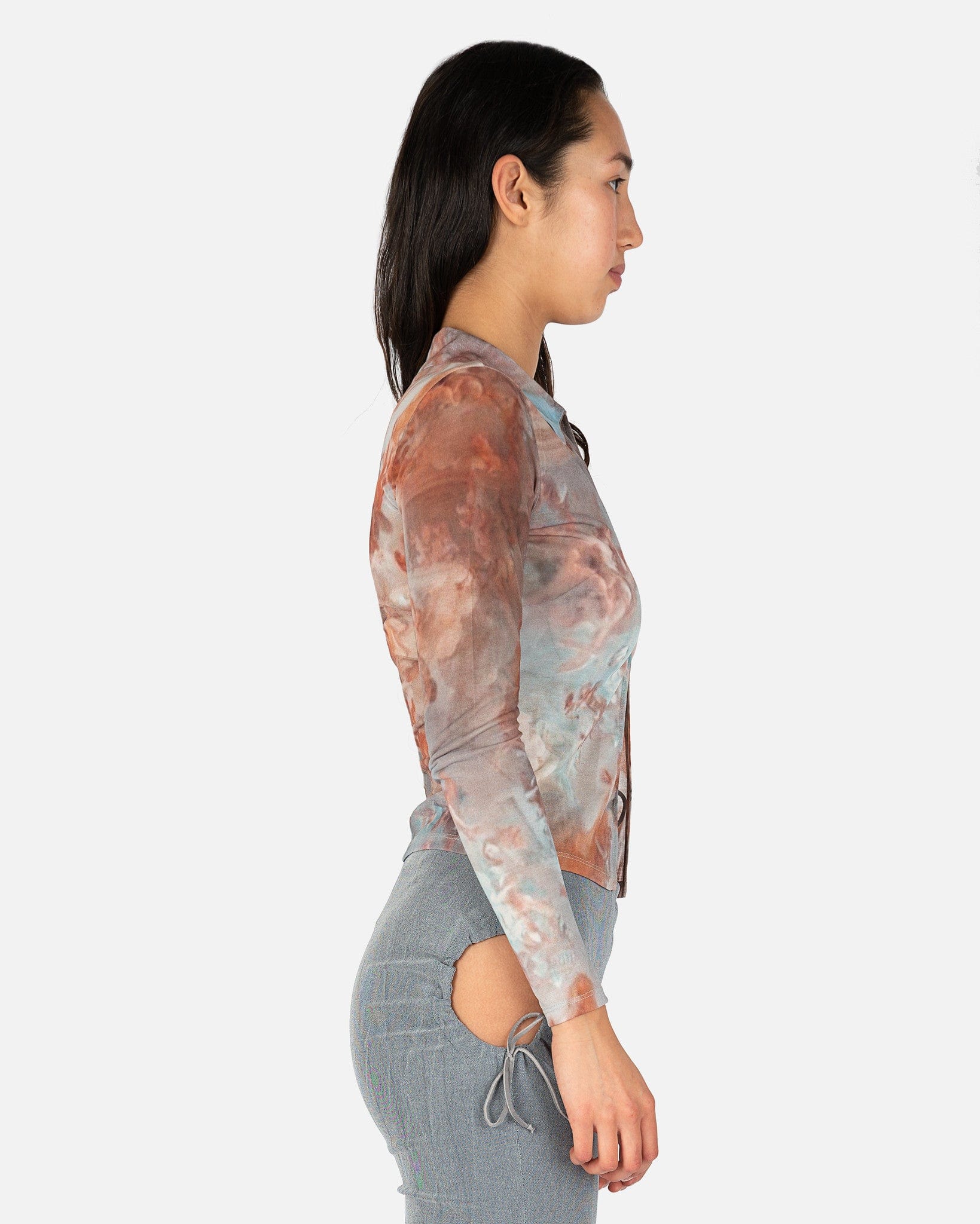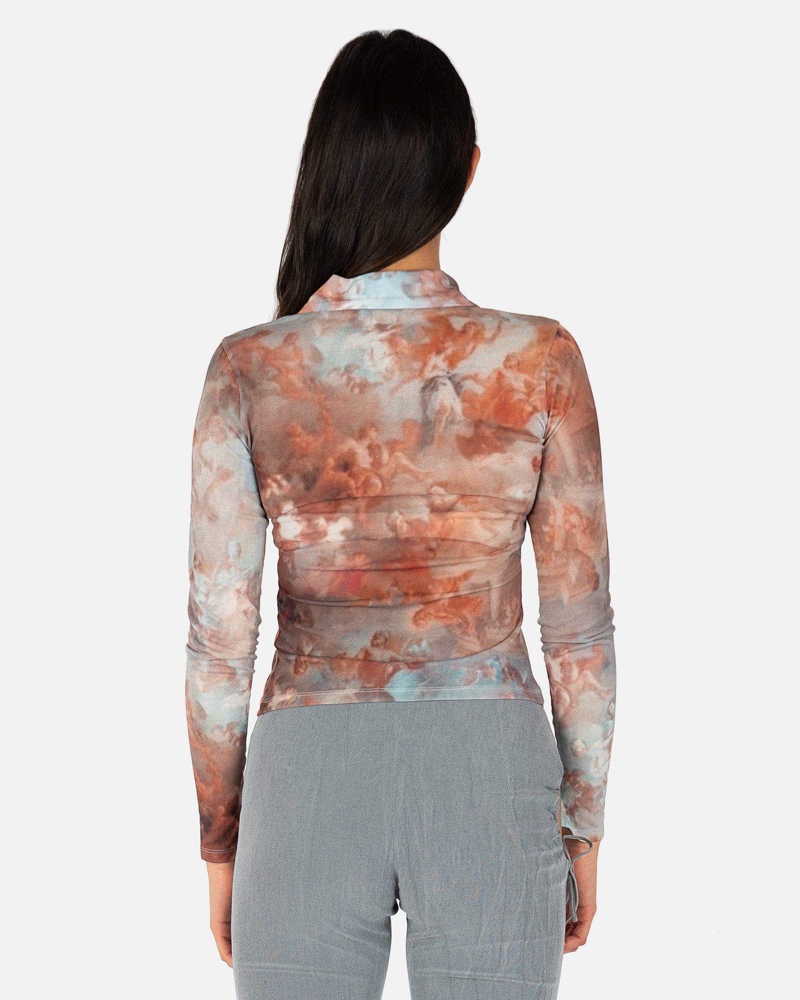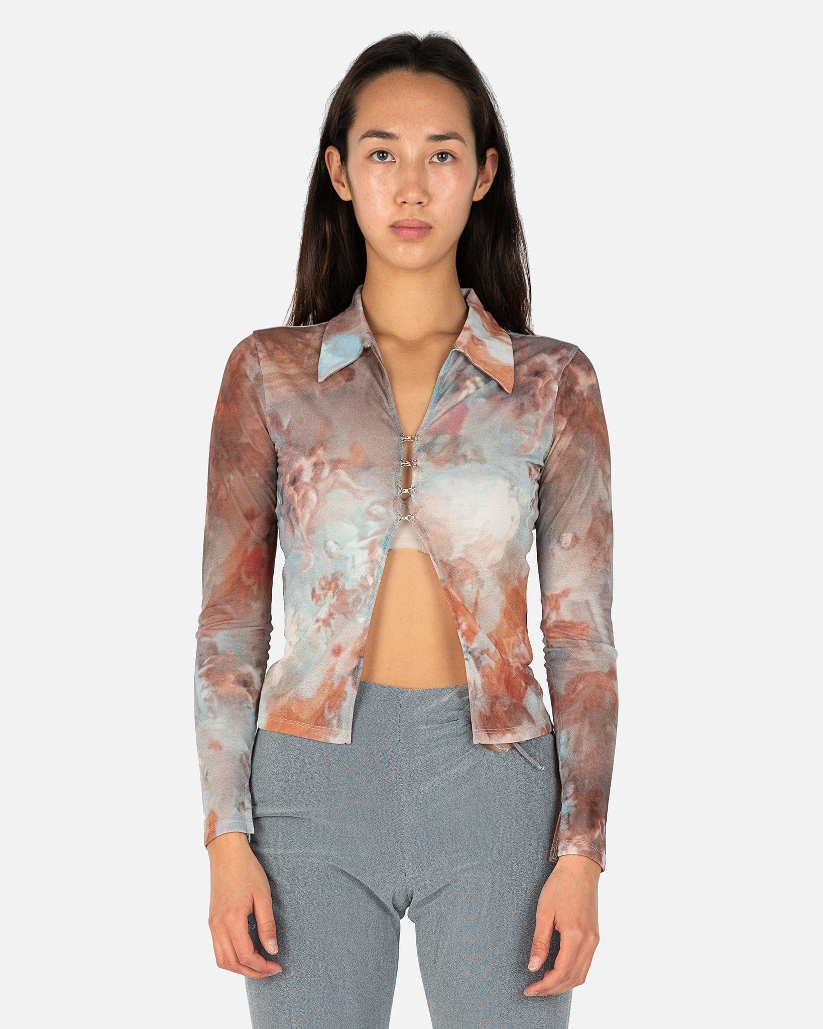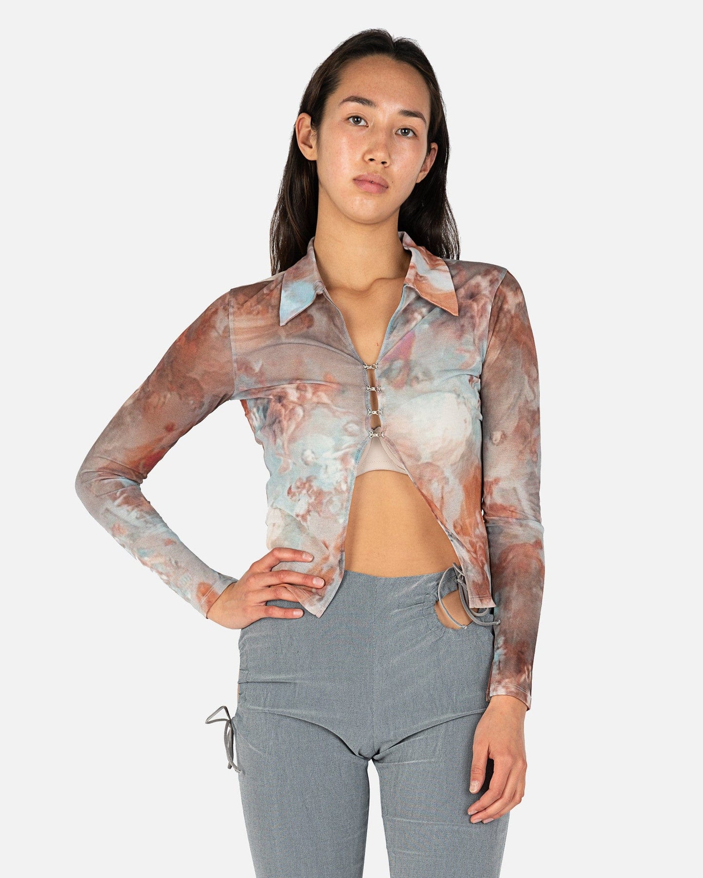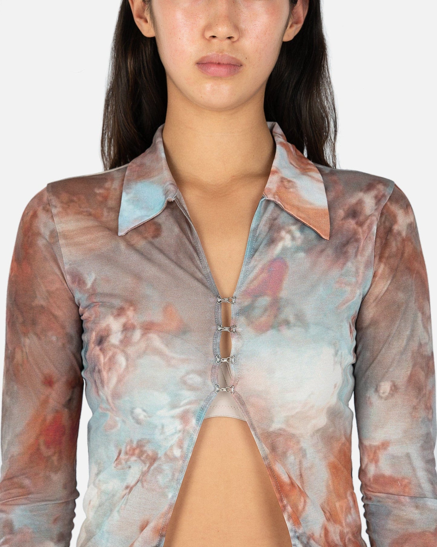 Paloma Wool women's sheer angel print shirt. This top has a spread collar and hook closure along the front with the bottom half of the body remaining open.