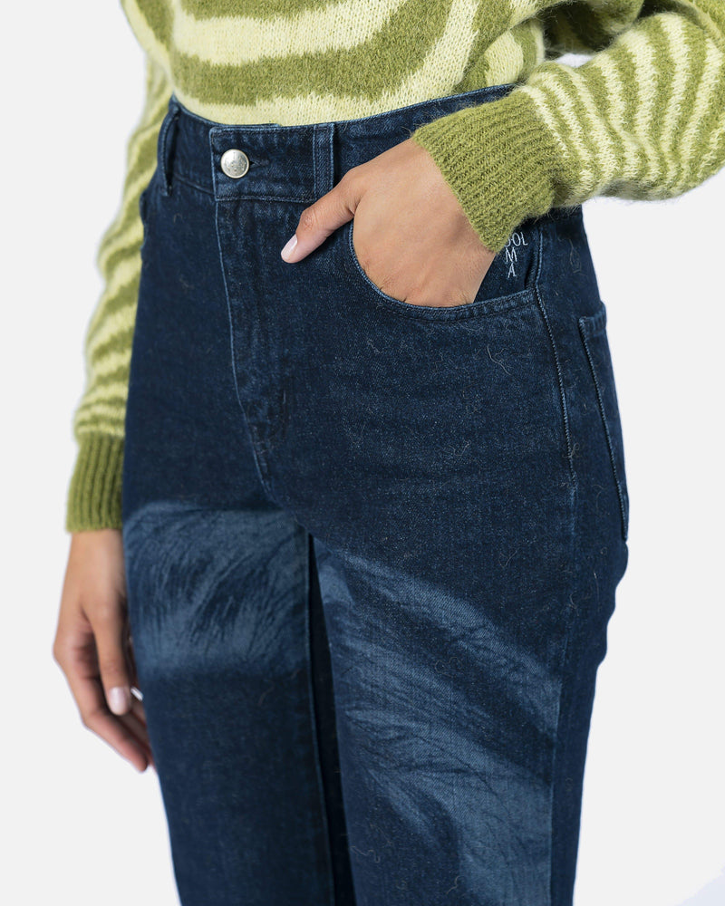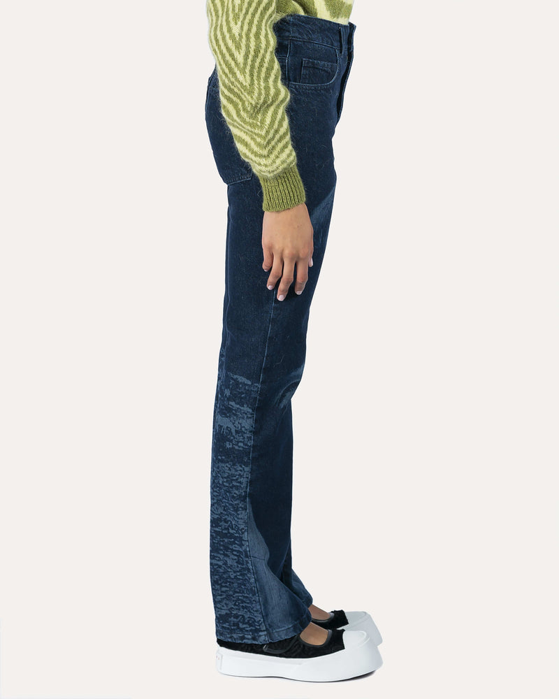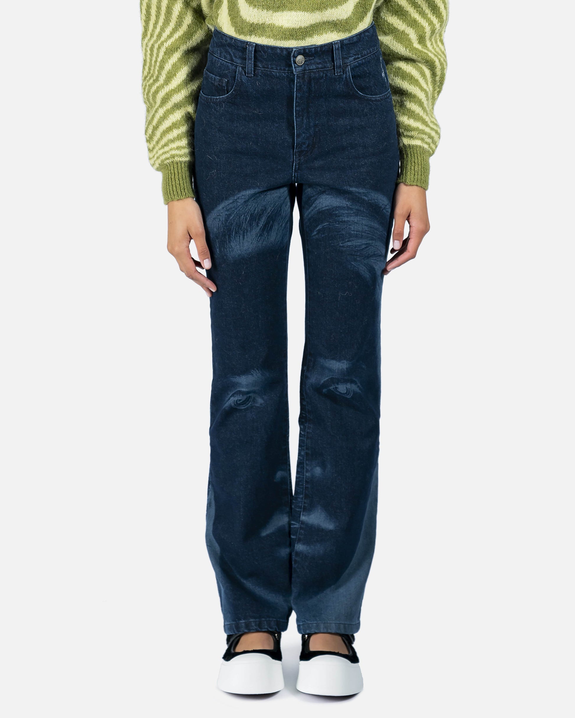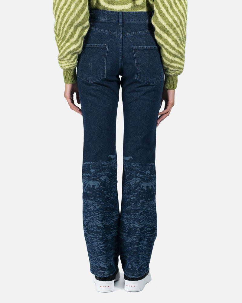 Five-pocket jeans with laser printed portrait of Vida Adamczewski in the front and images of horses from the island of Menorca on the back.