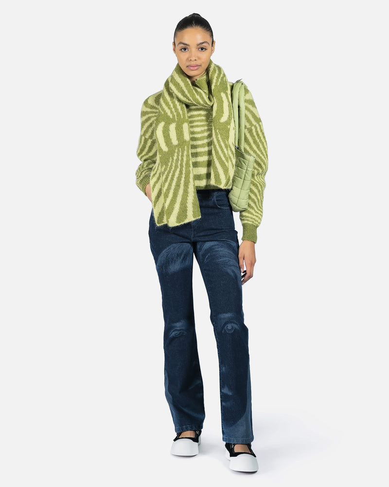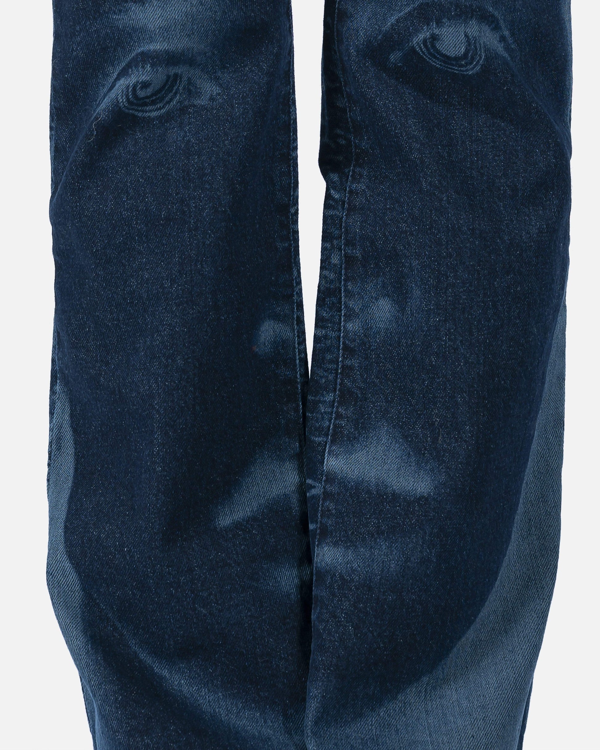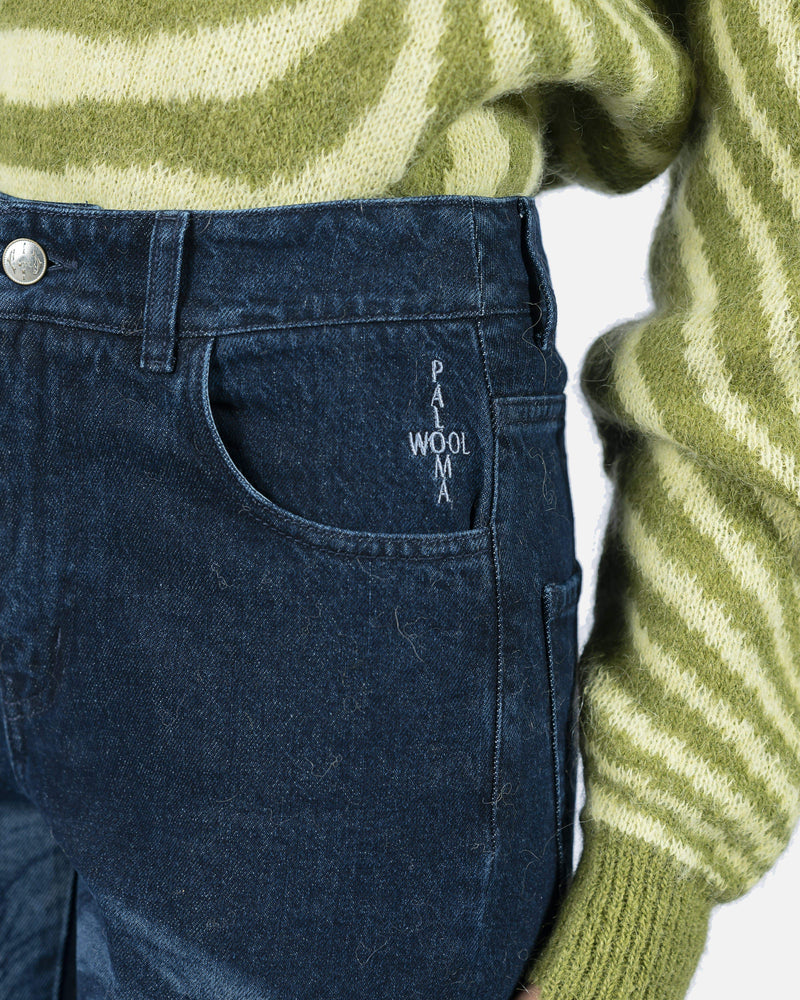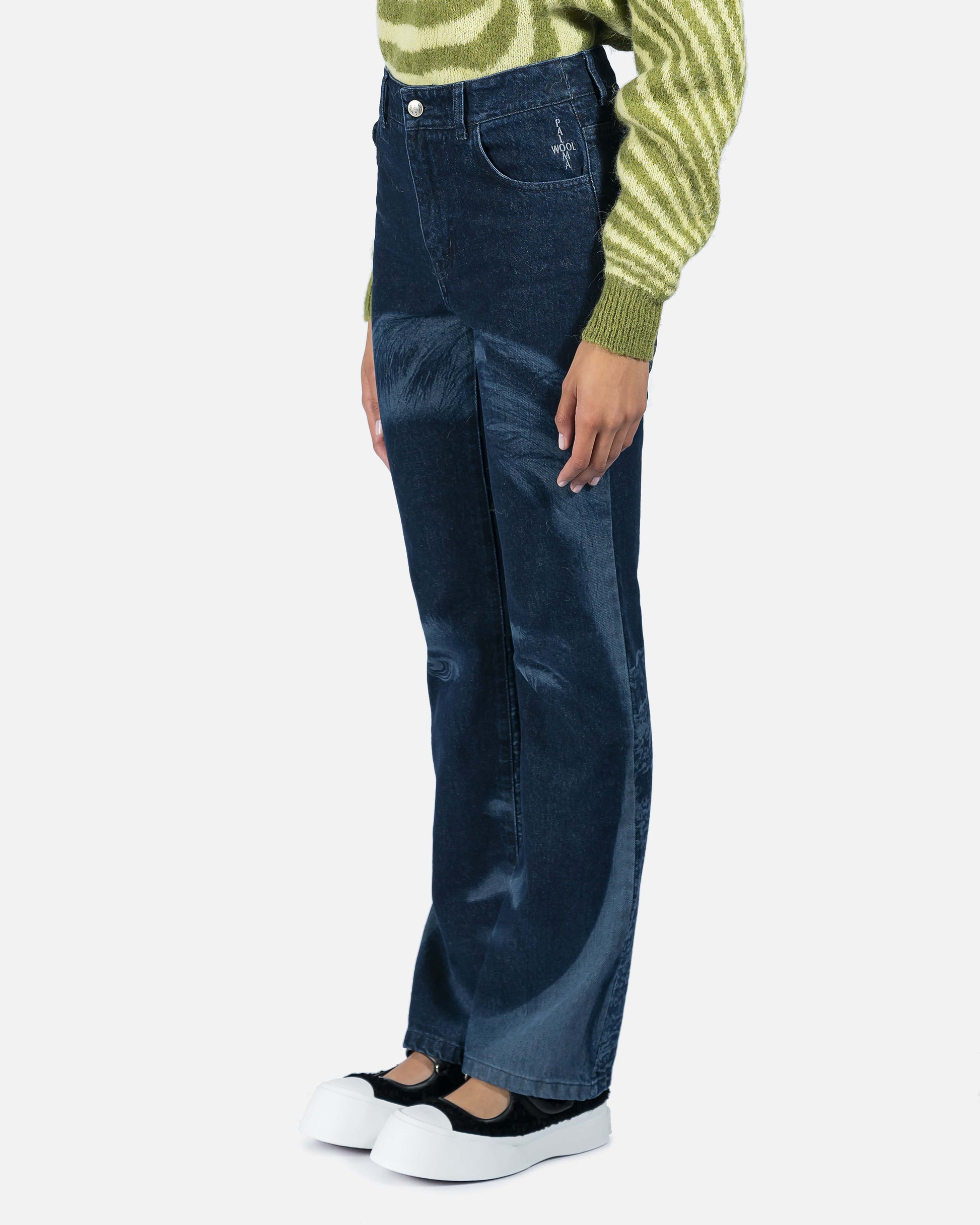 Five-pocket jeans with laser printed portrait of Vida Adamczewski in the front and images of horses from the island of Menorca on the back.