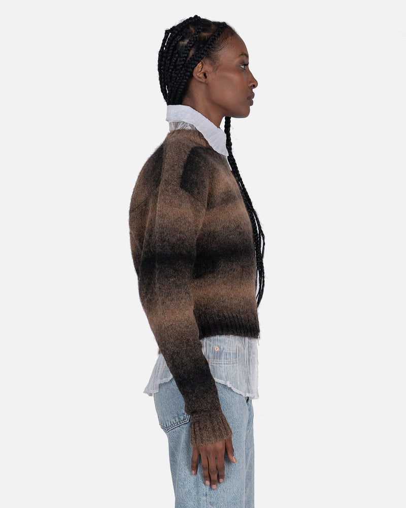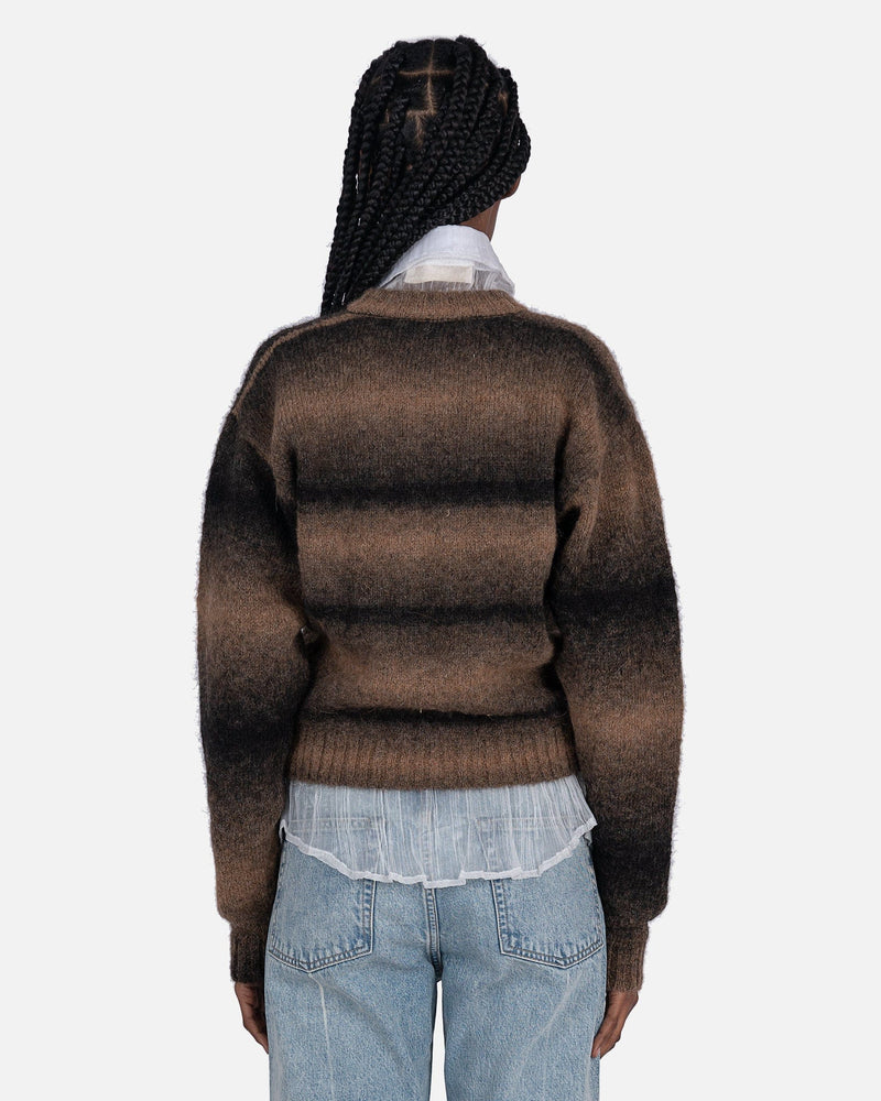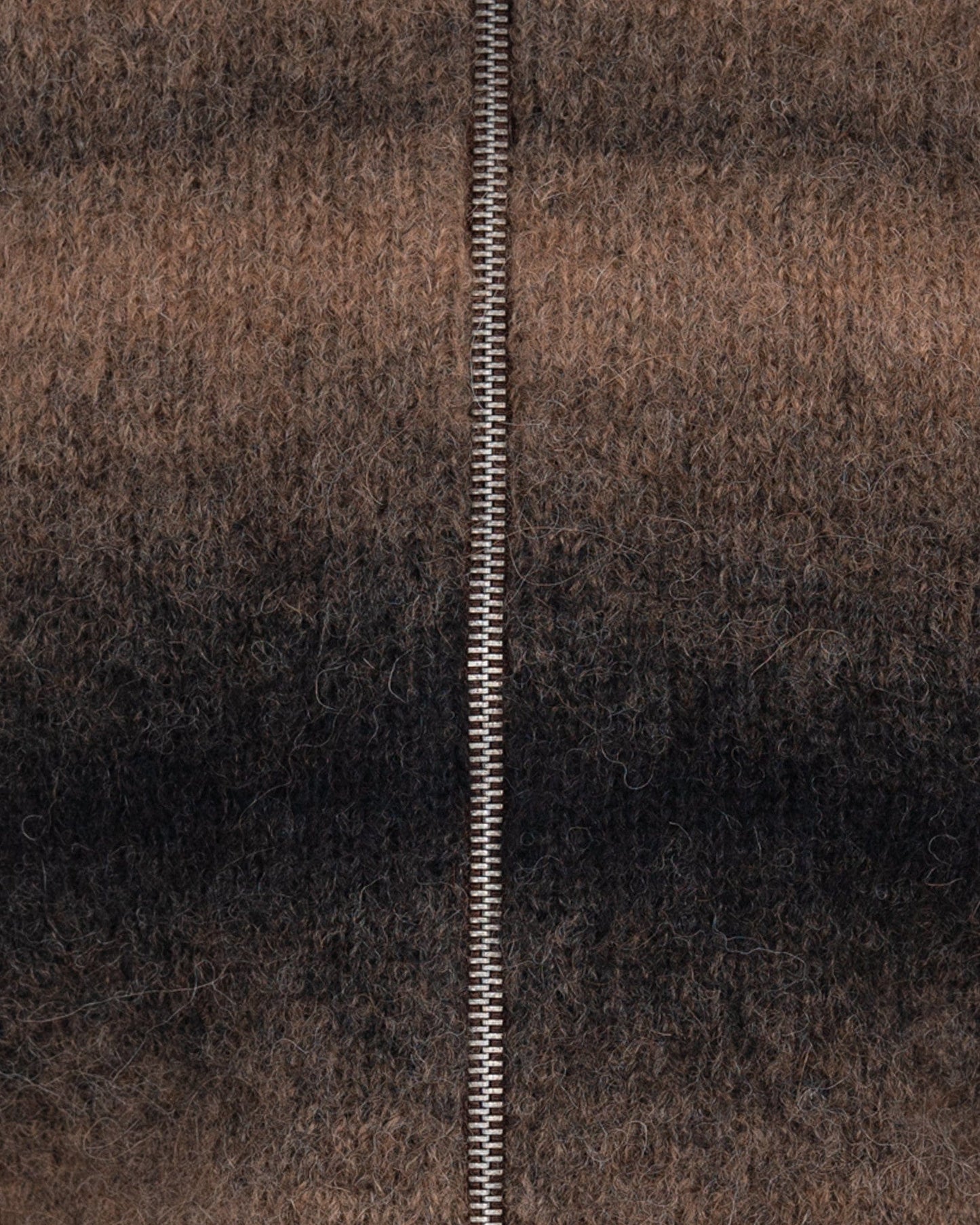 Paloma Wool women's zip up alpaca sweater in brown. This striped sweater has drop shoulders and silver hardware.