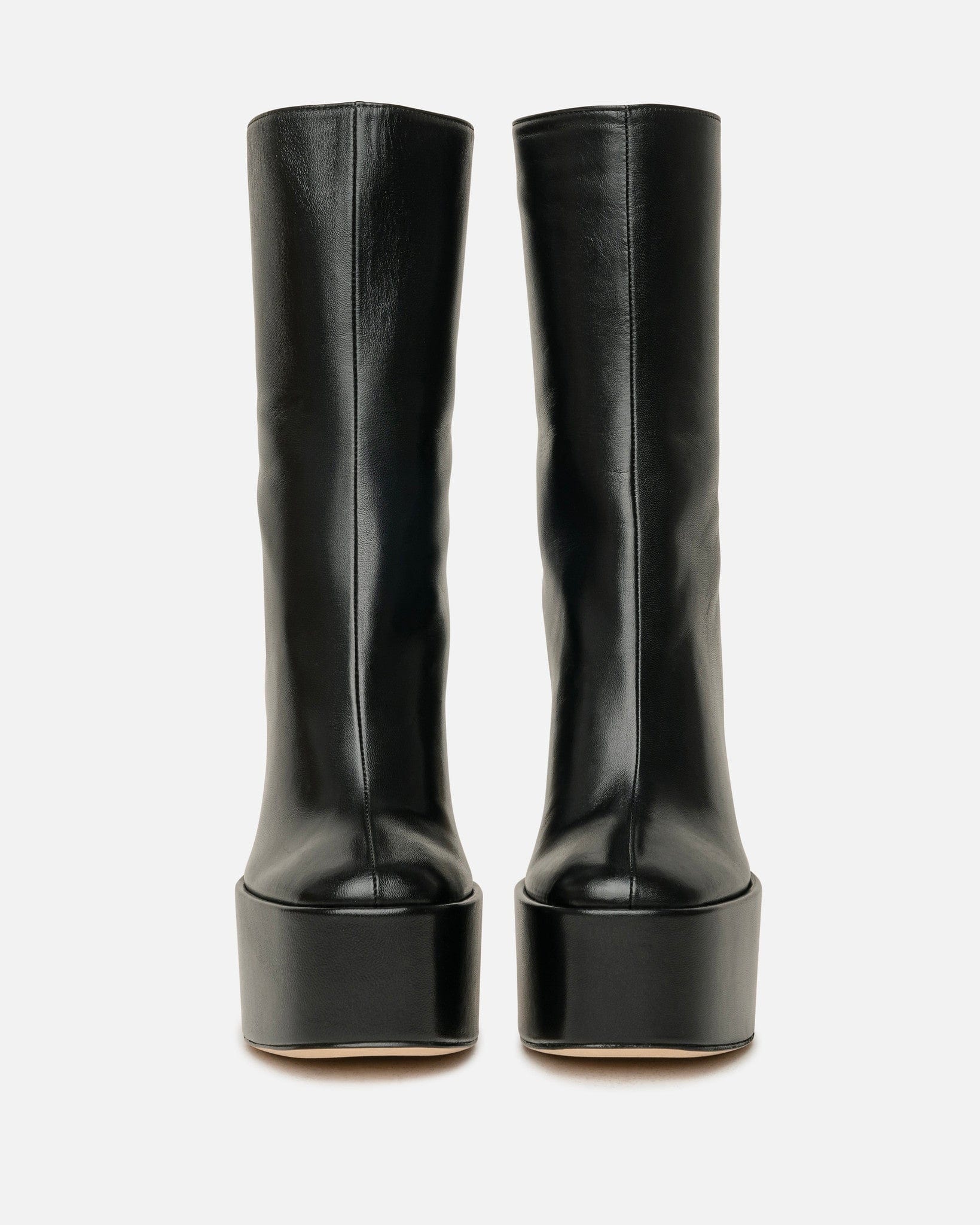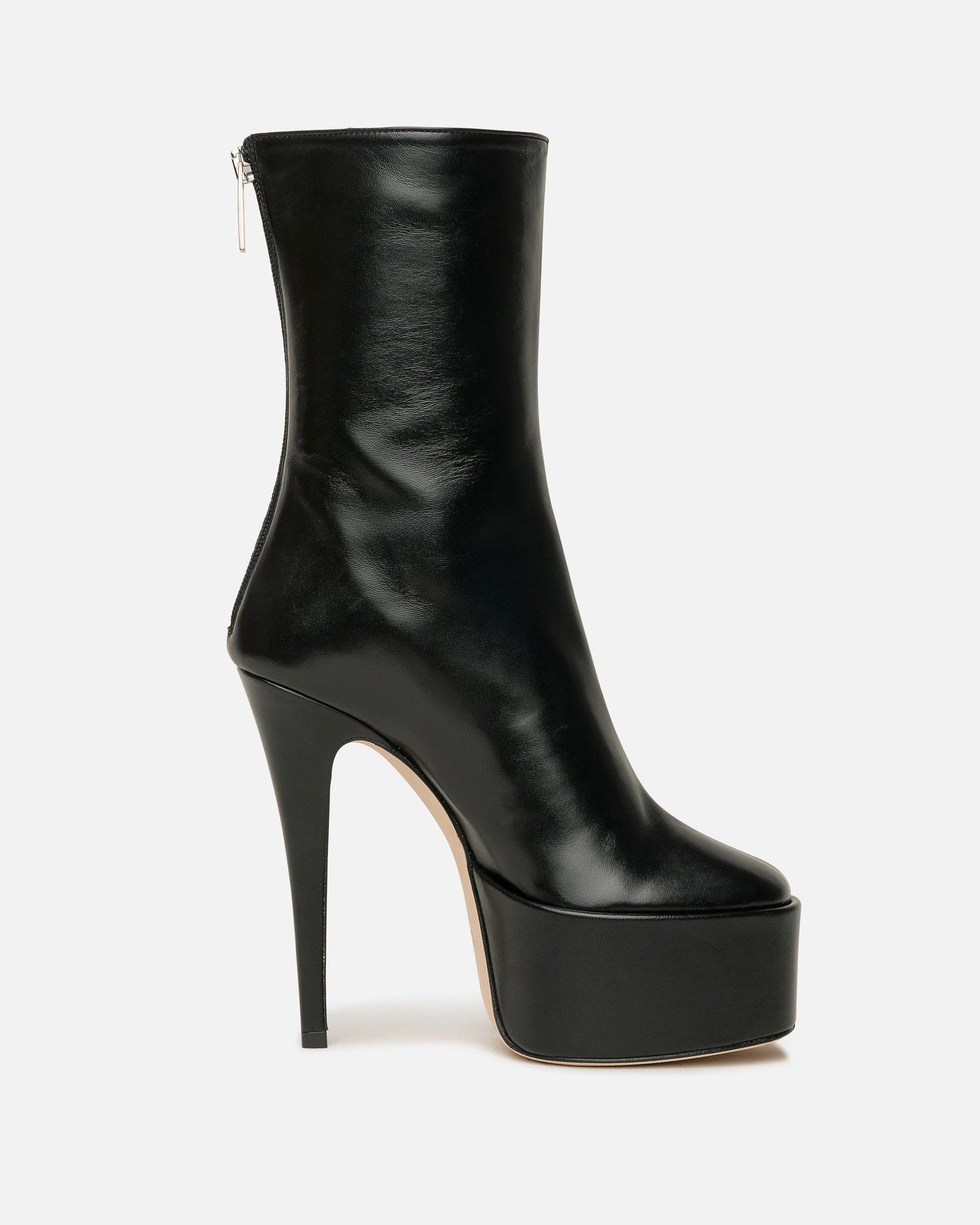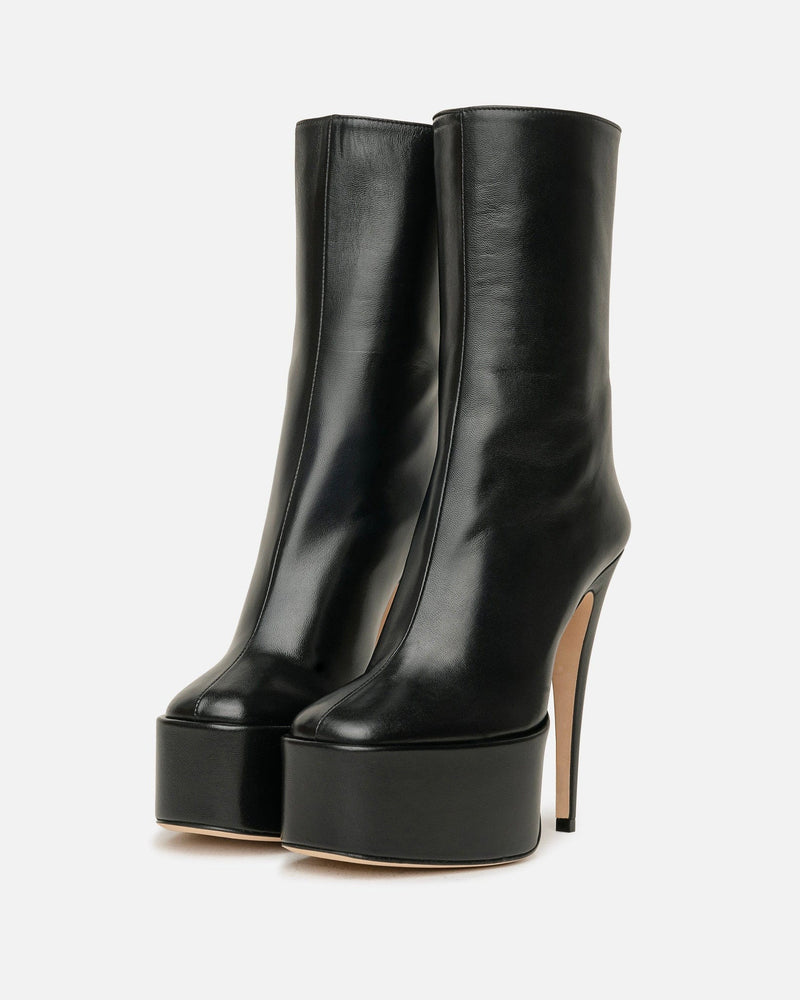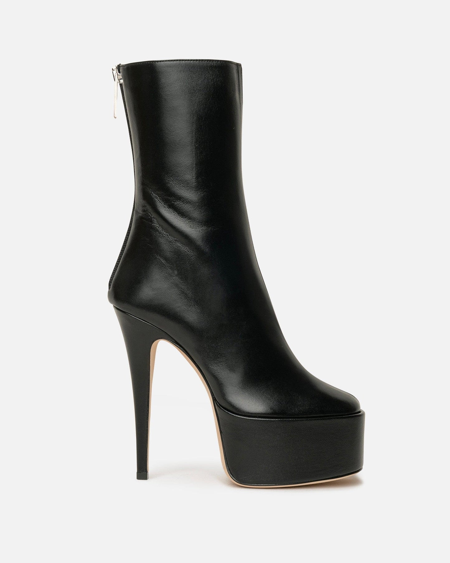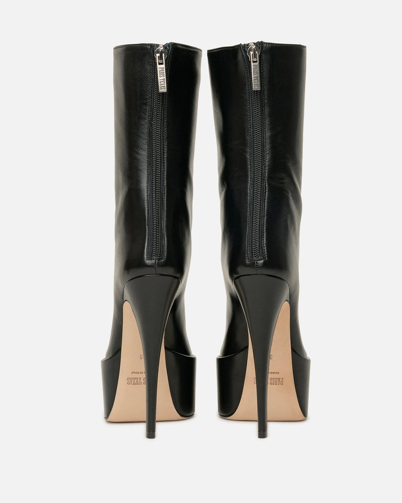 Paris Texas women's stiletto heel ankle boots in black. These boots feature a platform base and skinny, stiletto heel with back zip closure.
