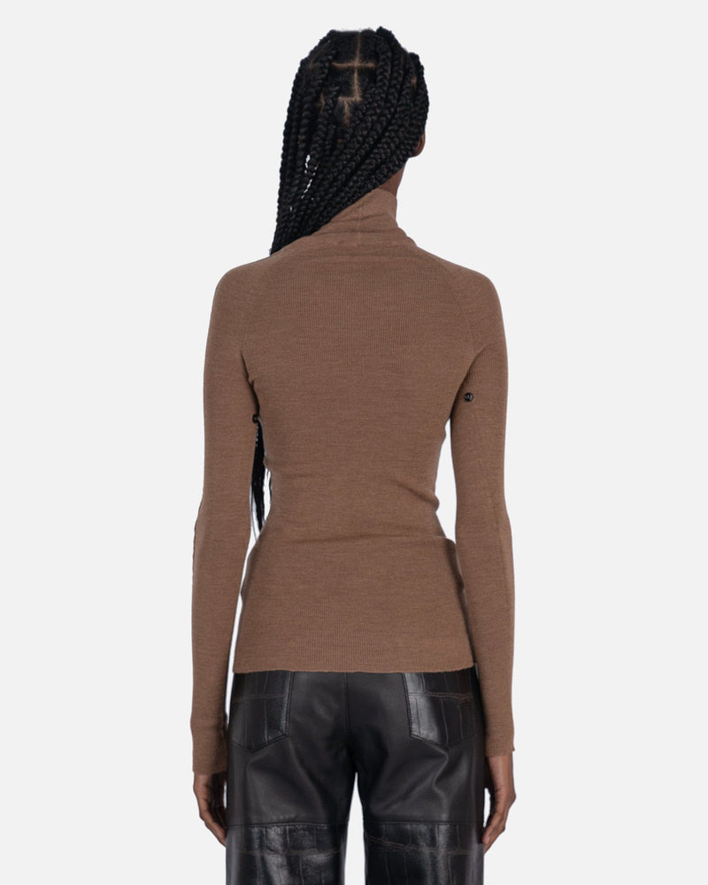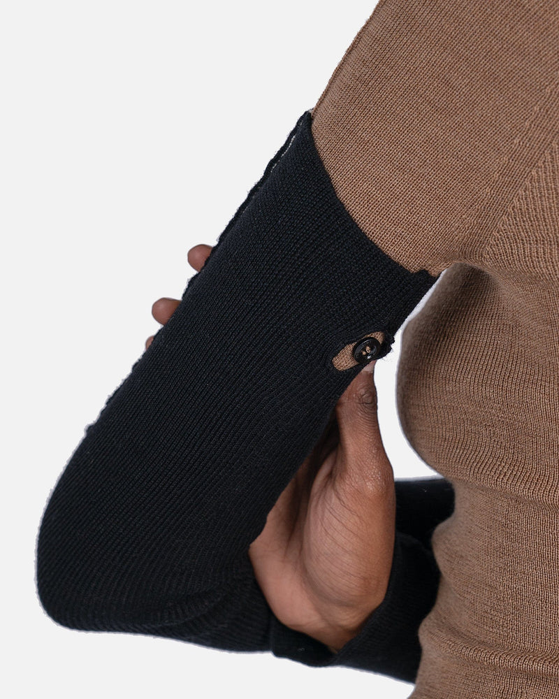 Peter Do women's combo-sleeve contrast sweater in camel and black. This sweater has a turtleneck and is slim fitted, clinging to the body. It has two detachable light grey long sleeves with thumb holes. The signature intarsia tattoo line runs down the left sleeve.