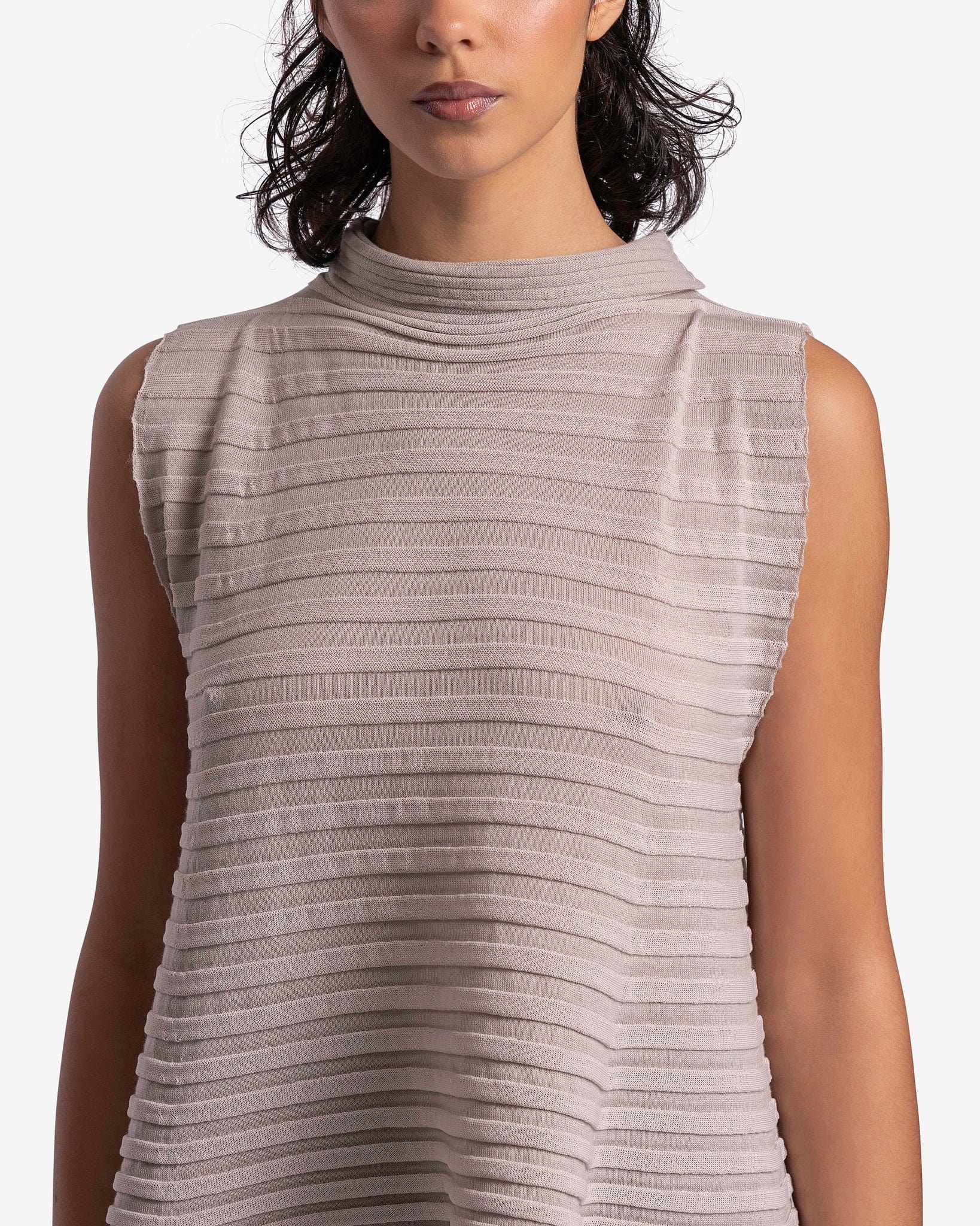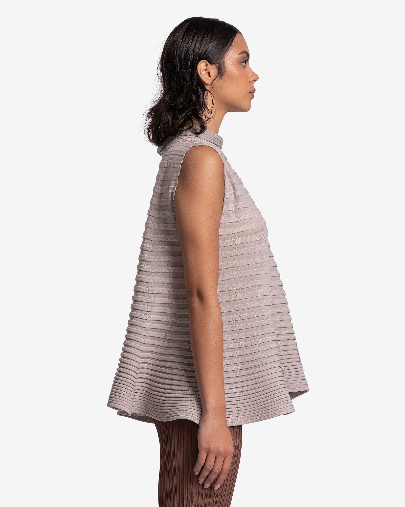Pleats Please Issey Miyake dimensional striped top in beige. This sleeveless top features a turtleneck and an a-line silhouette. There are stripes throughout the body that add dimension.