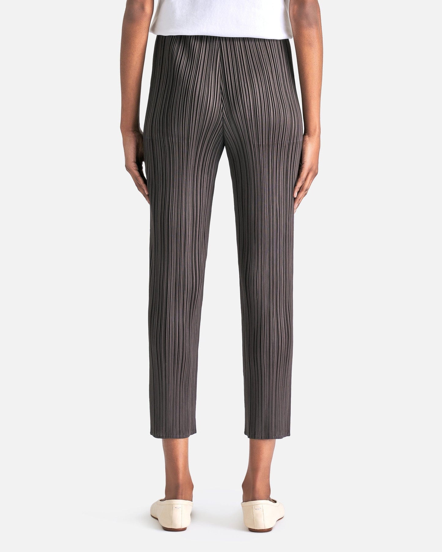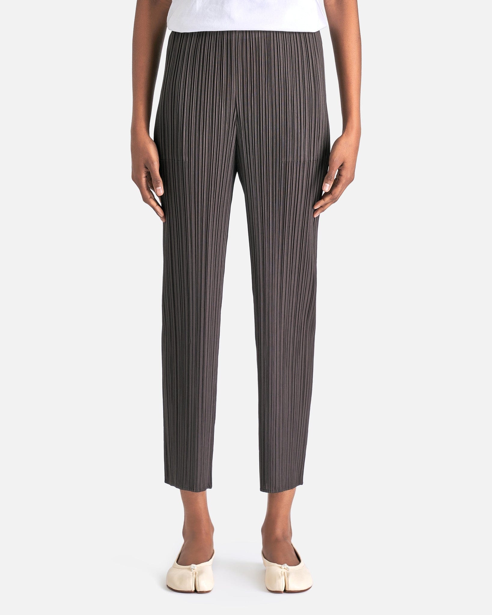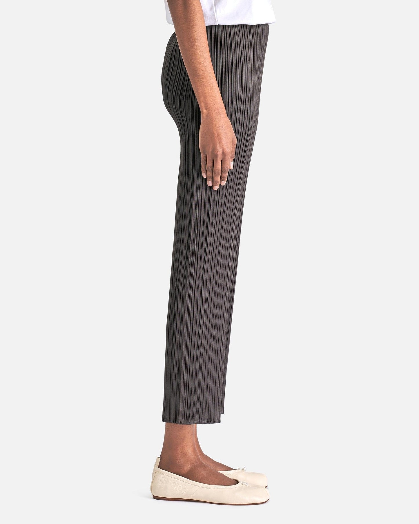 Pleats Please Issey Miyake MC January Pants in Charcoal Gray. These pants are pleated throughout and feature a slim fit, elasticated waistband and two side seam pockets.