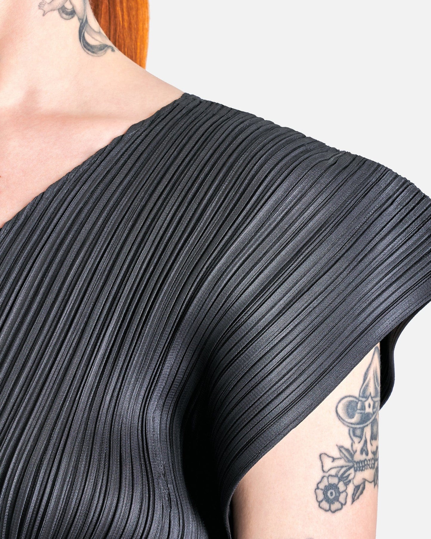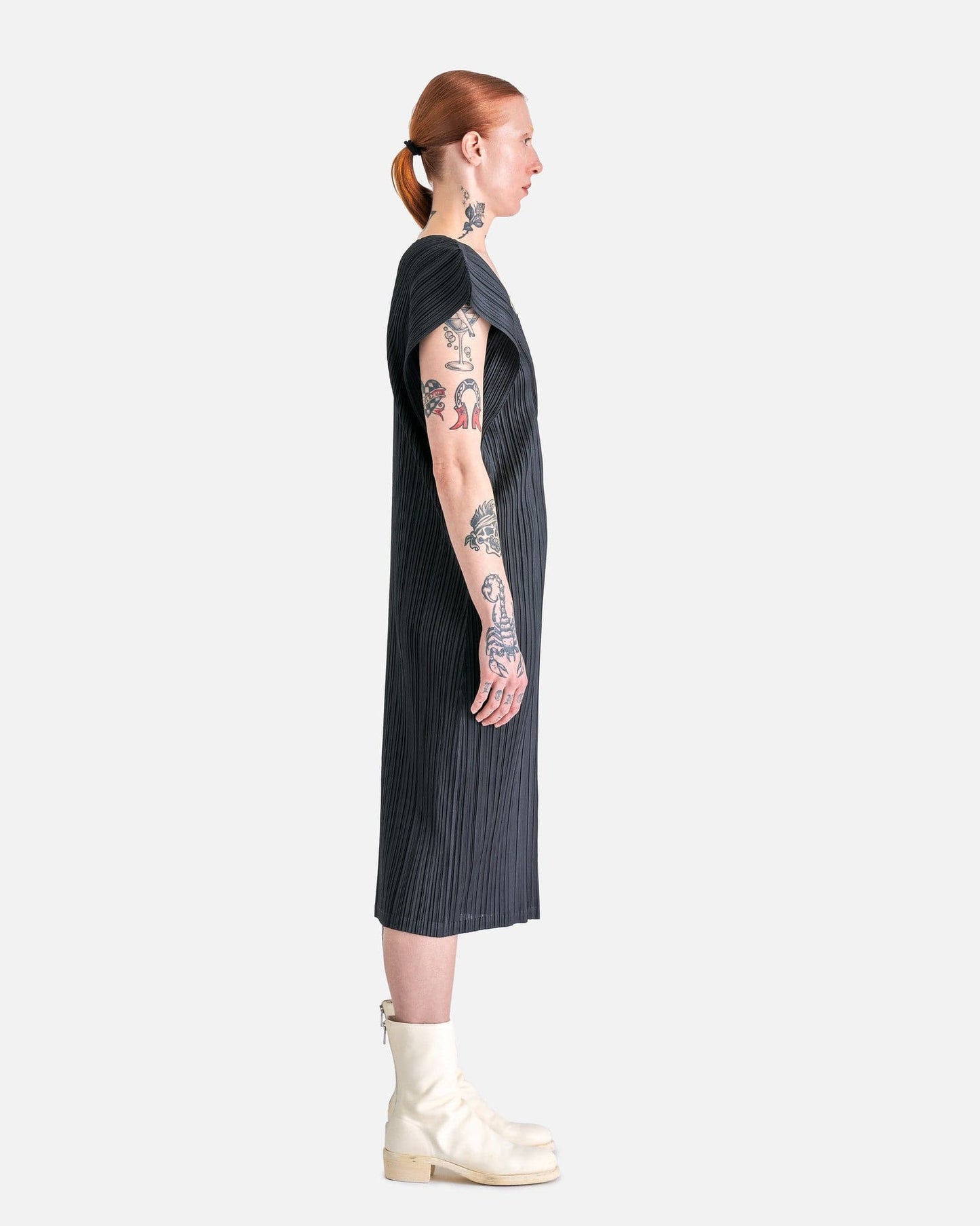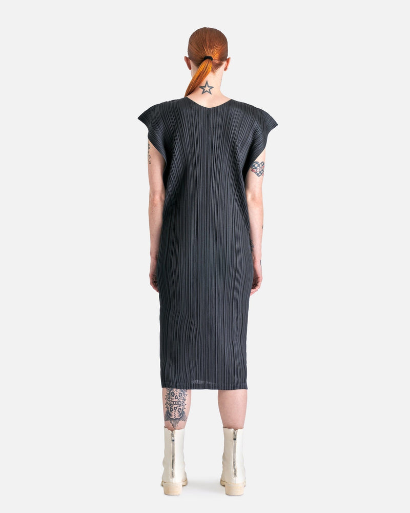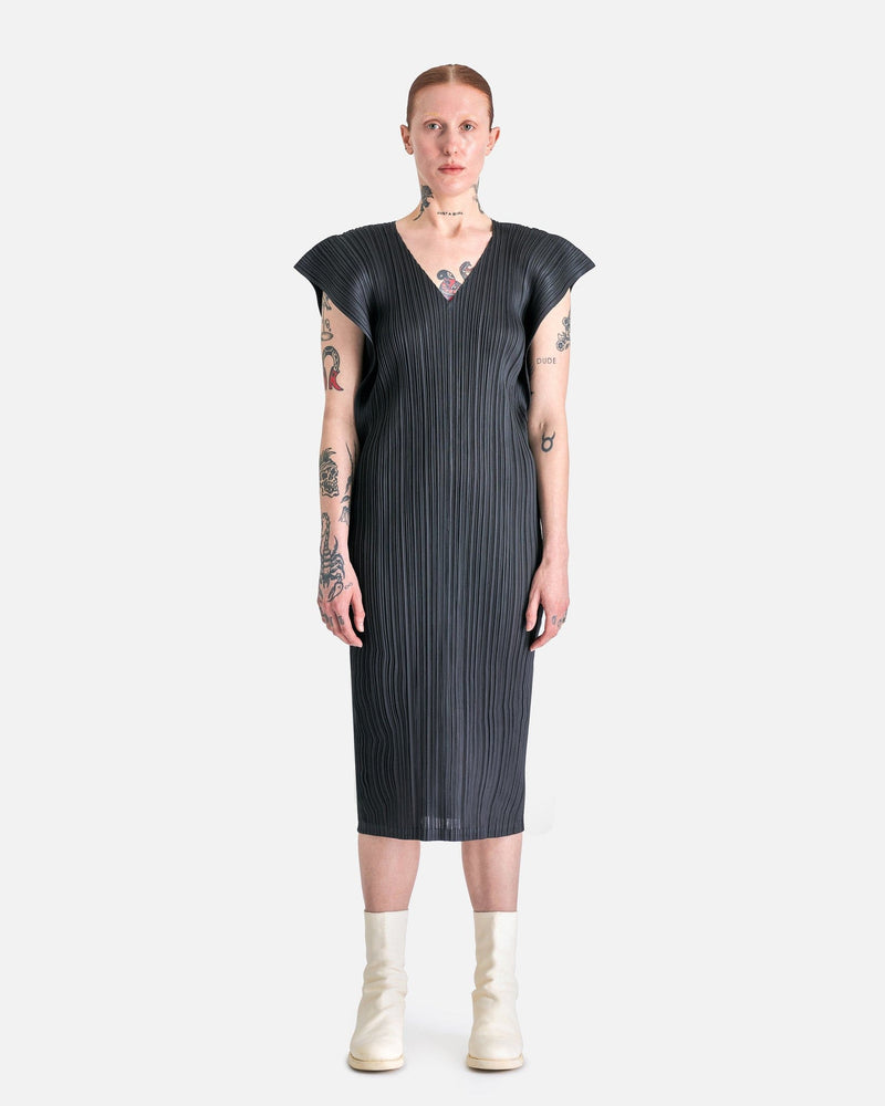 Pleats Please Issey Miyake MC March Dress in Charcoal. This dress features curved side gussets, pleats allover, v-neck, accentuated short sleeves and is below knee length.
