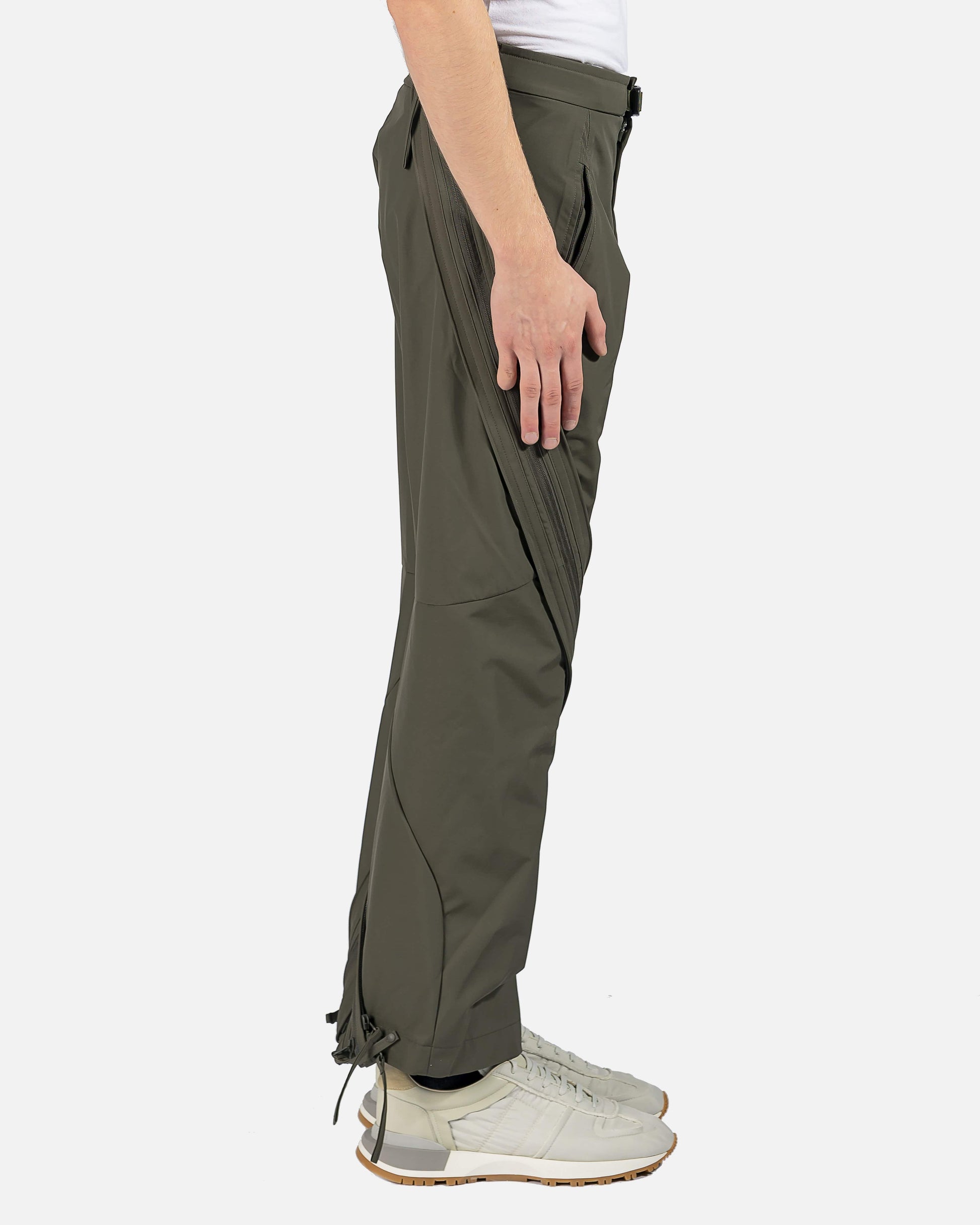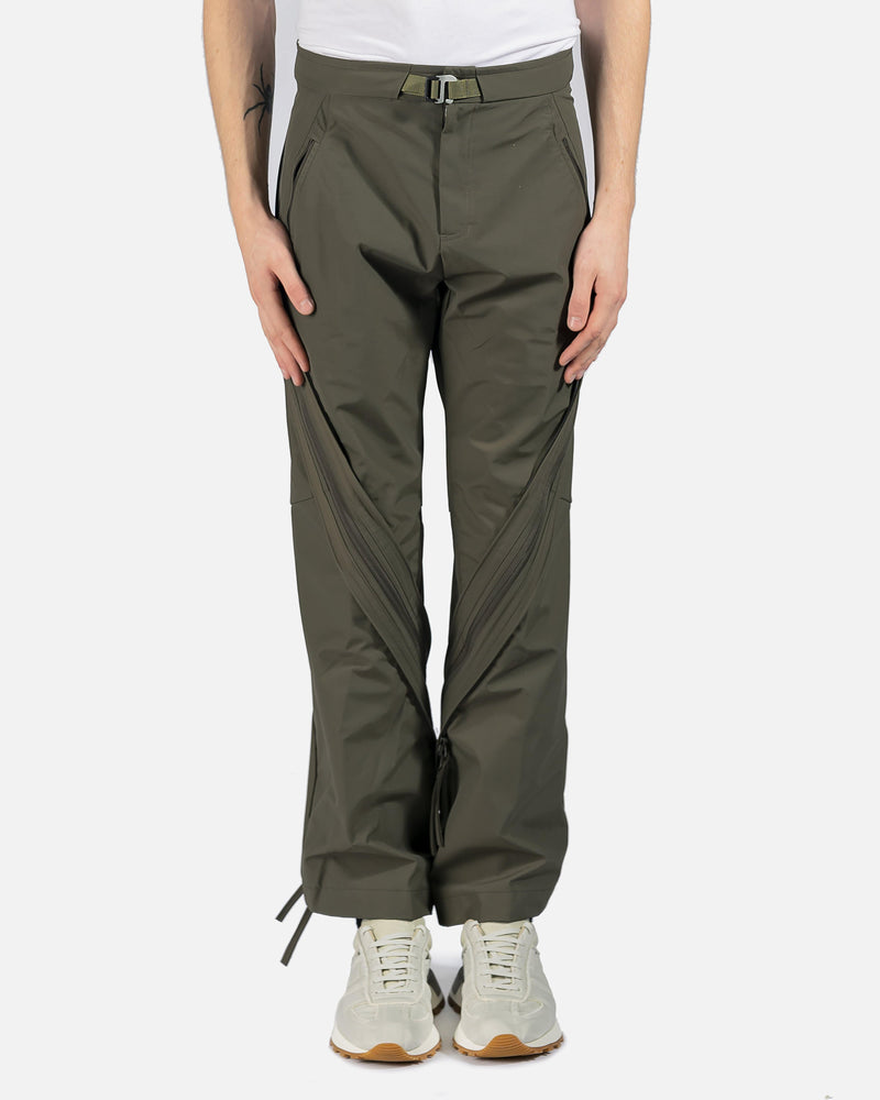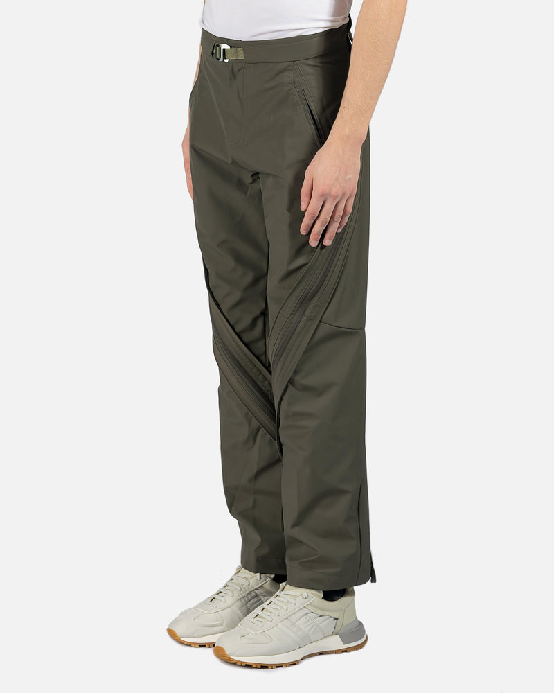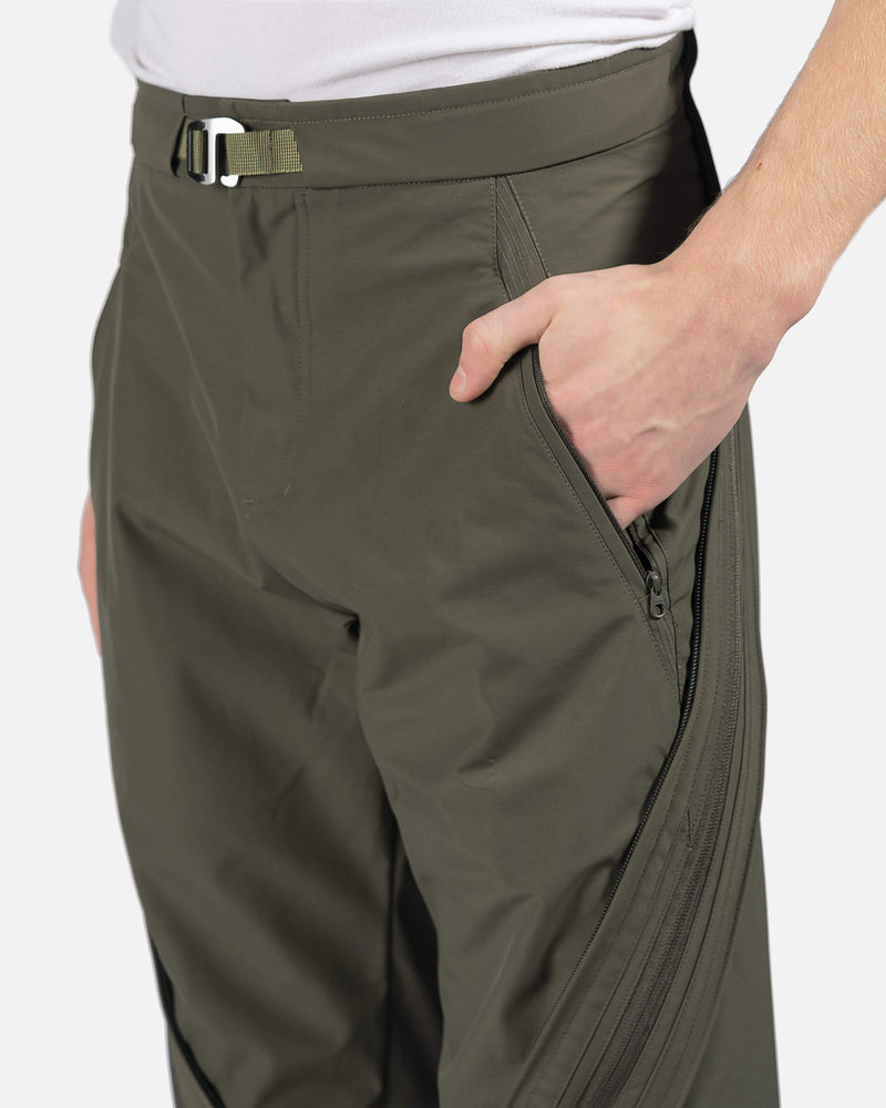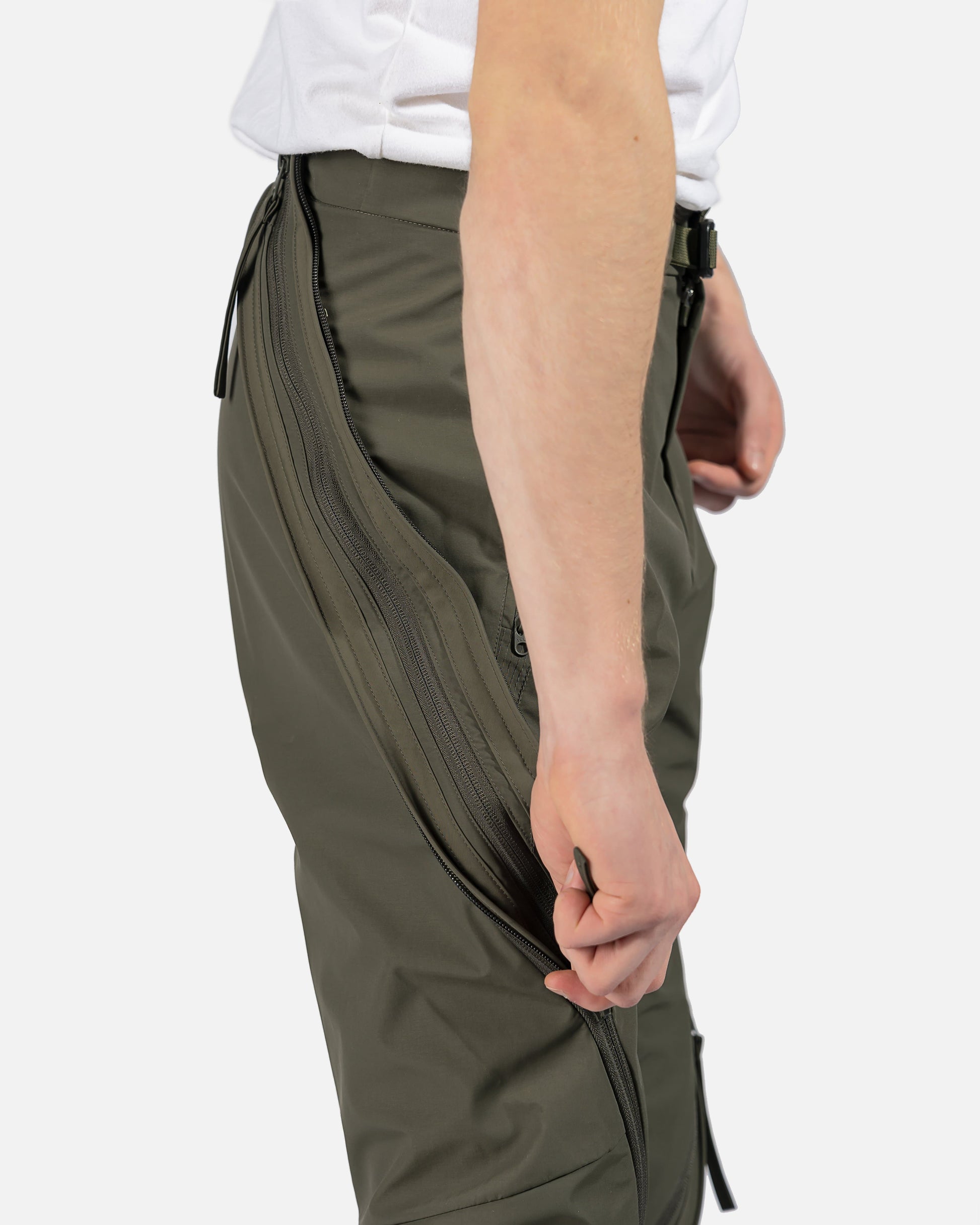Water resistant and breathable taslan 3-layer fabric with convertible and fittable YKK 2-way zipper detailing throughout the whole pants with spiral shape. Press-stud and adjustable webbing belt with G hook buckle and 2 zippered pockets at front.