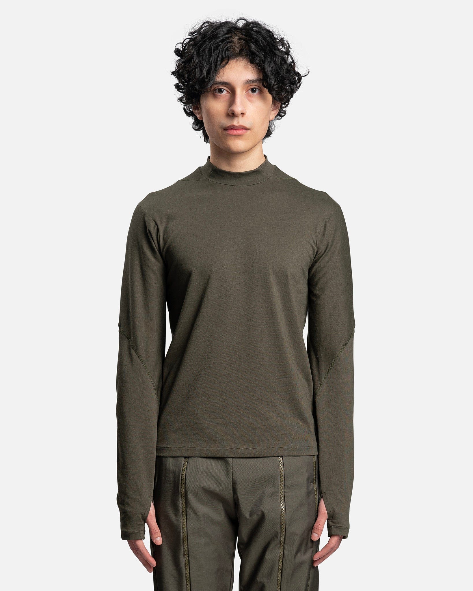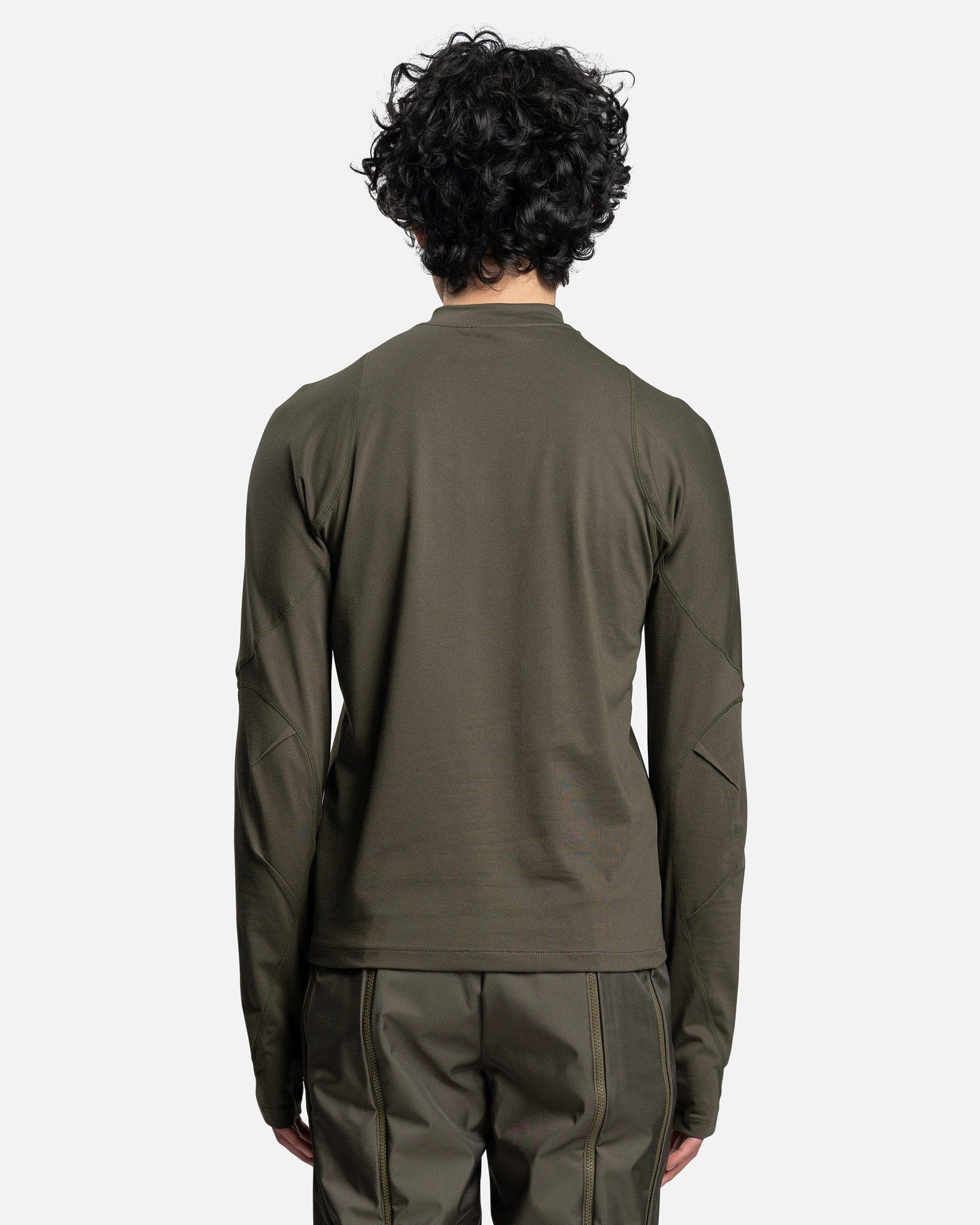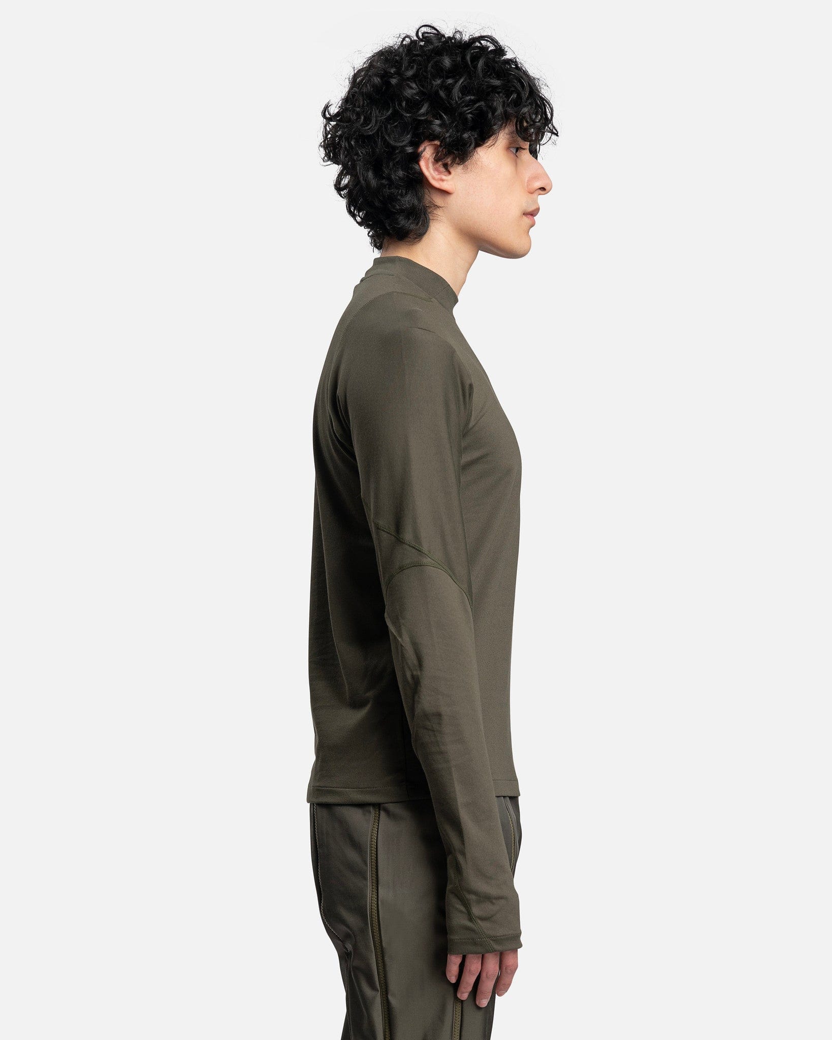 POST ARCHIVE FACTION (P.A.F) men's long sleeve shirt in olive green. This shirt features coverstitch line details and dart details on the sleeve.