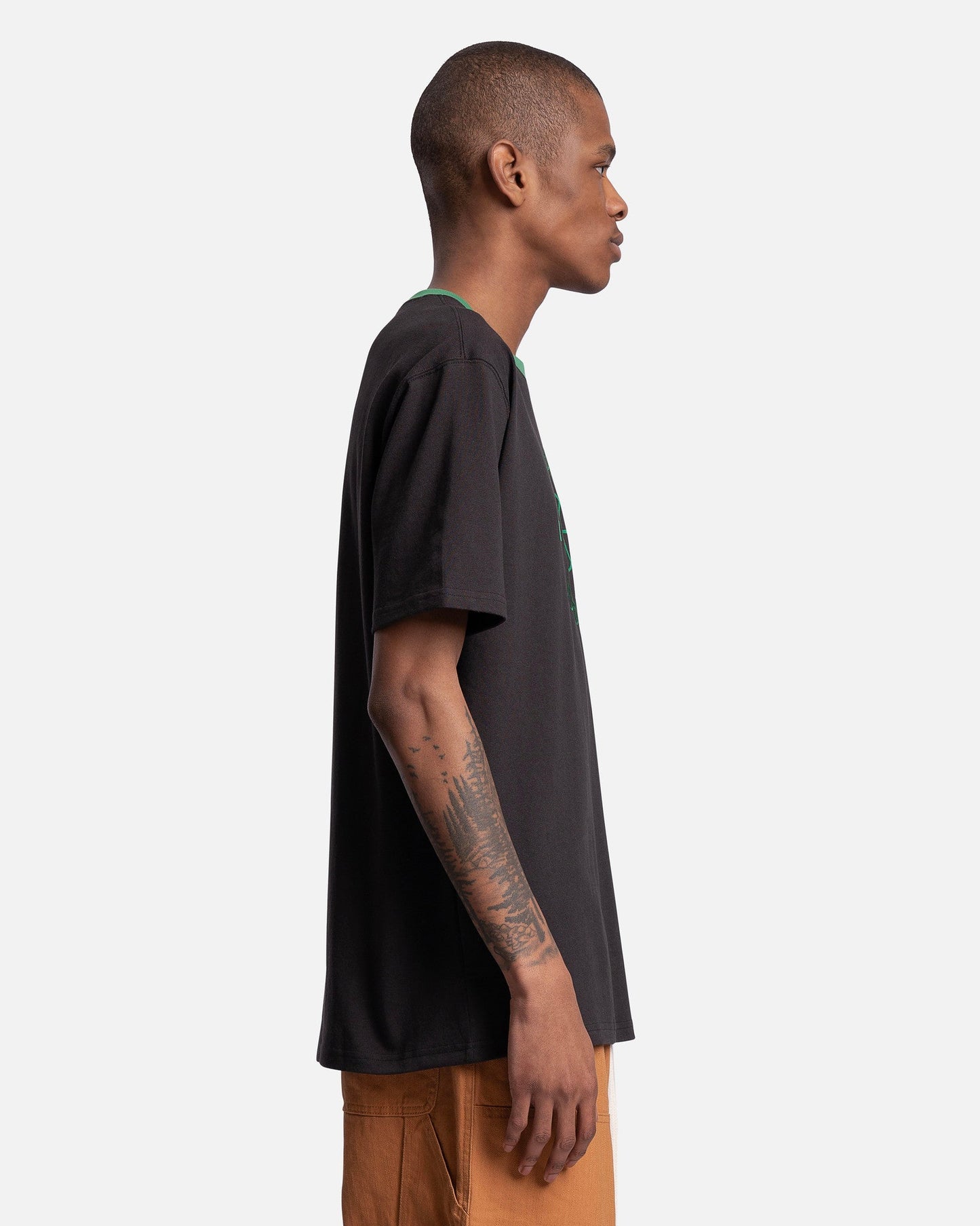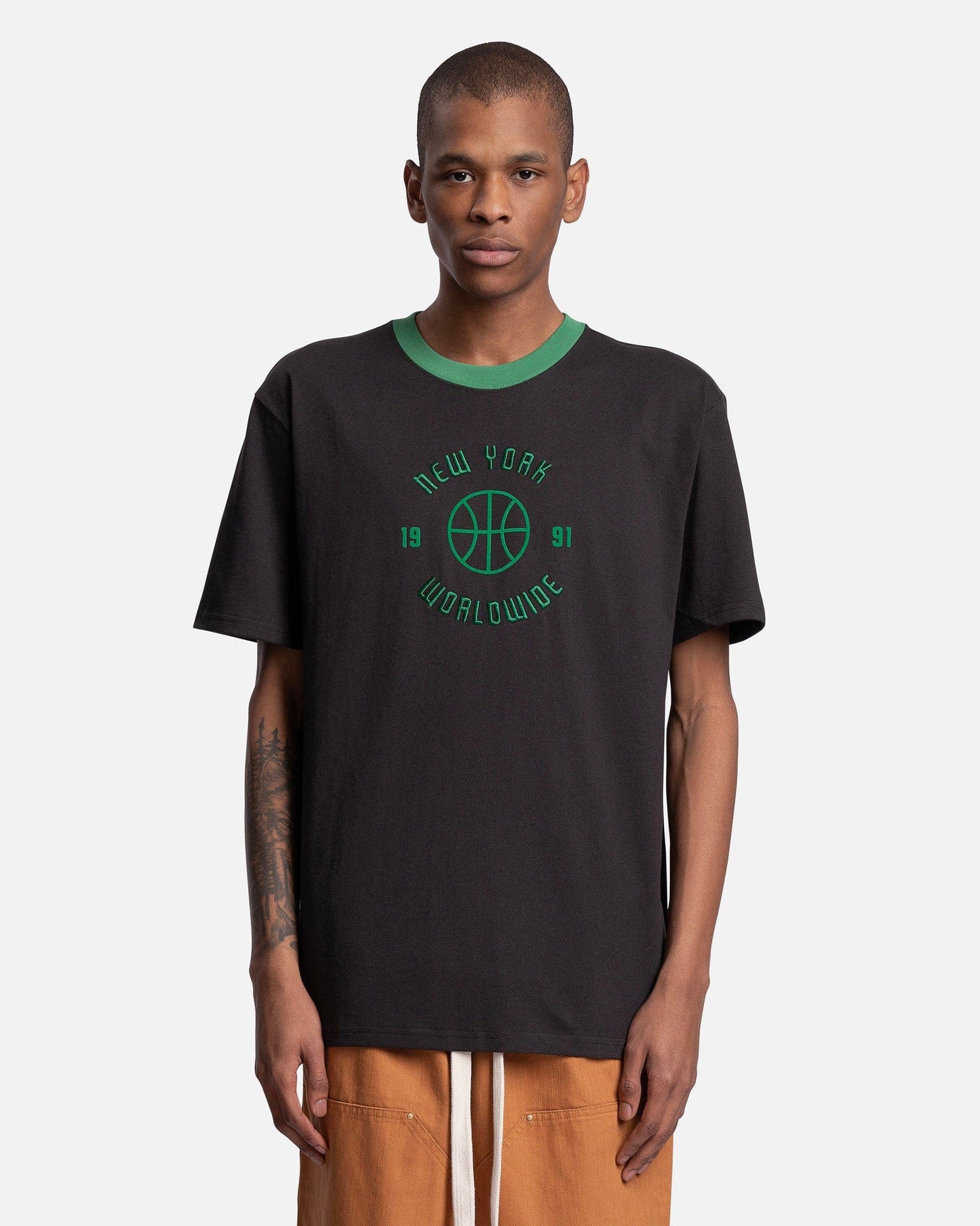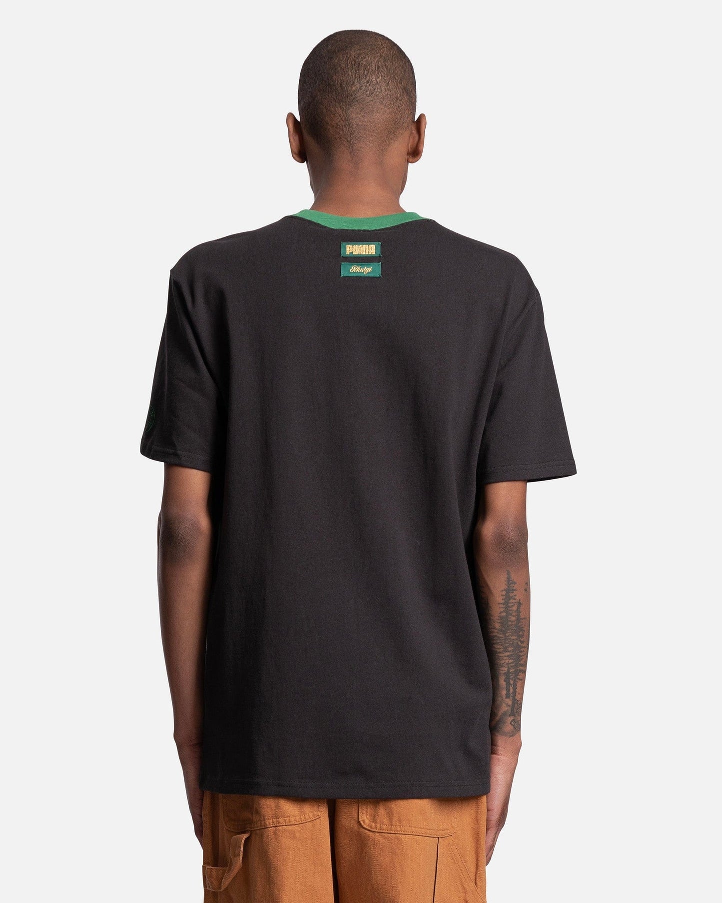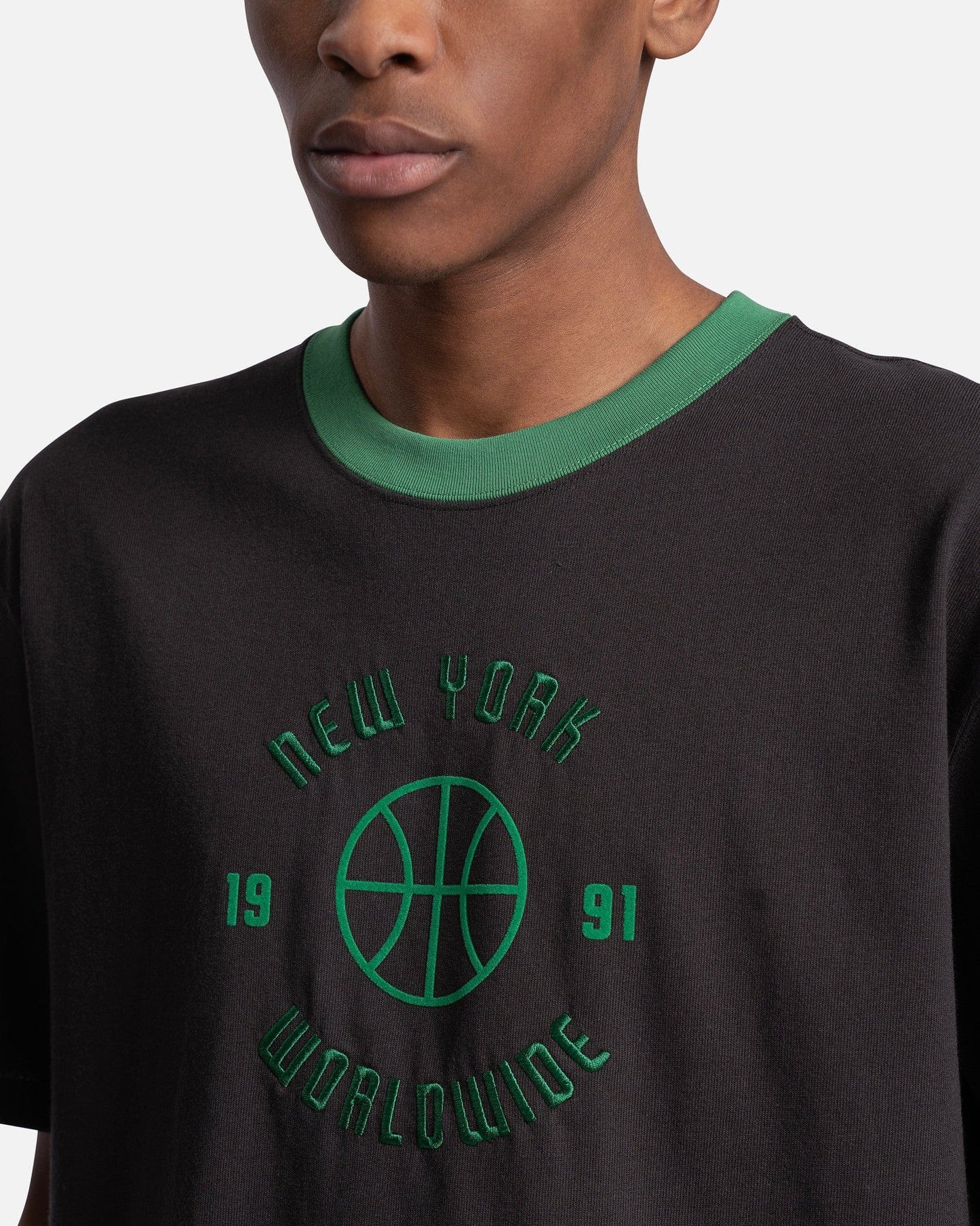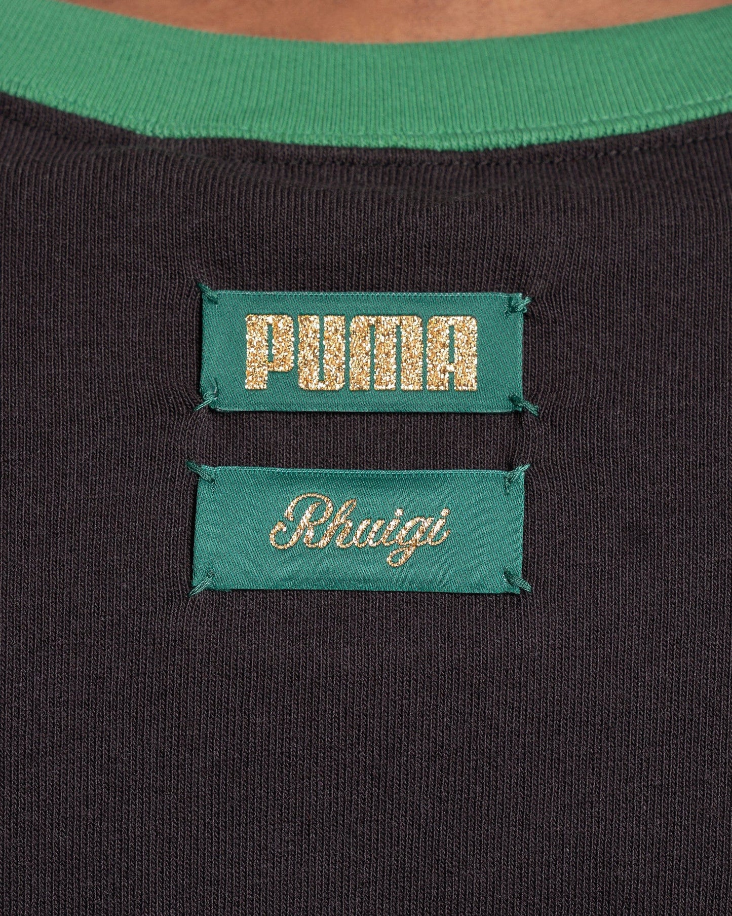 Puma x Rhuigi men's graphic t-shirt in black and green. This shirt features a crew neckline and an embroidered graphic on the front that reads "NEW YORK WORLDWIDE" with a basketball in the center.