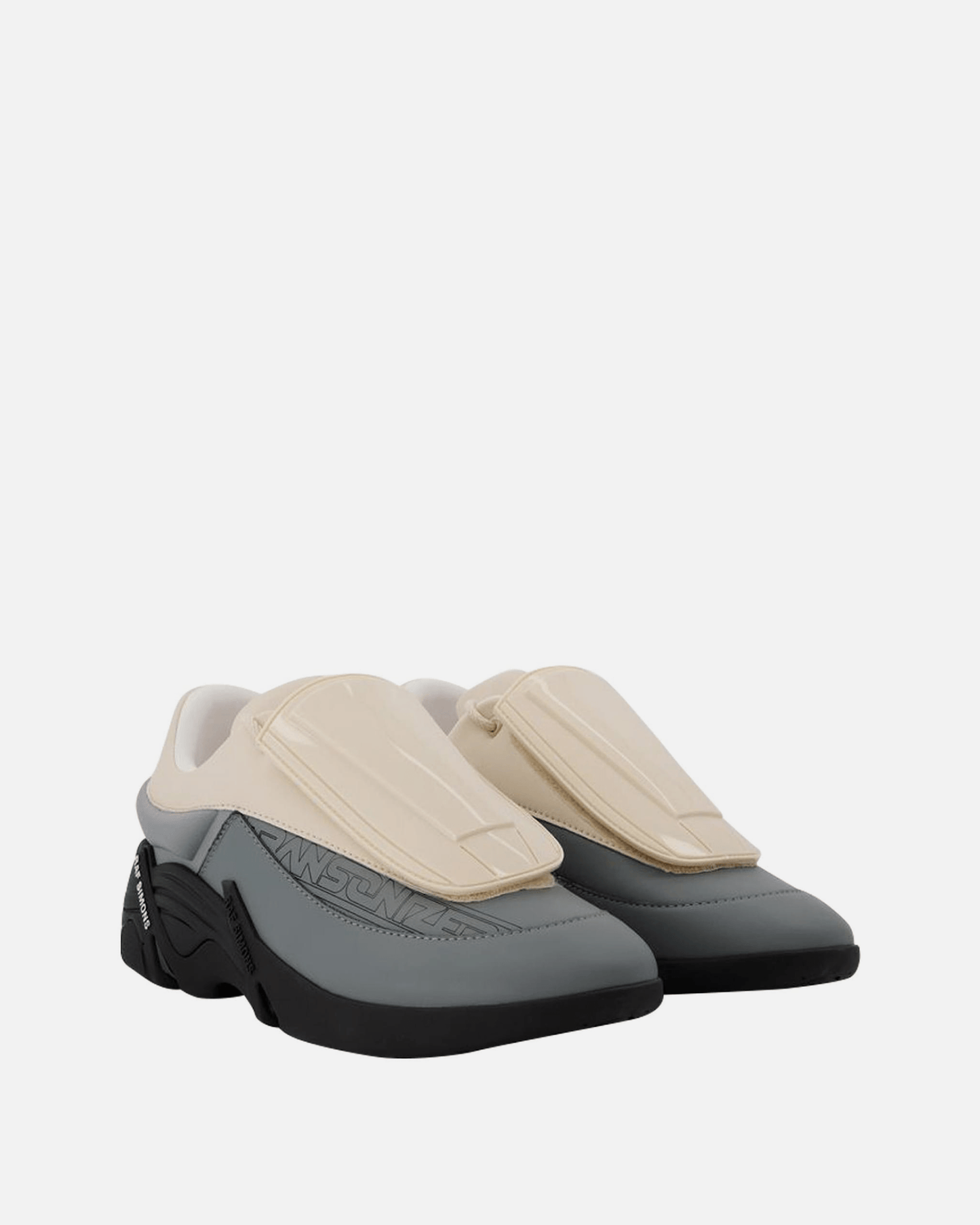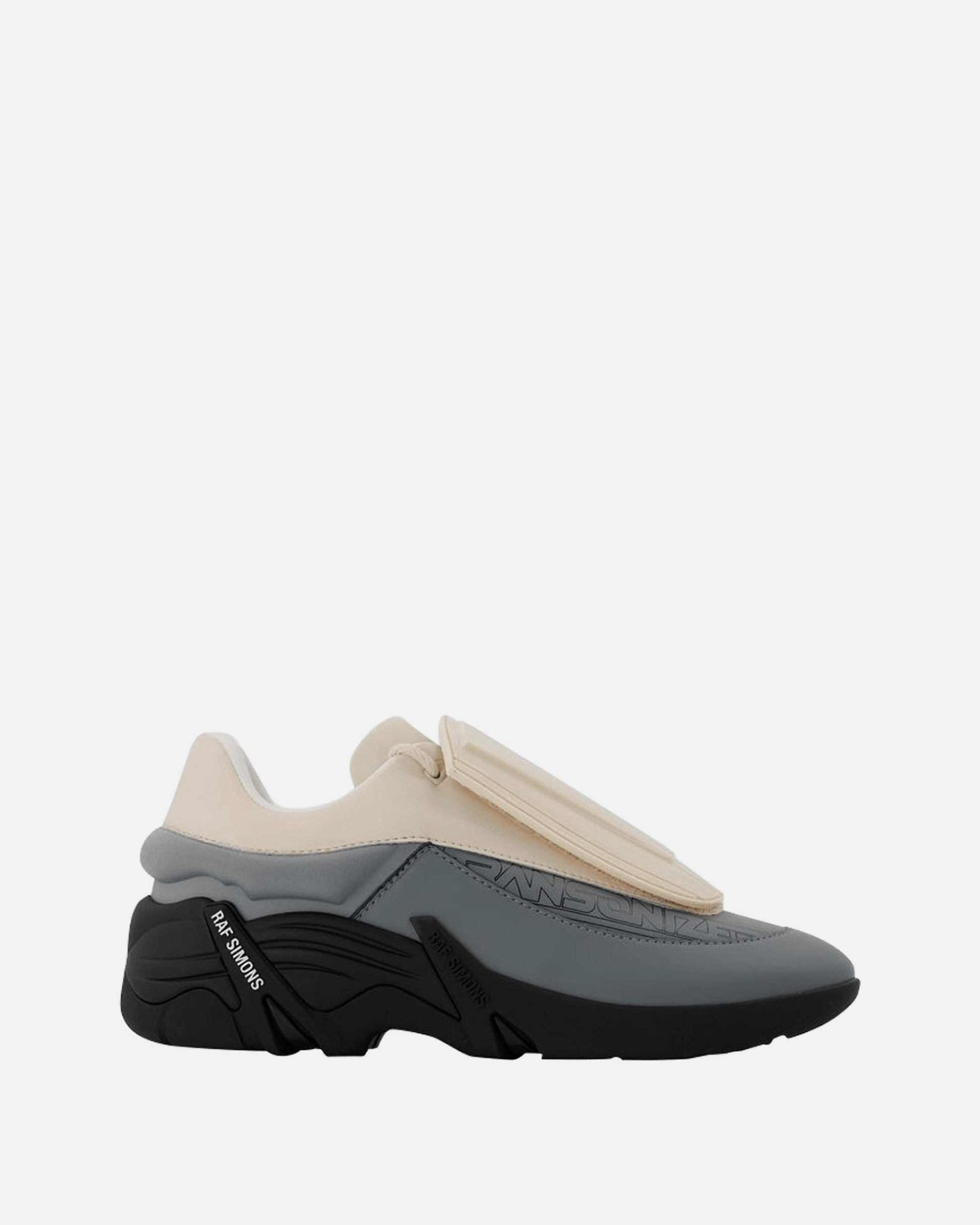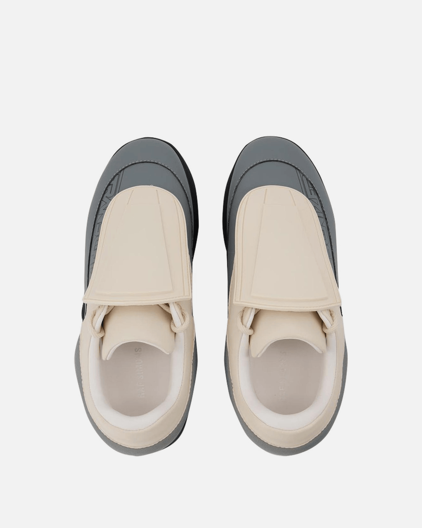 Raf Simons men's two toned sneakers in cream and grey. These sneakers have a textile upper and lining, with a detachable vamp and concealed front lace closure.