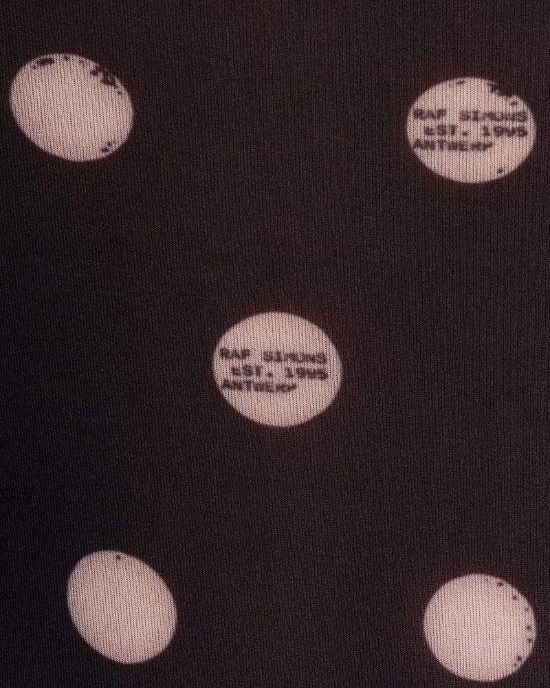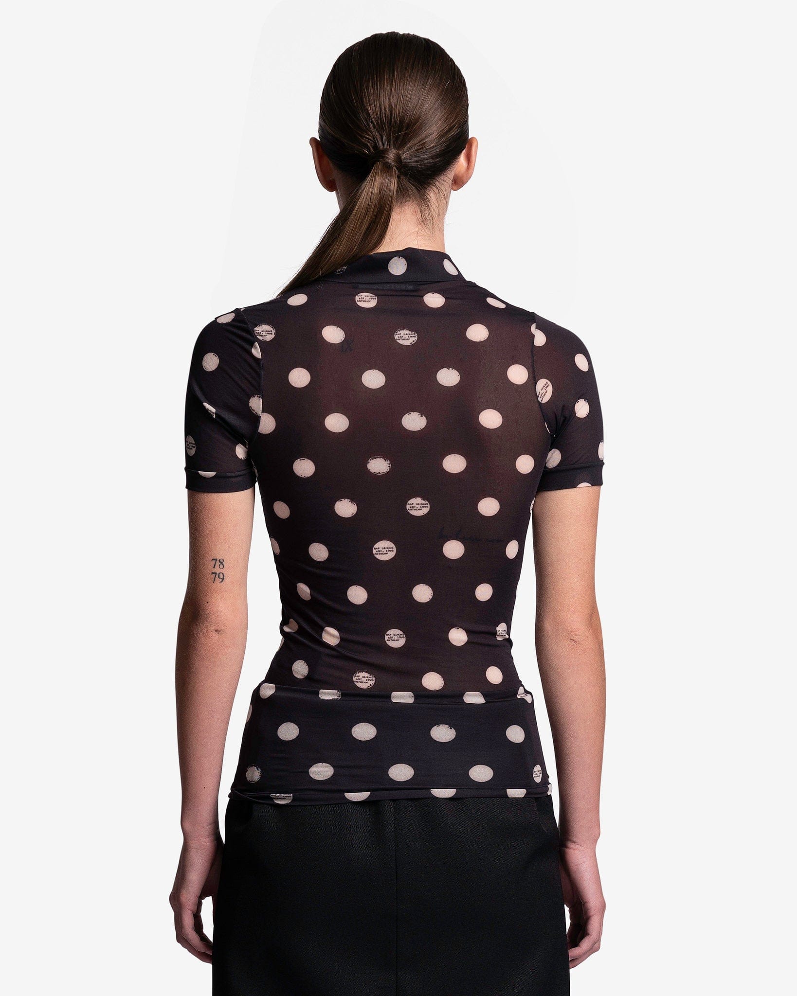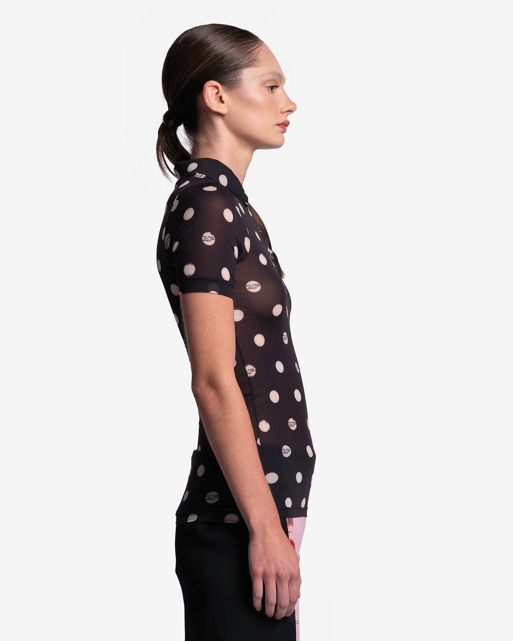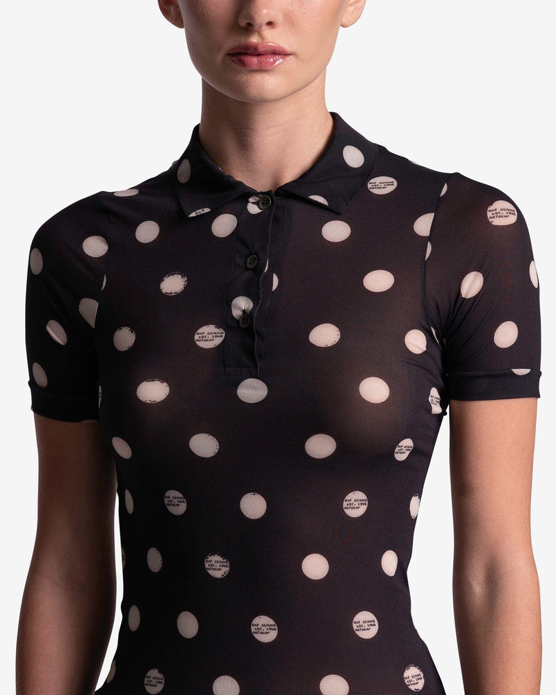 Raf Simons women's polka dot polo shirt in black and white. This shirt is semi-sheer and fitted throughout the body with an allover polka dot print. Some of the polka dots feature logo text written on the interior.