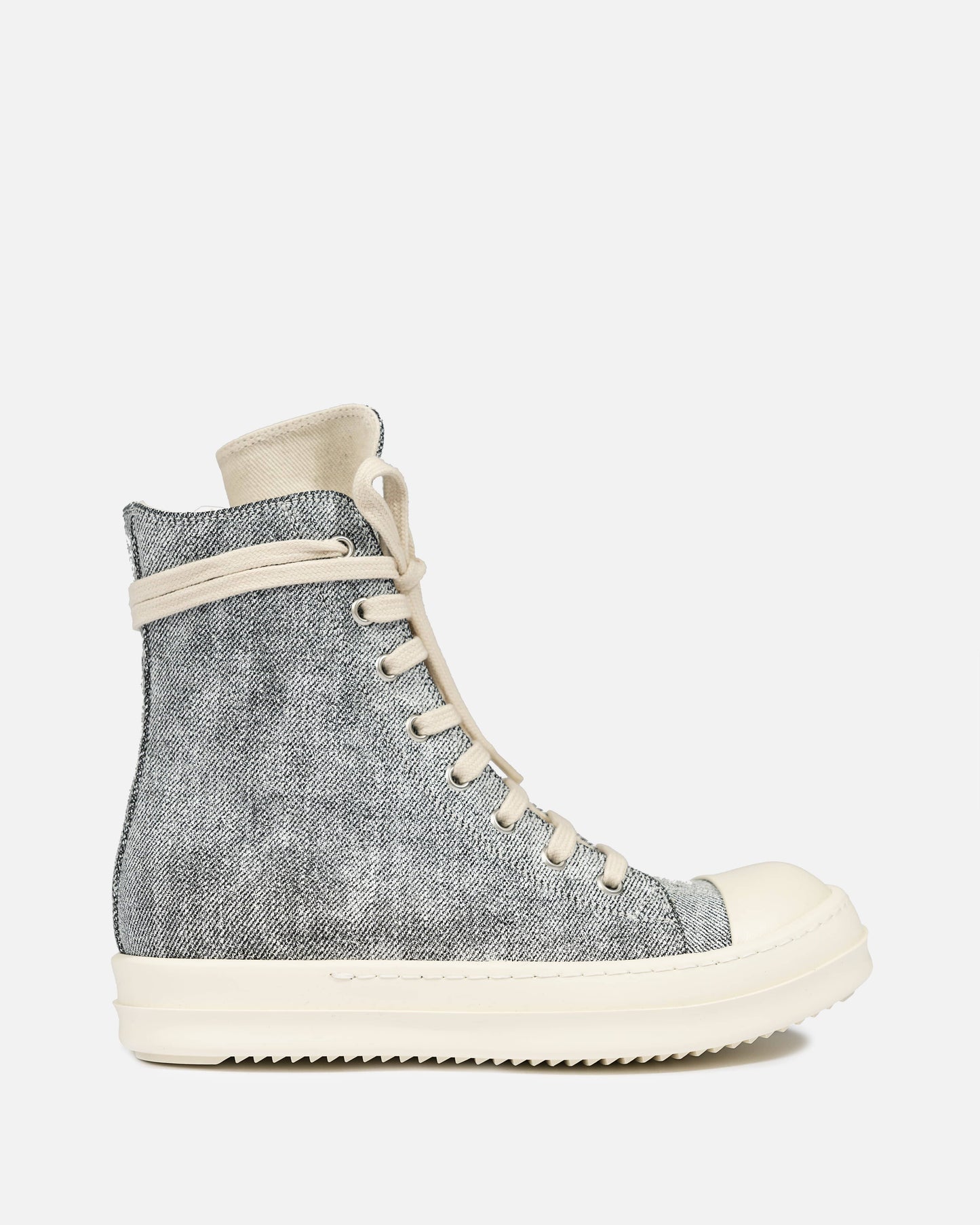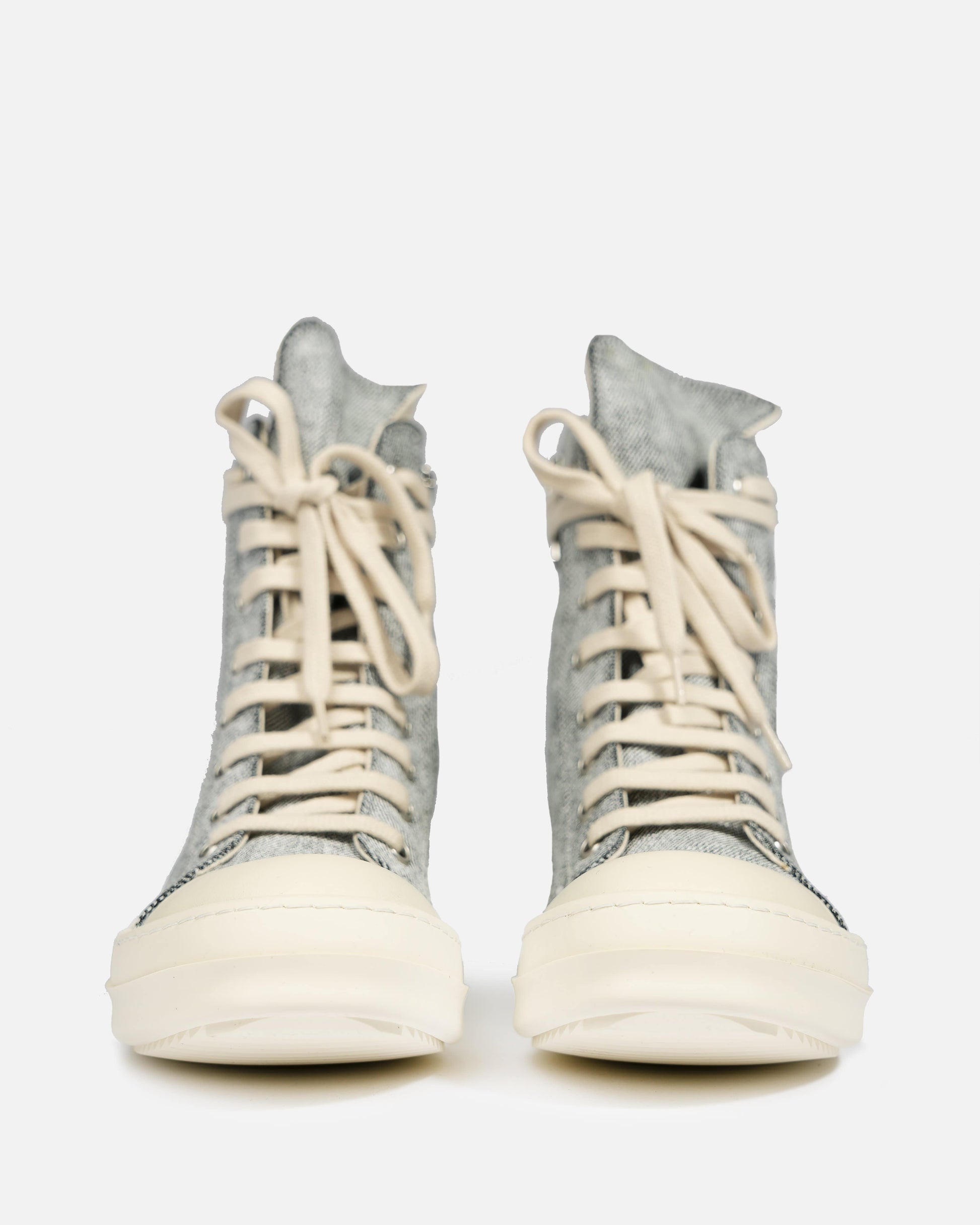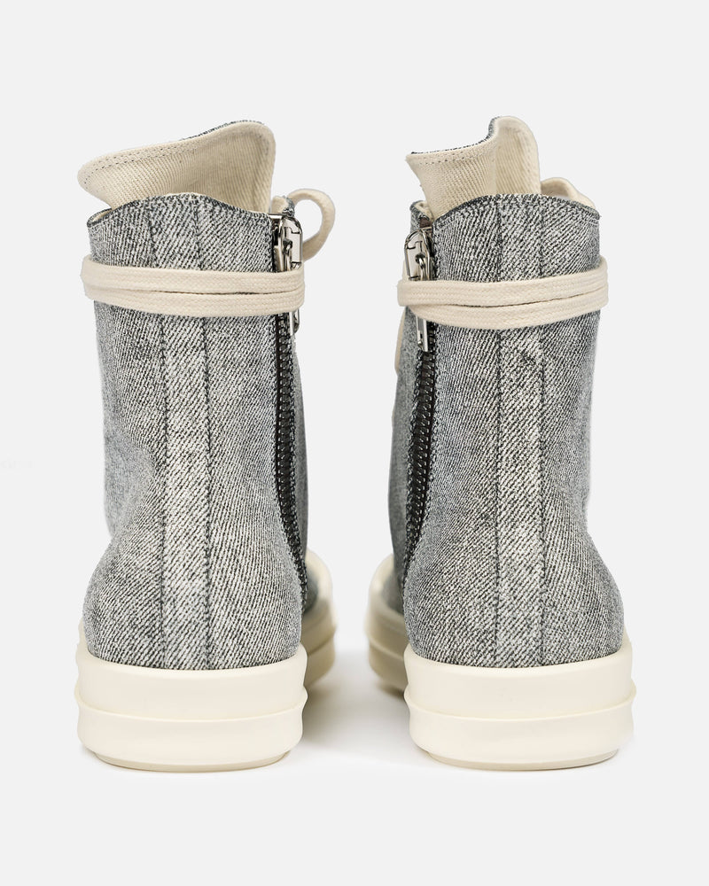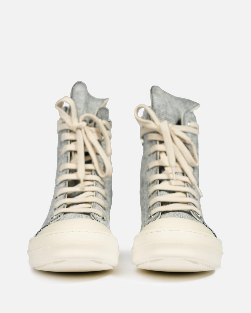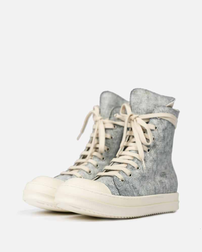 High-top denim sneakers in washed white. Round calfskin covered cap toe. Lace-up closure in off-white. Zipper and eyelet vents at inner side. Twill lining. Treaded rubber sole in off-white. Silver-tone hardware.