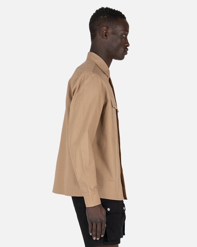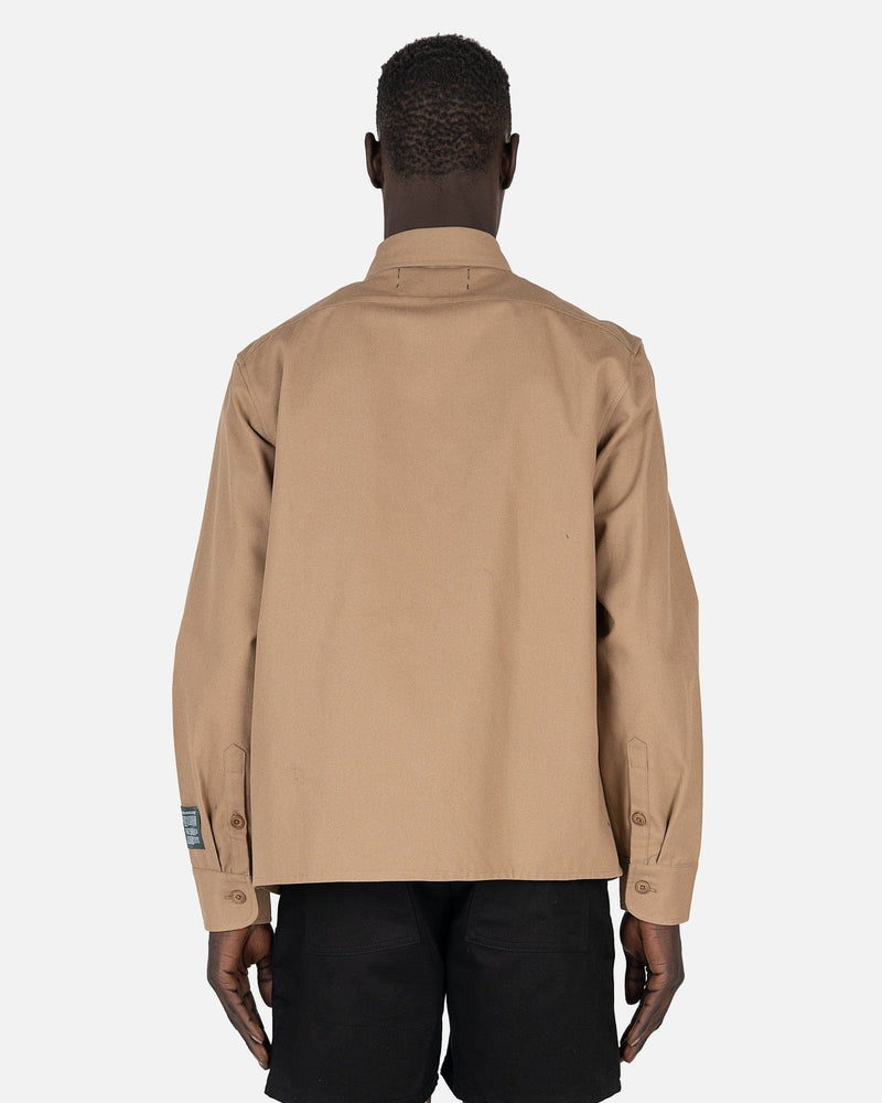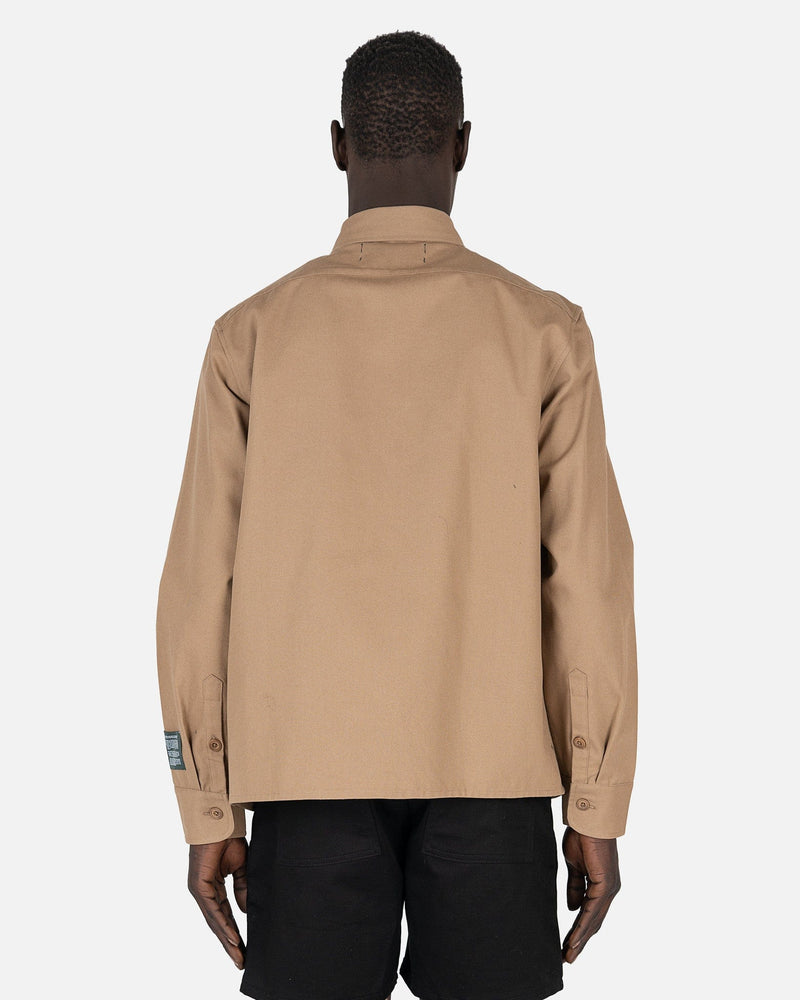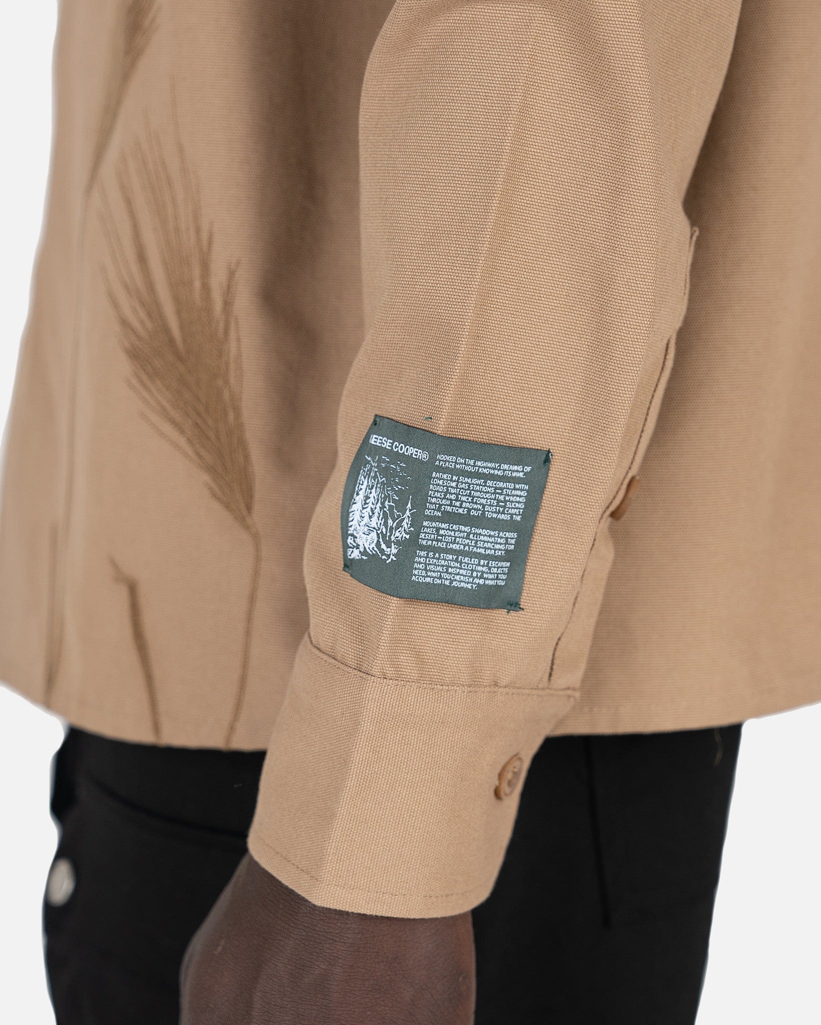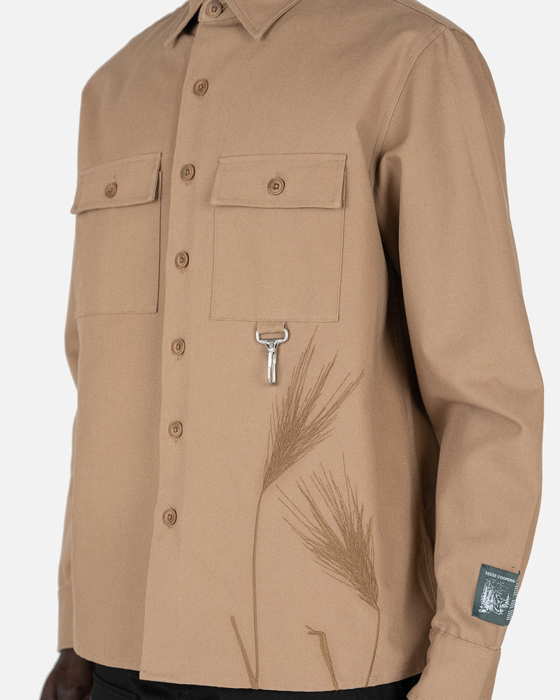 Reese Cooper men's soft cotton embroidered shirt in khaki. This top features a classic collar with front button closure. The signature Reese Cooper hook hangs from a front pocket. There is oat grass embroidered on the left front.