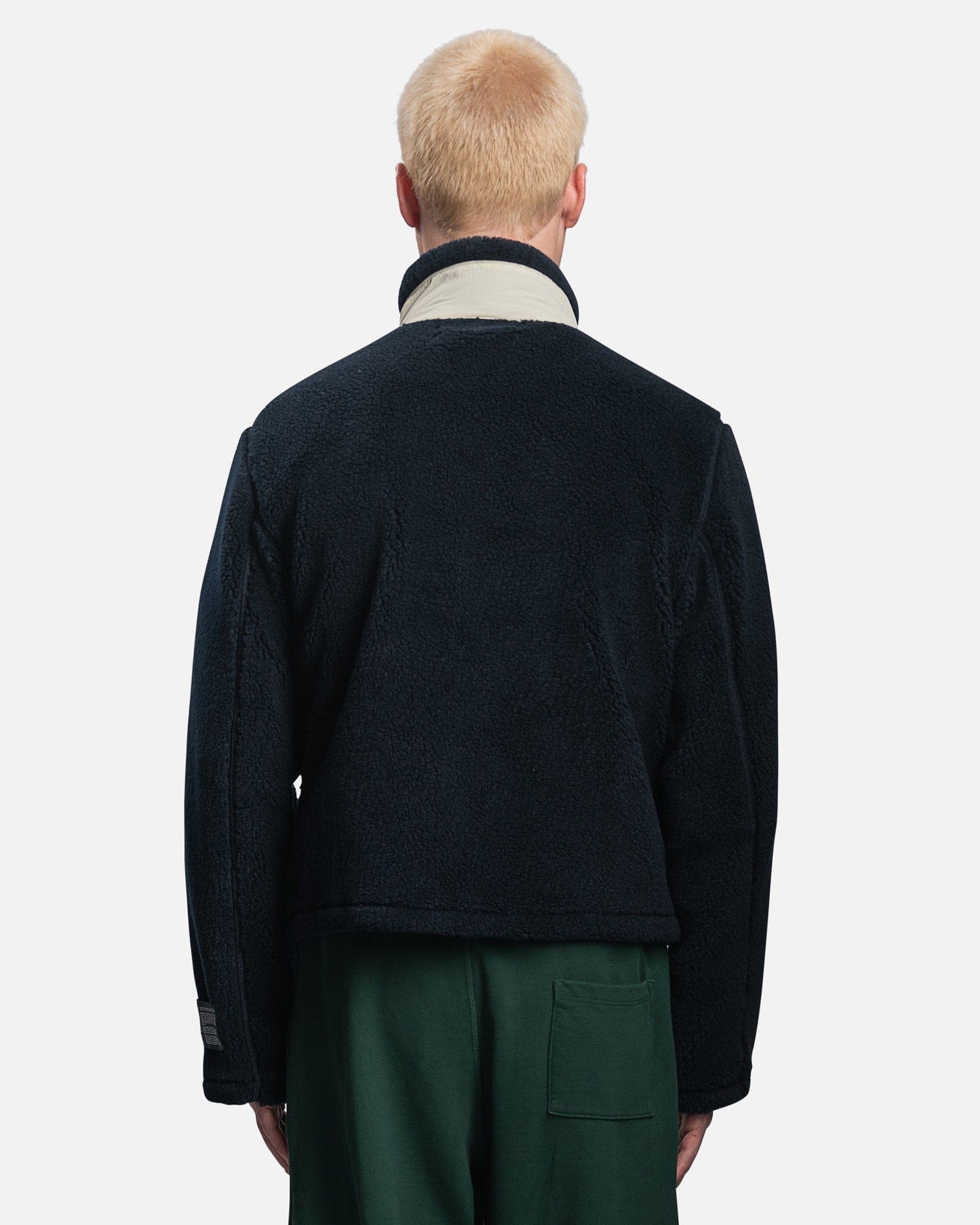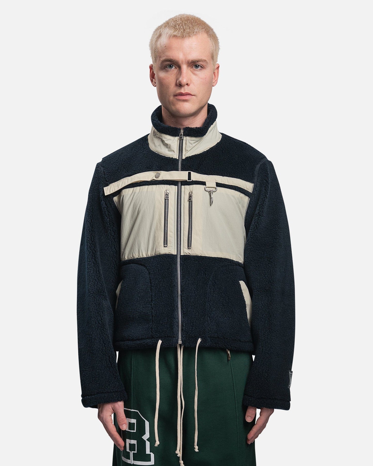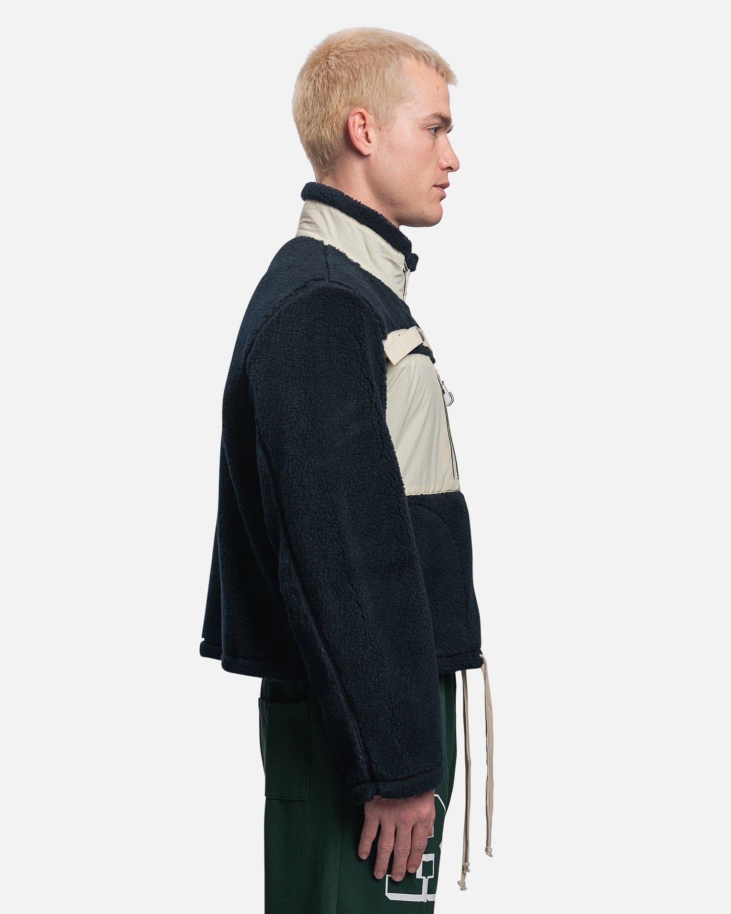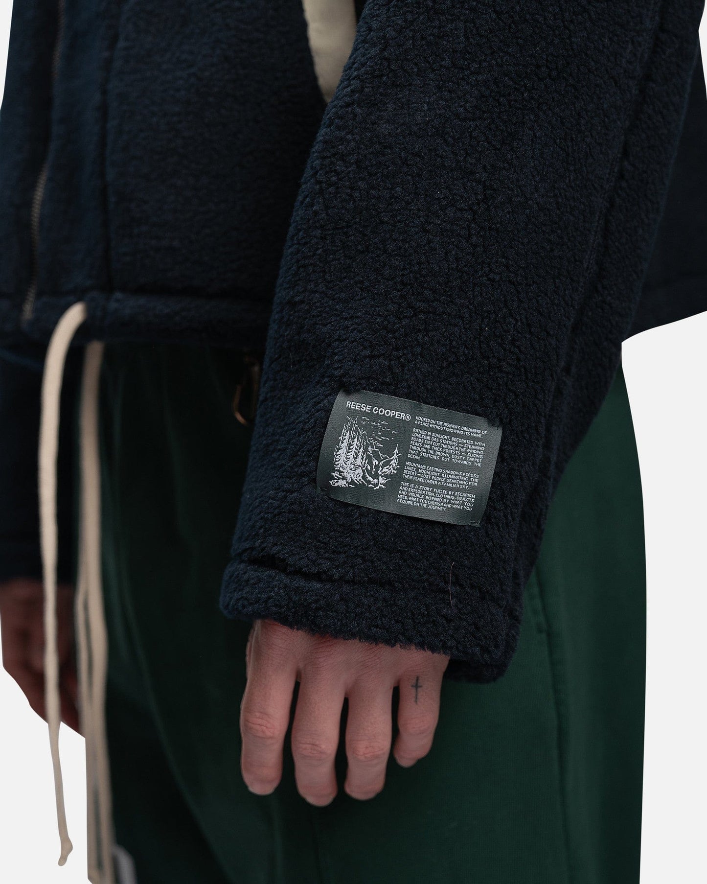 Reese Cooper women's sherpa fleece jacket in navy blue. There are two side slit welt pockets and a Reese Cooper logo patch on the left sleeve. Drawstring closure hangs from the hem.