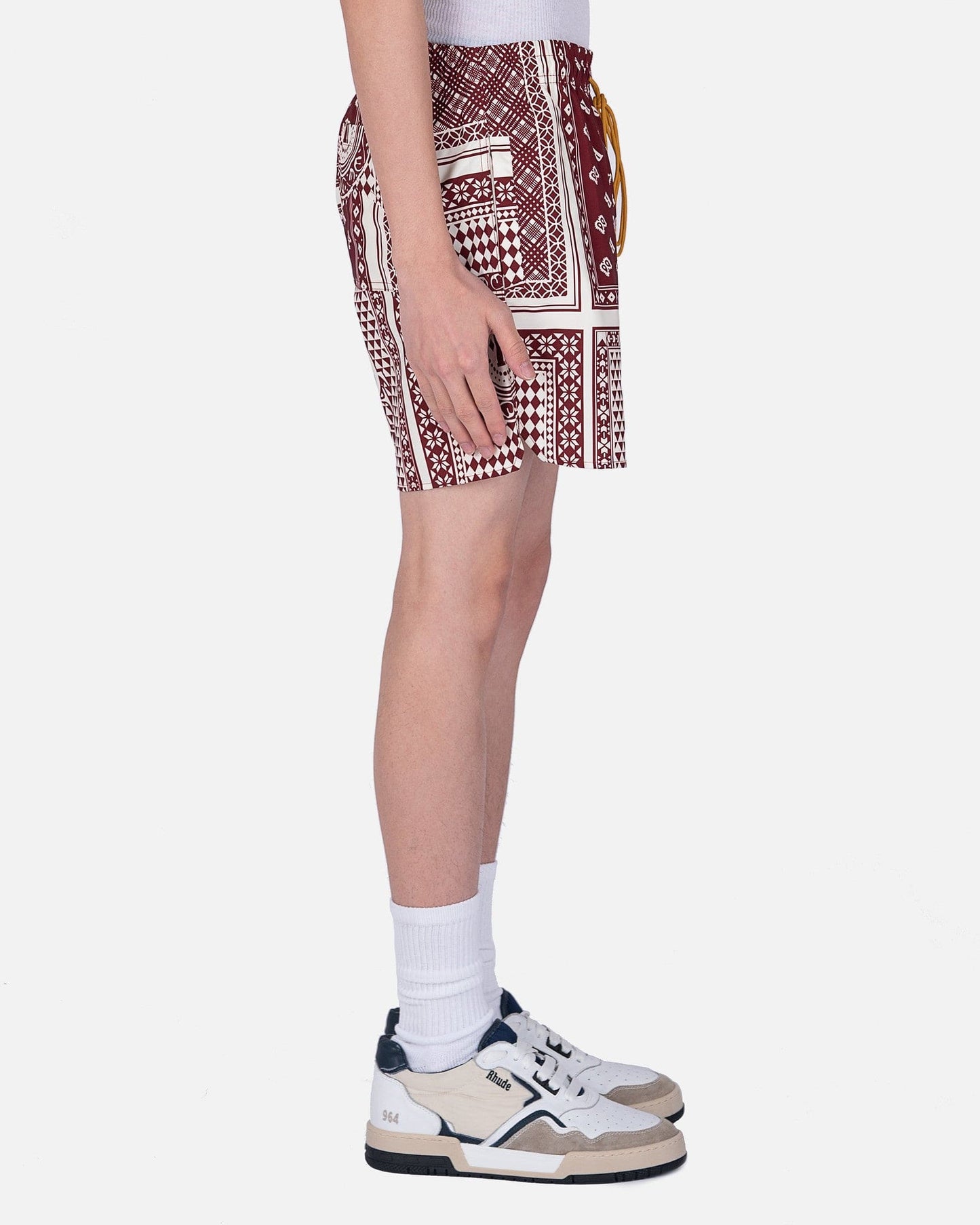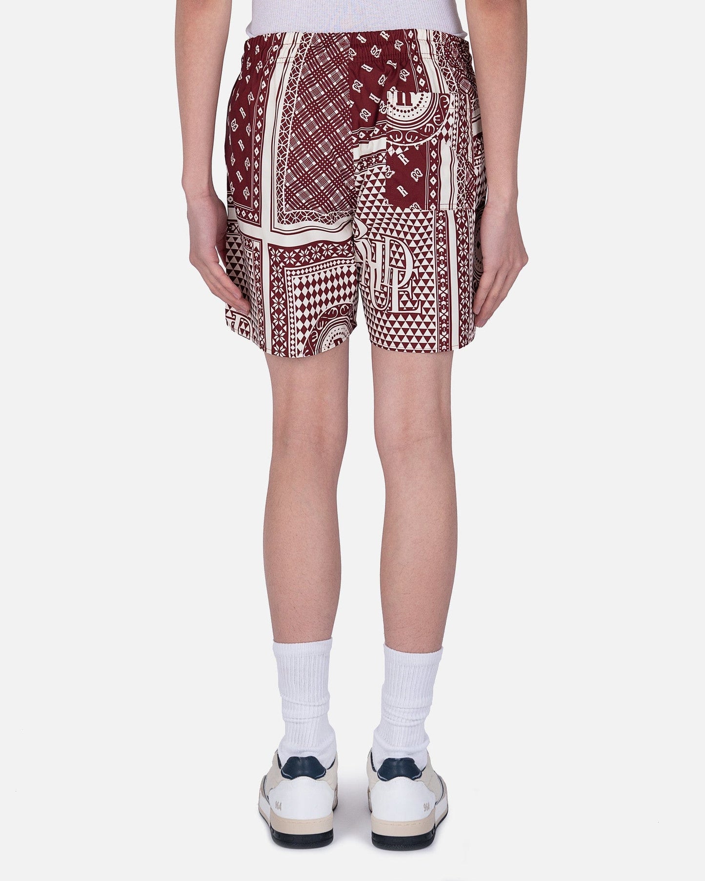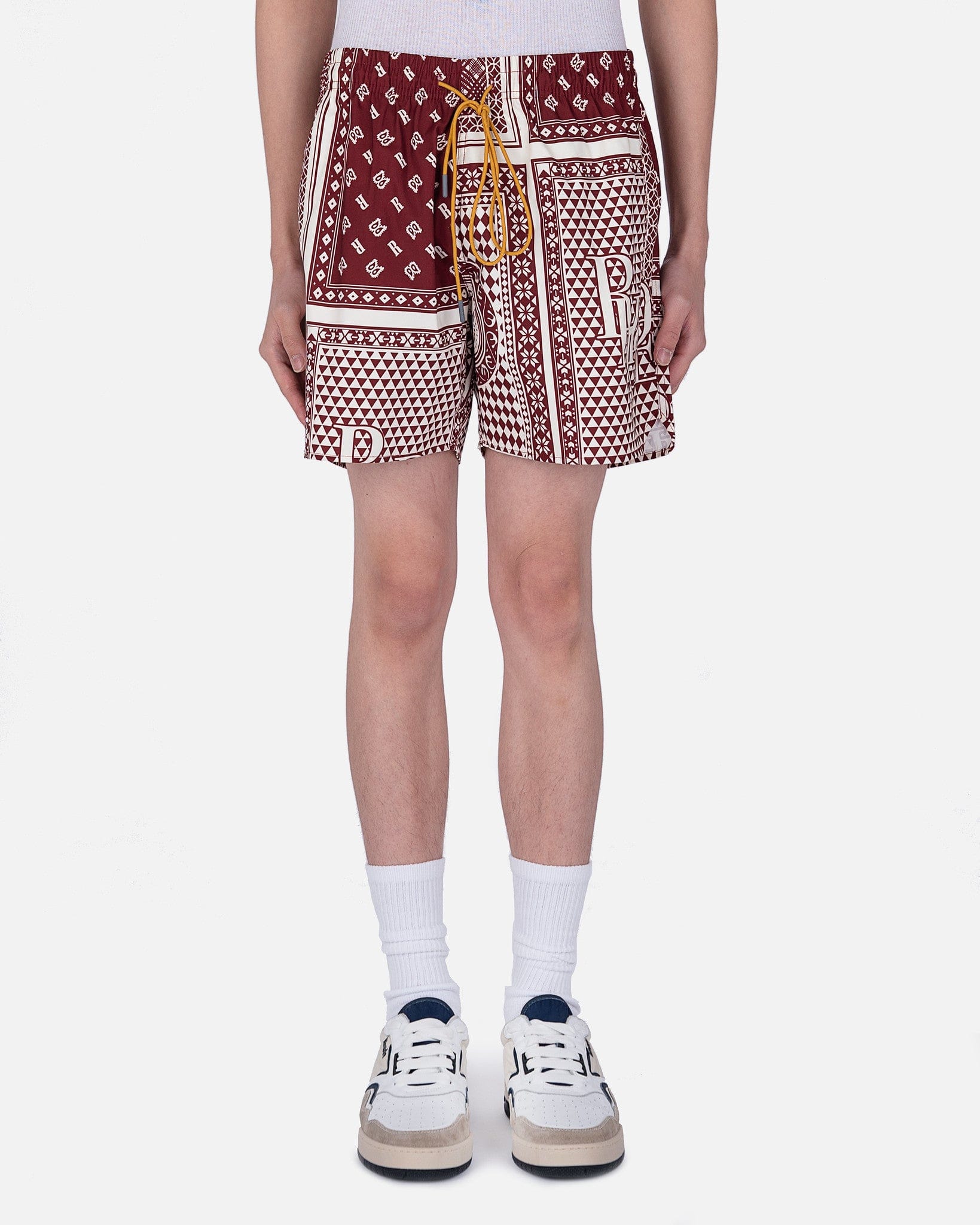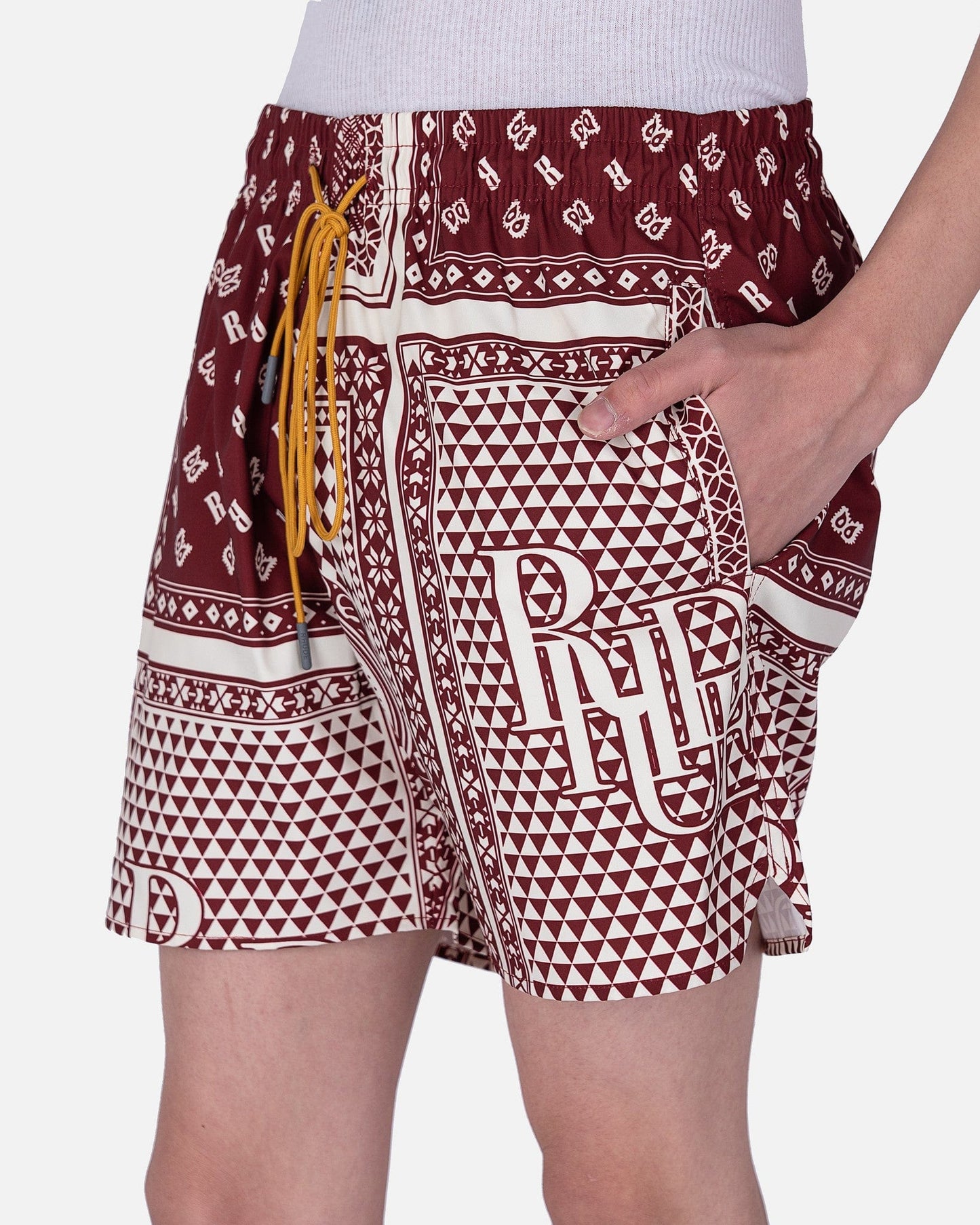 Rhude men's card print swim shorts in maroon. These shorts have a drawstring elasticized waistband and two side slit pockets. They are fully lined and have an allover card inspired print with a logo on the left leg.