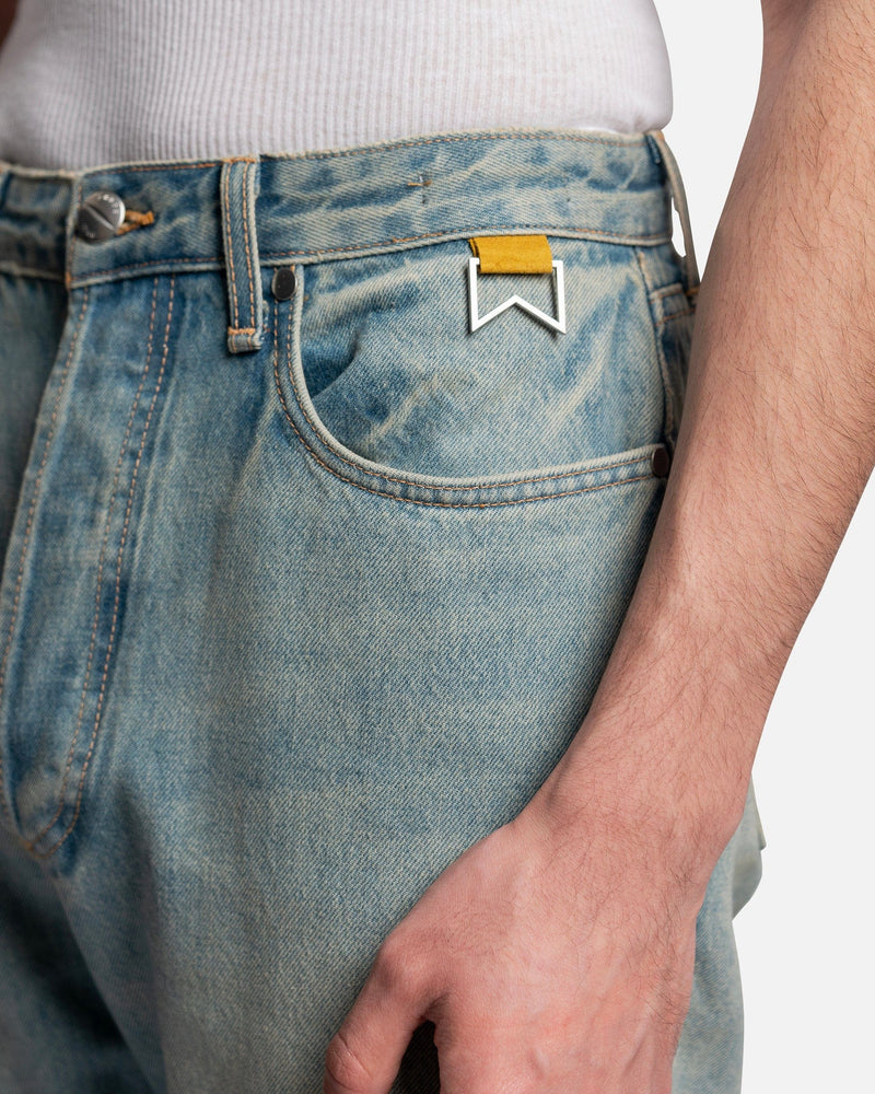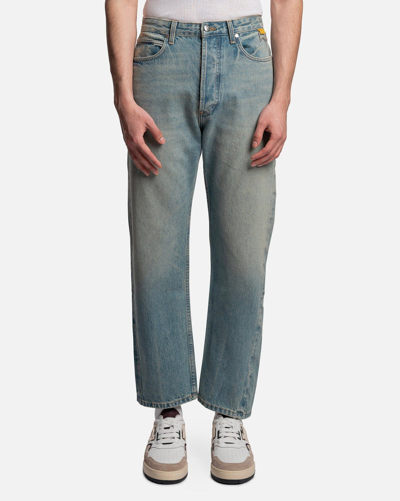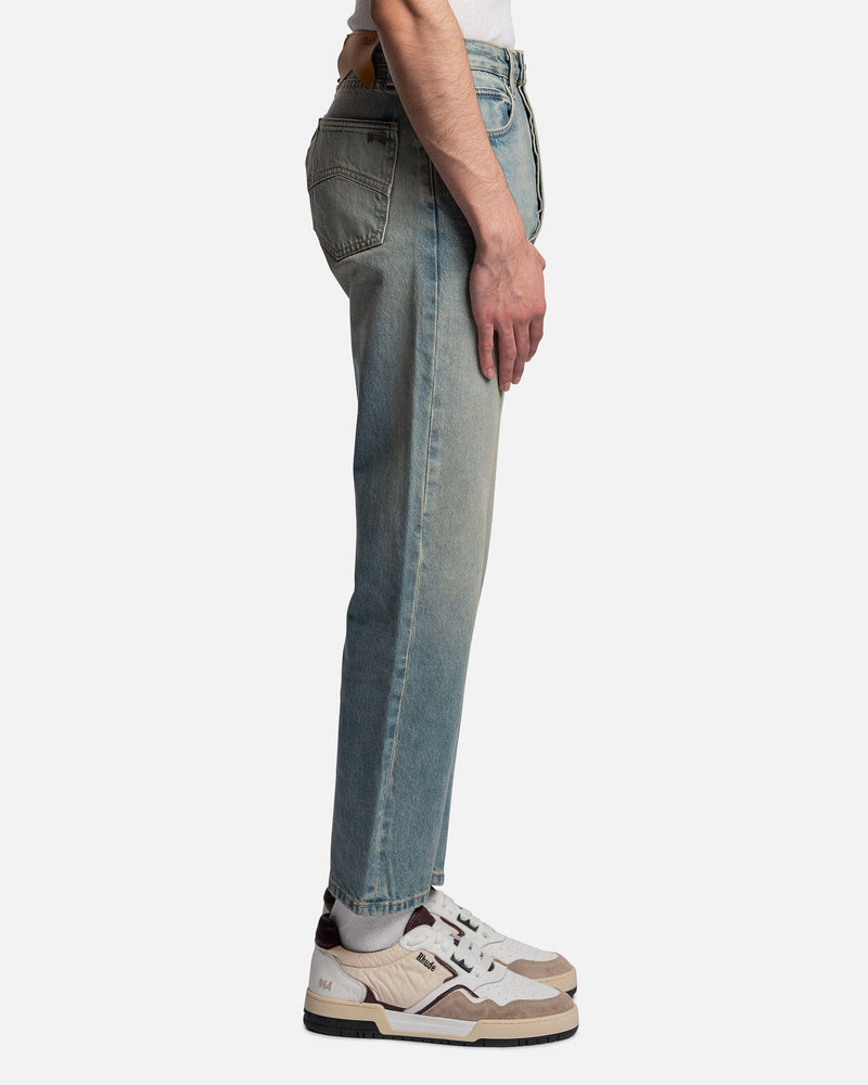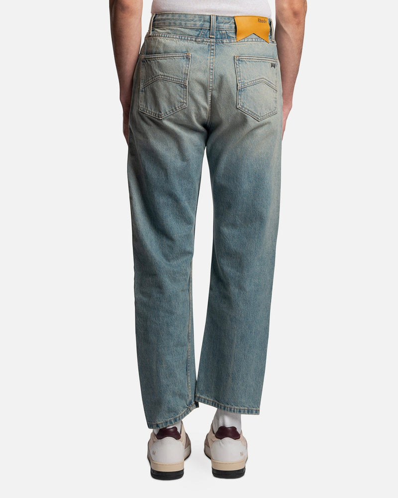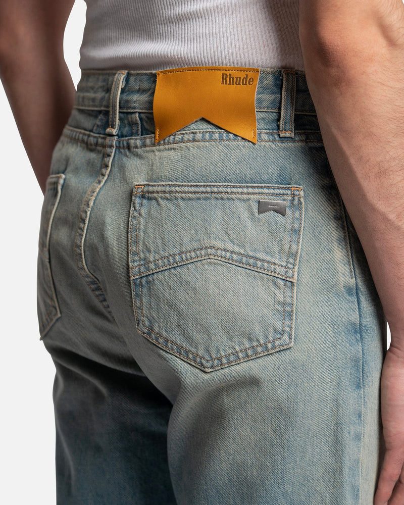 Rhude men's jeans in blue. These pants feature a five-pocket composition, metal rivets, a front button closure, and a back waist leather logo patch.