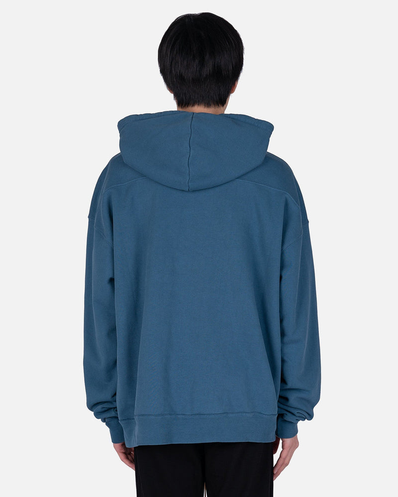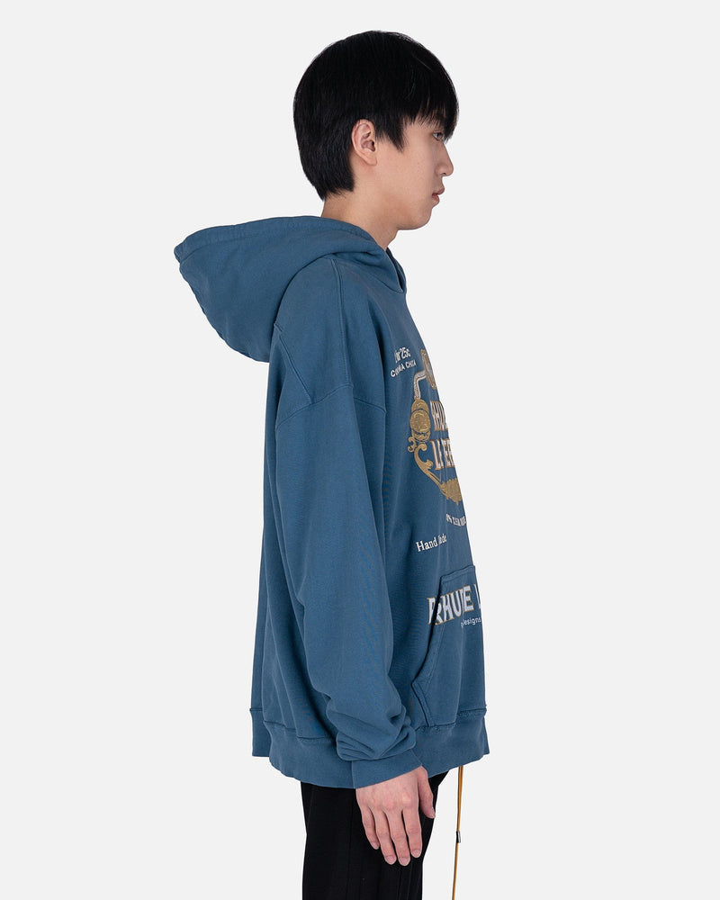 Rhude men's graphic cotton hoodie in dark blue. This hoodie has a front logo graphic that reads 'RHUDE LE TEBAC'. The cuffs and hem are ribbed.