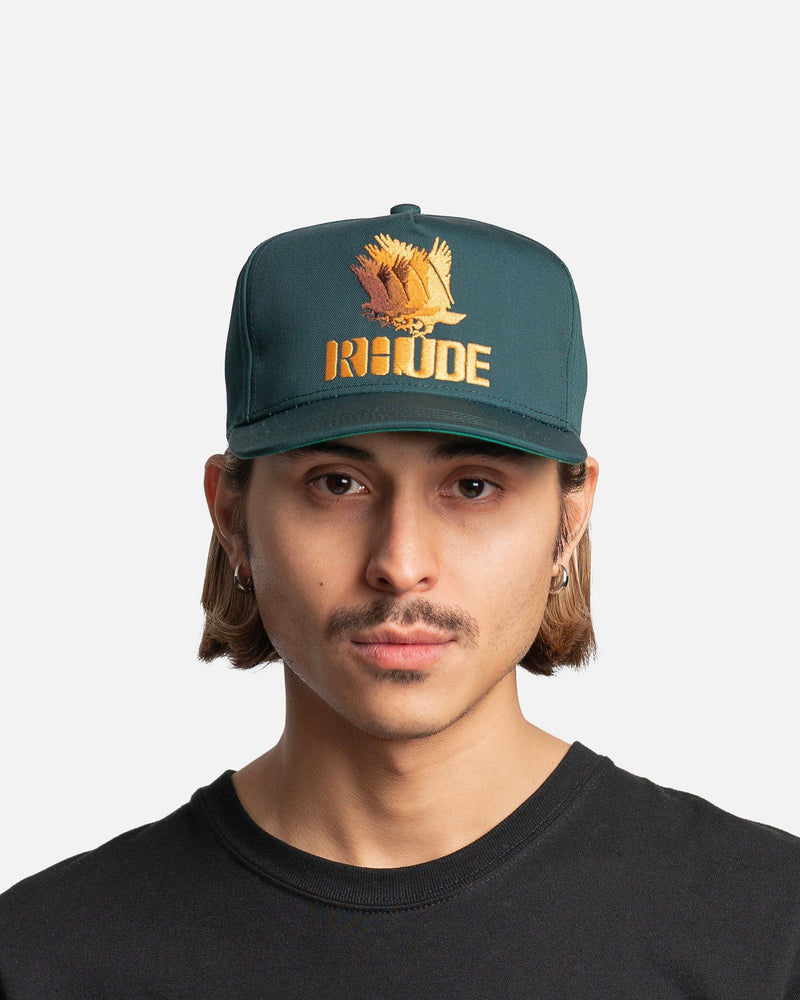Rhude men's trucker hat in green. This cotton/polyester blend twill trucker hat features a logo graphic with eagles embroidered on the crown. The hat has a flat brim and an adjustable snapback fastening.