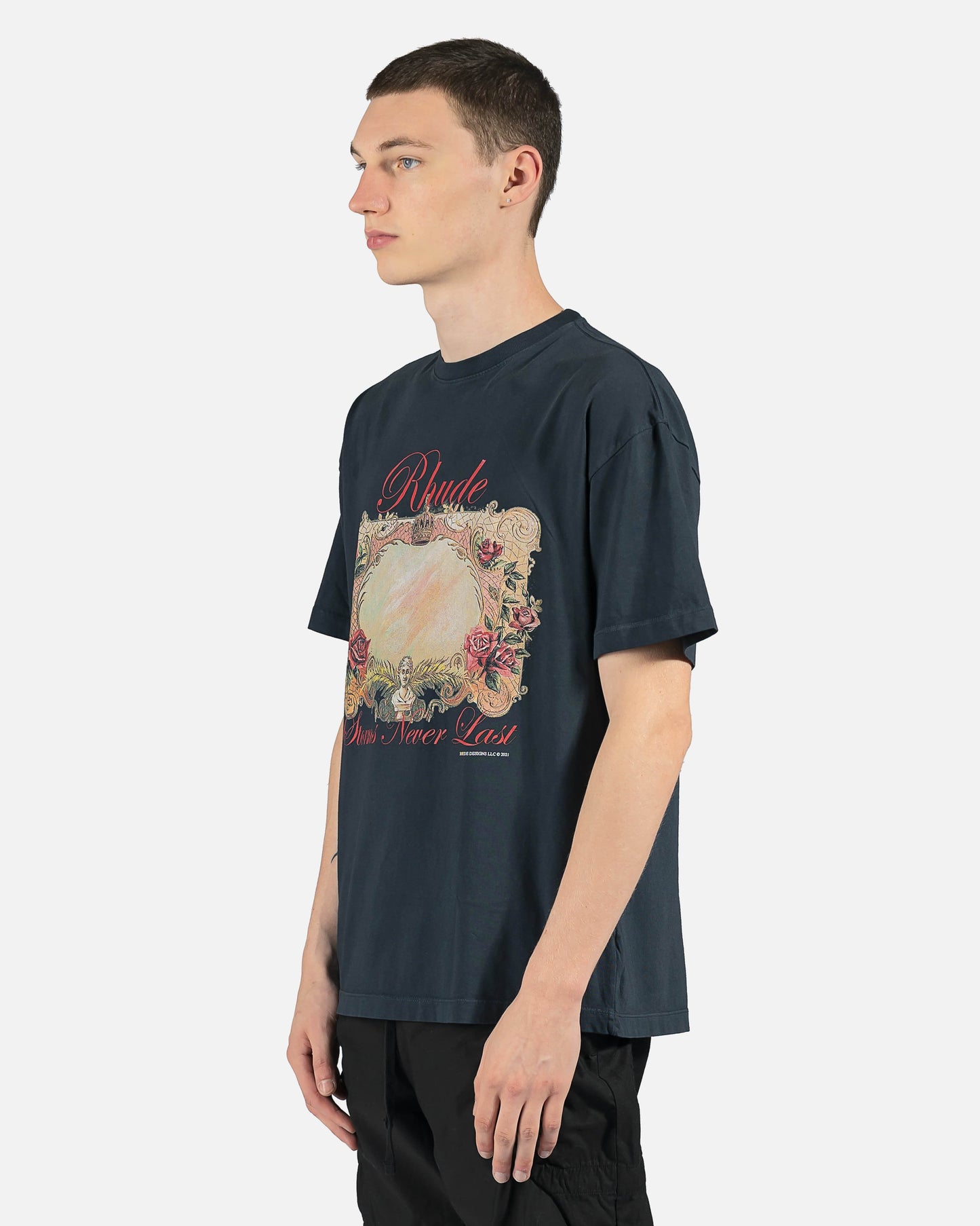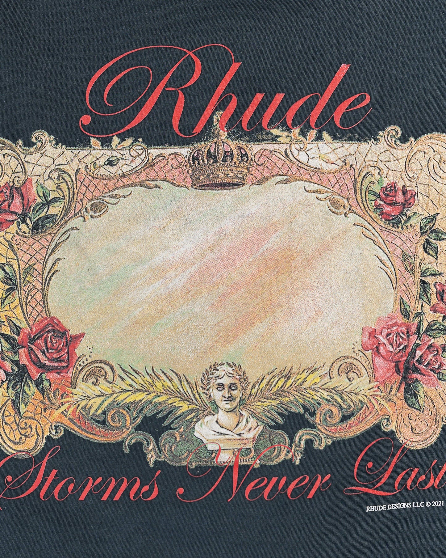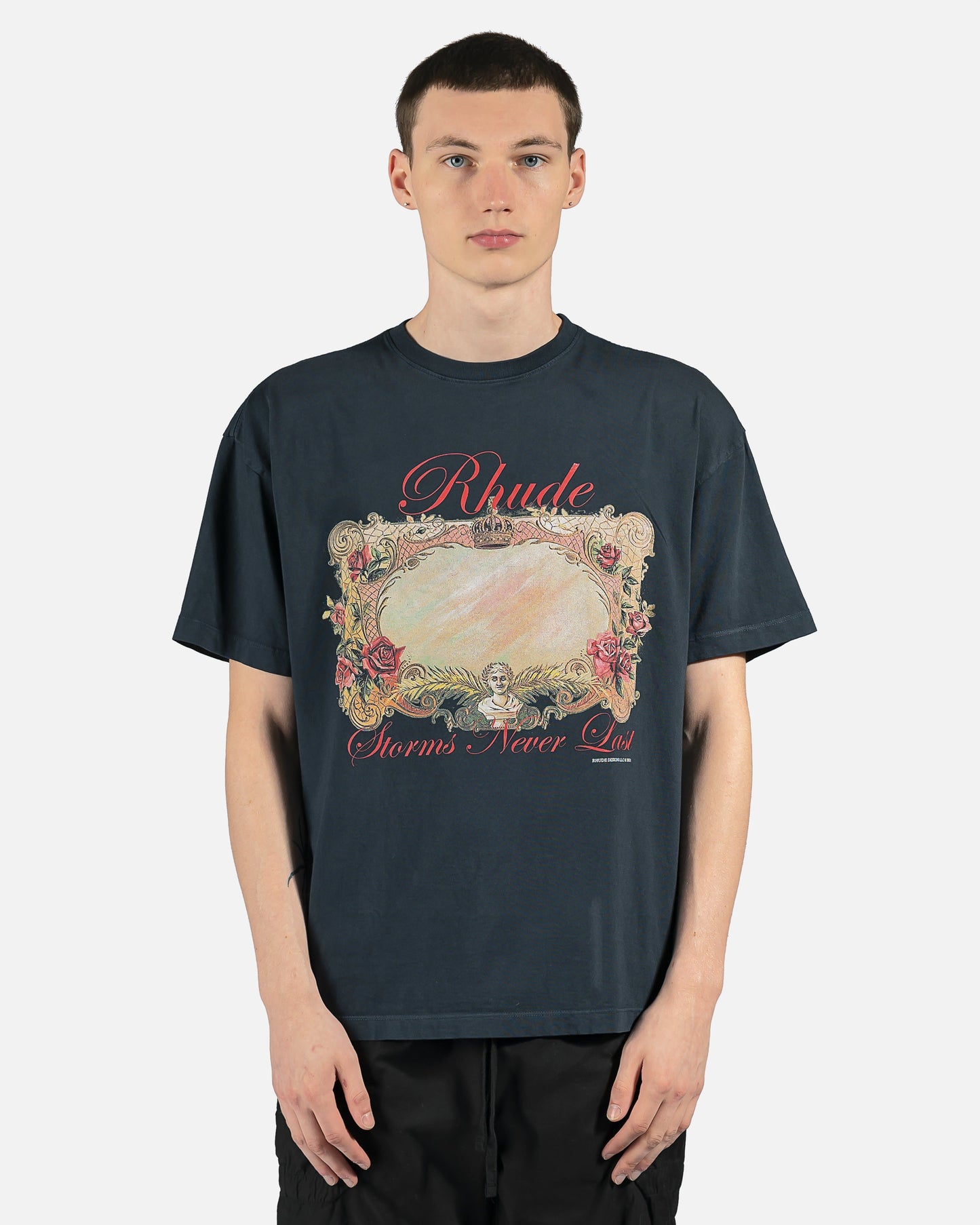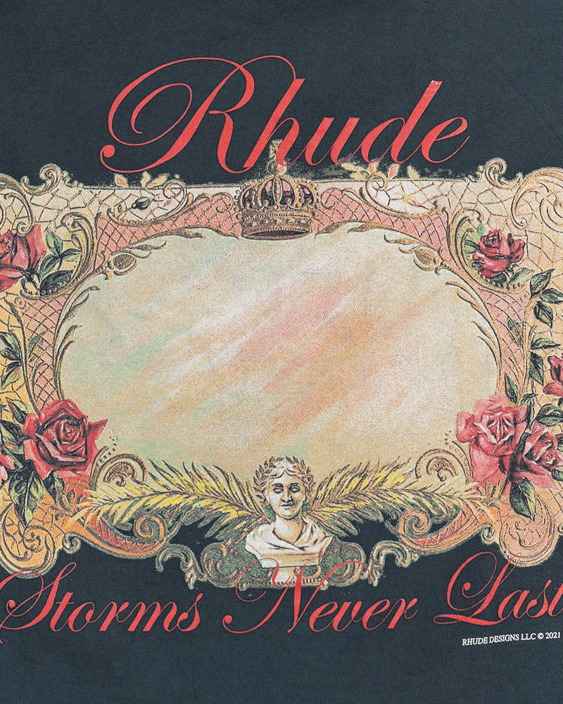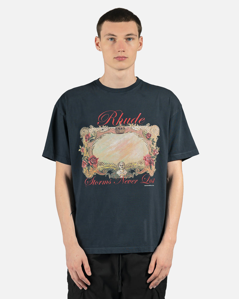 The Mirror T-Shirt by Rhude debuts as part of the brand's FW21 collection "Storms Never Last." This style is a custom-fit piece featuring a vintage wash and printed graphics.