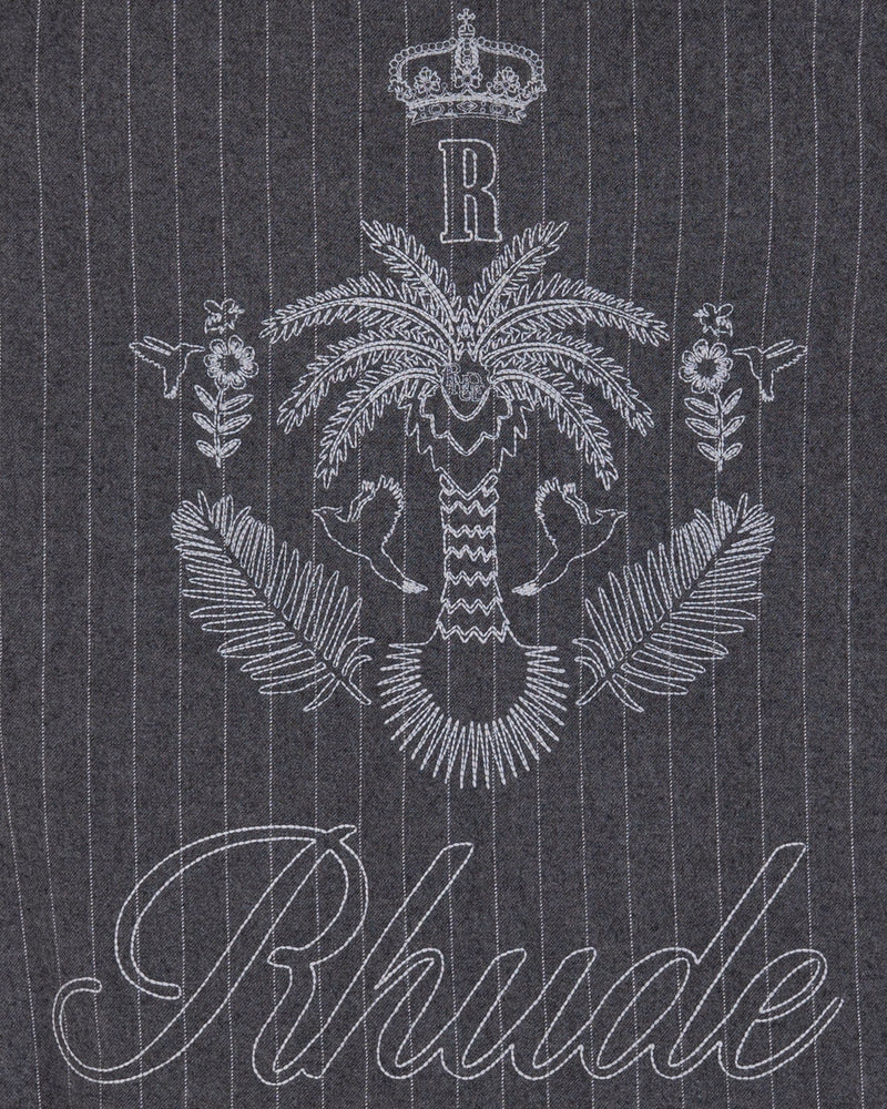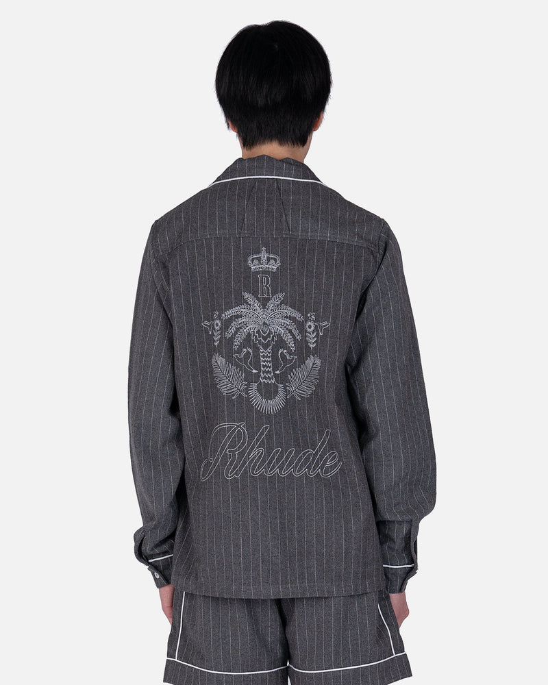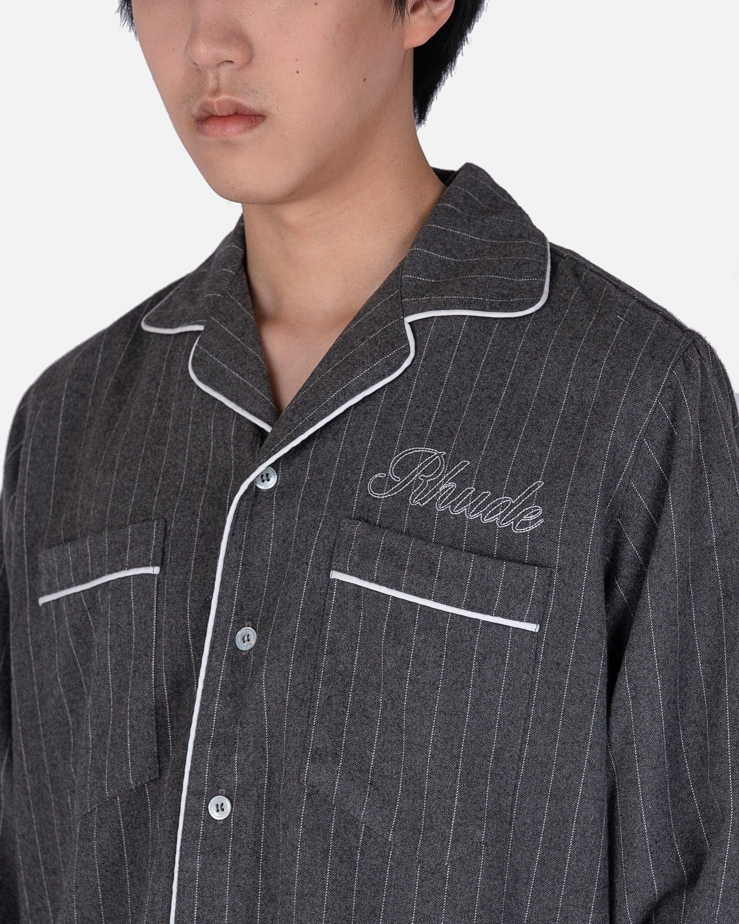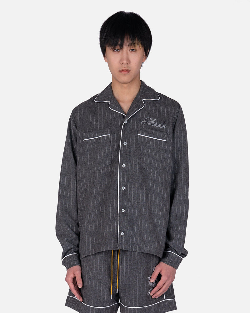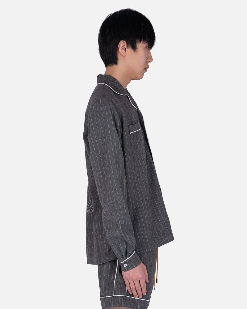 Rhude men's long sleeve pajama shirt in grey. This striped top features a camp collar and front button closure. There are two front patch pockets. The Rhude logo is embroidered above the left chest pocket. There is also an embroidered logo and graphic on the back.