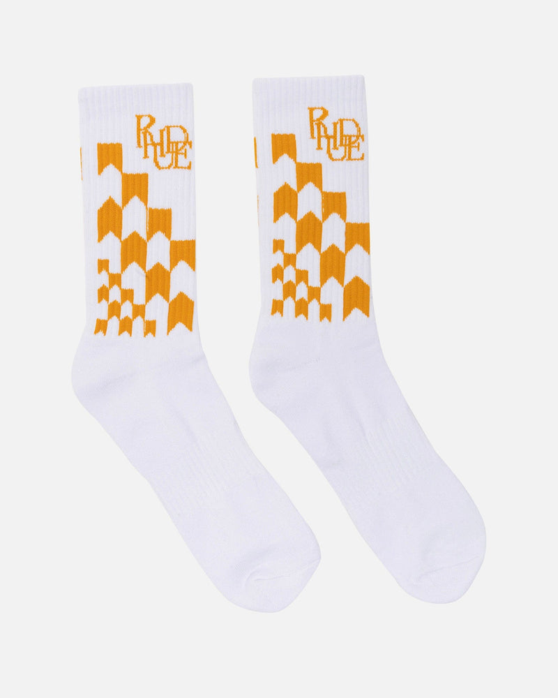 Rhude men's logo stripe socks in white and pink. These calf length stretch knit socks feature the Rhude logo and racing checkers along the calf.