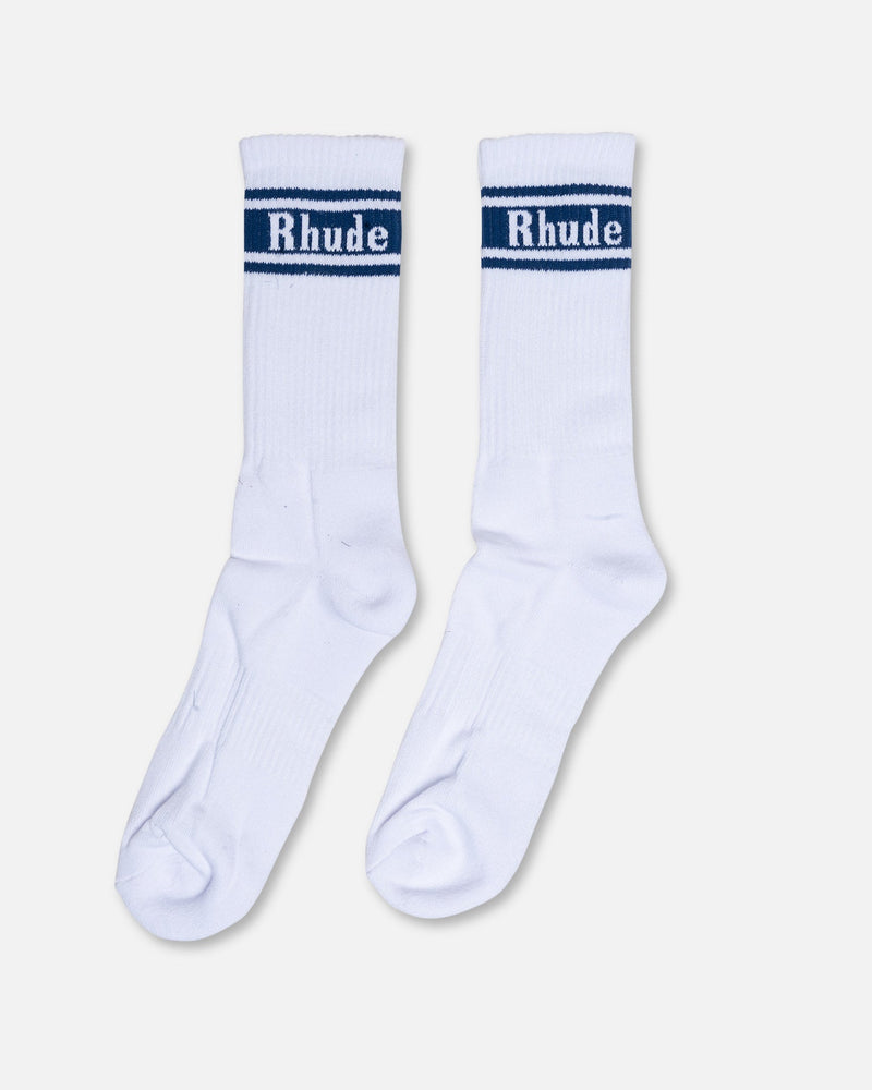 Rhude men's logo stripe socks in white and navy. These calf length stretch knit socks feature the Rhude logo against a maroon stripe.