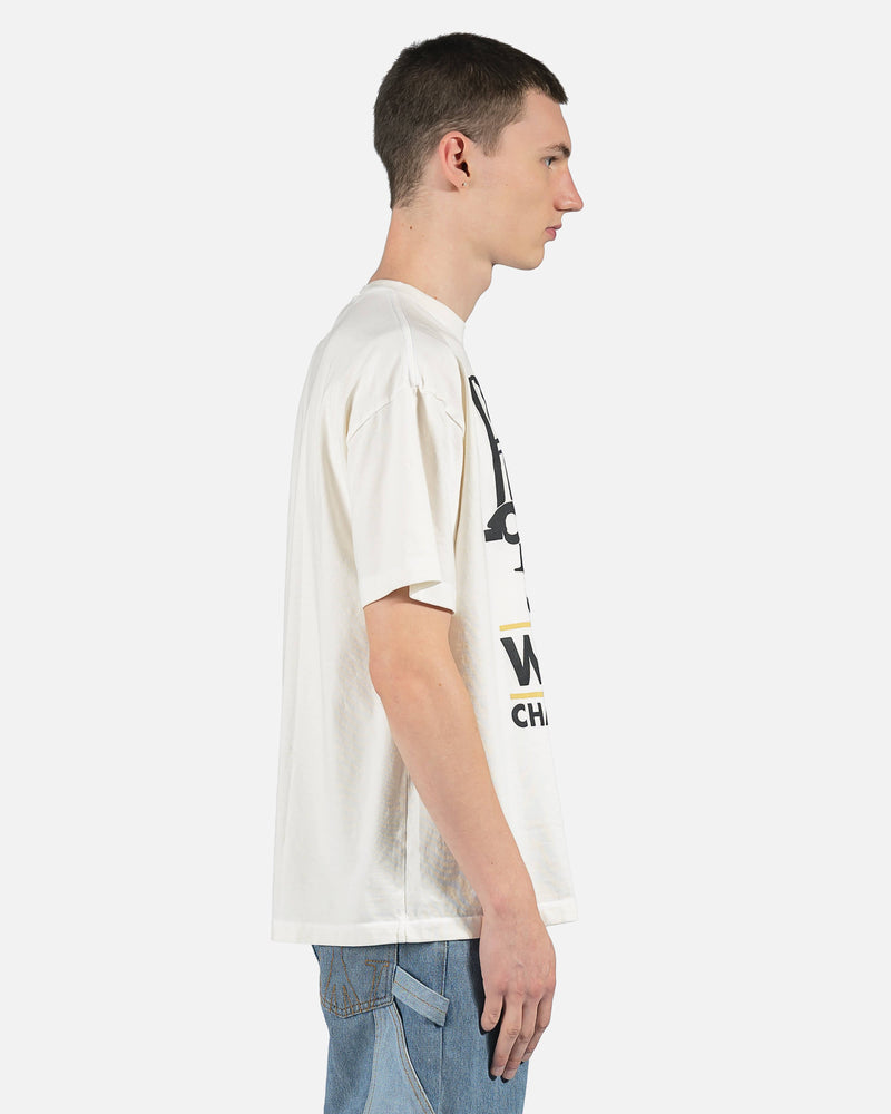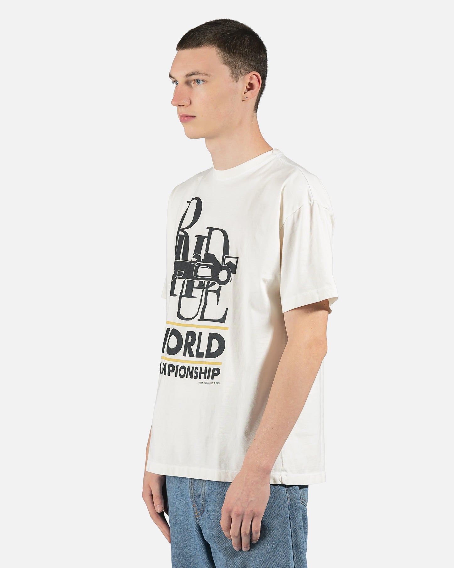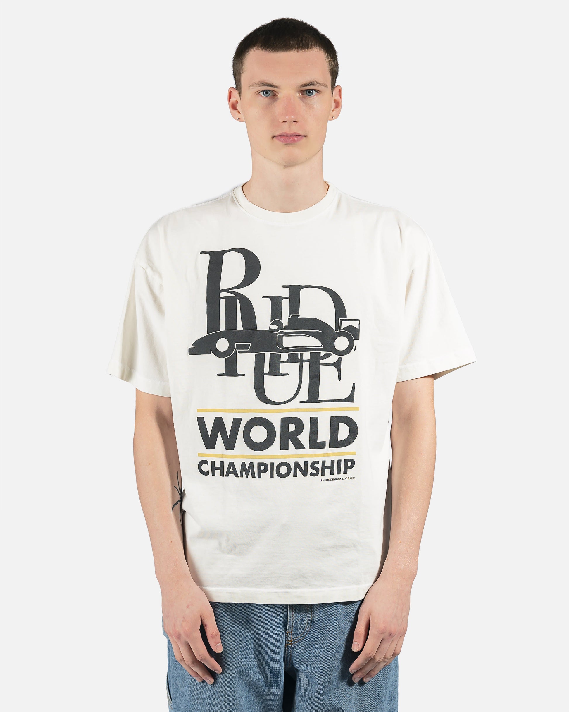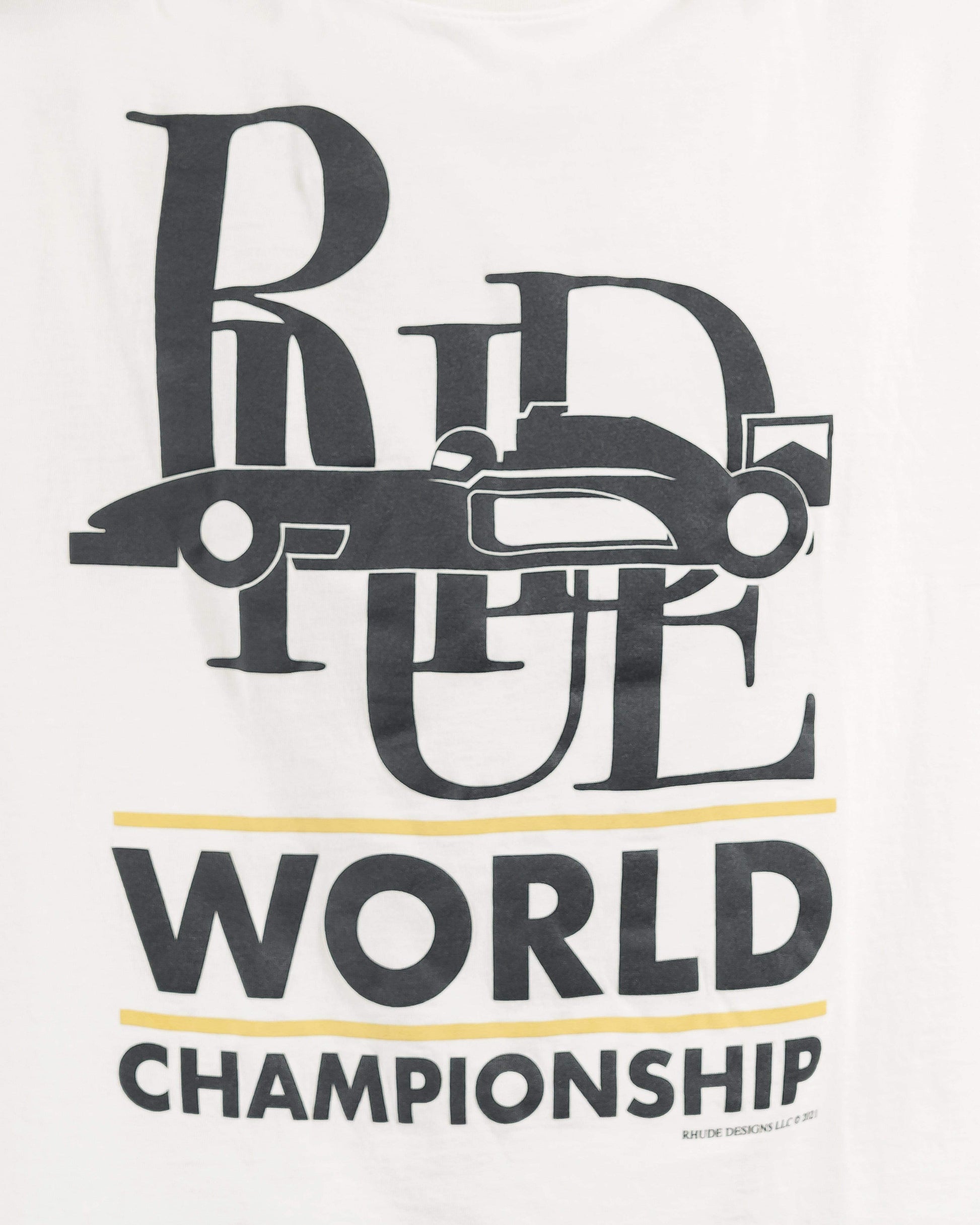 The Rhude World Champion T-Shirt is a custom-fit graphic tee inspired by designer Rhuigi Villasenor's love of auto racing. This style comes in a vintage off-white color furthering its retro appeal.