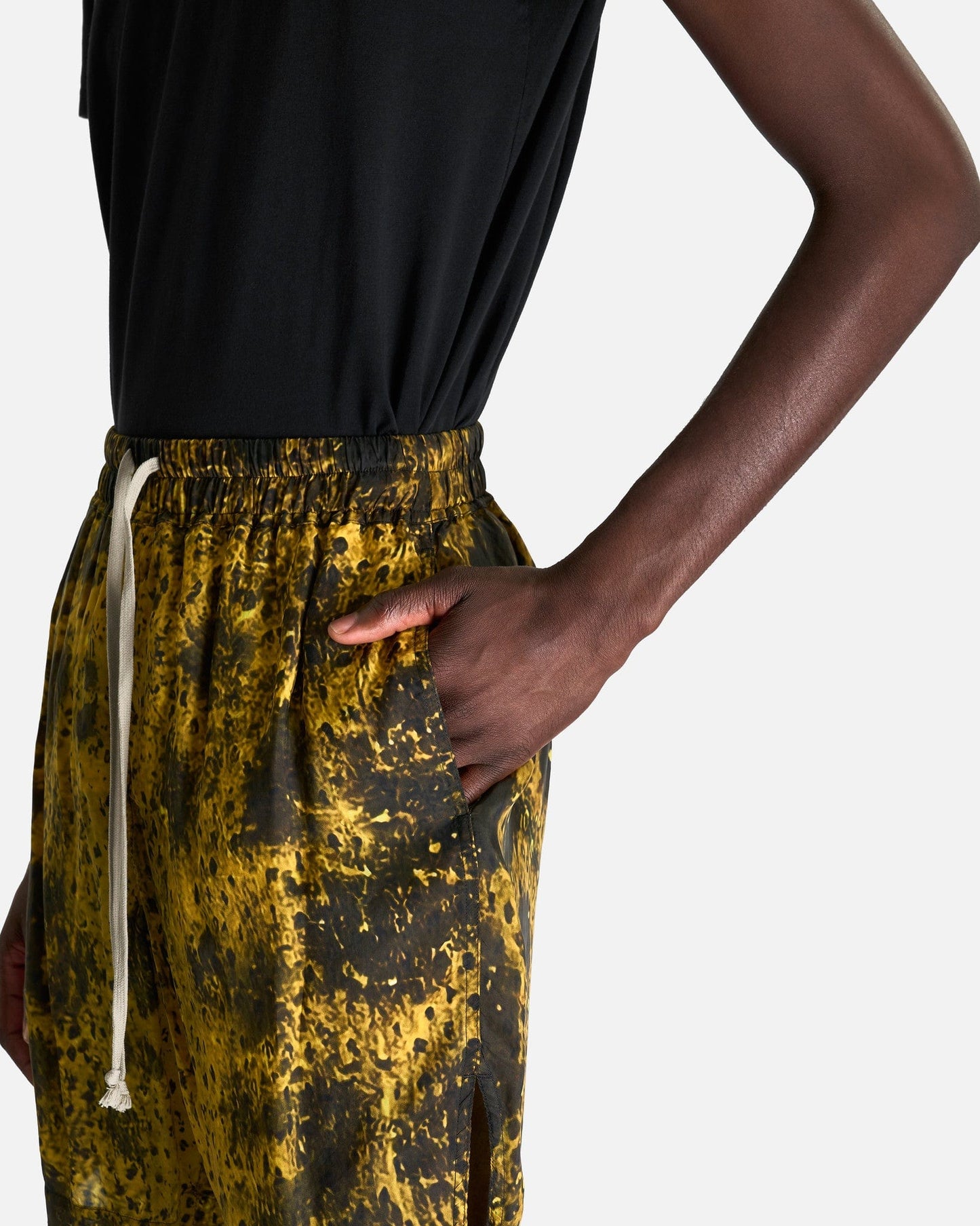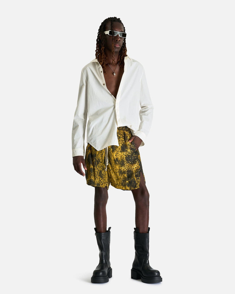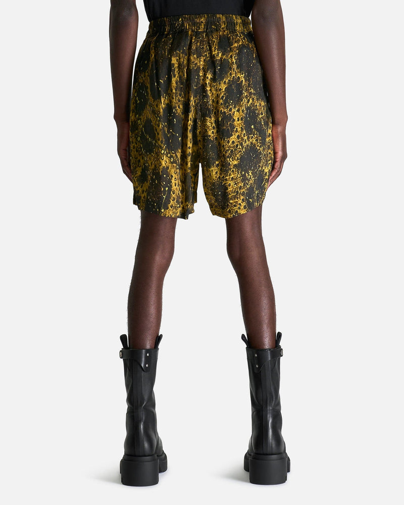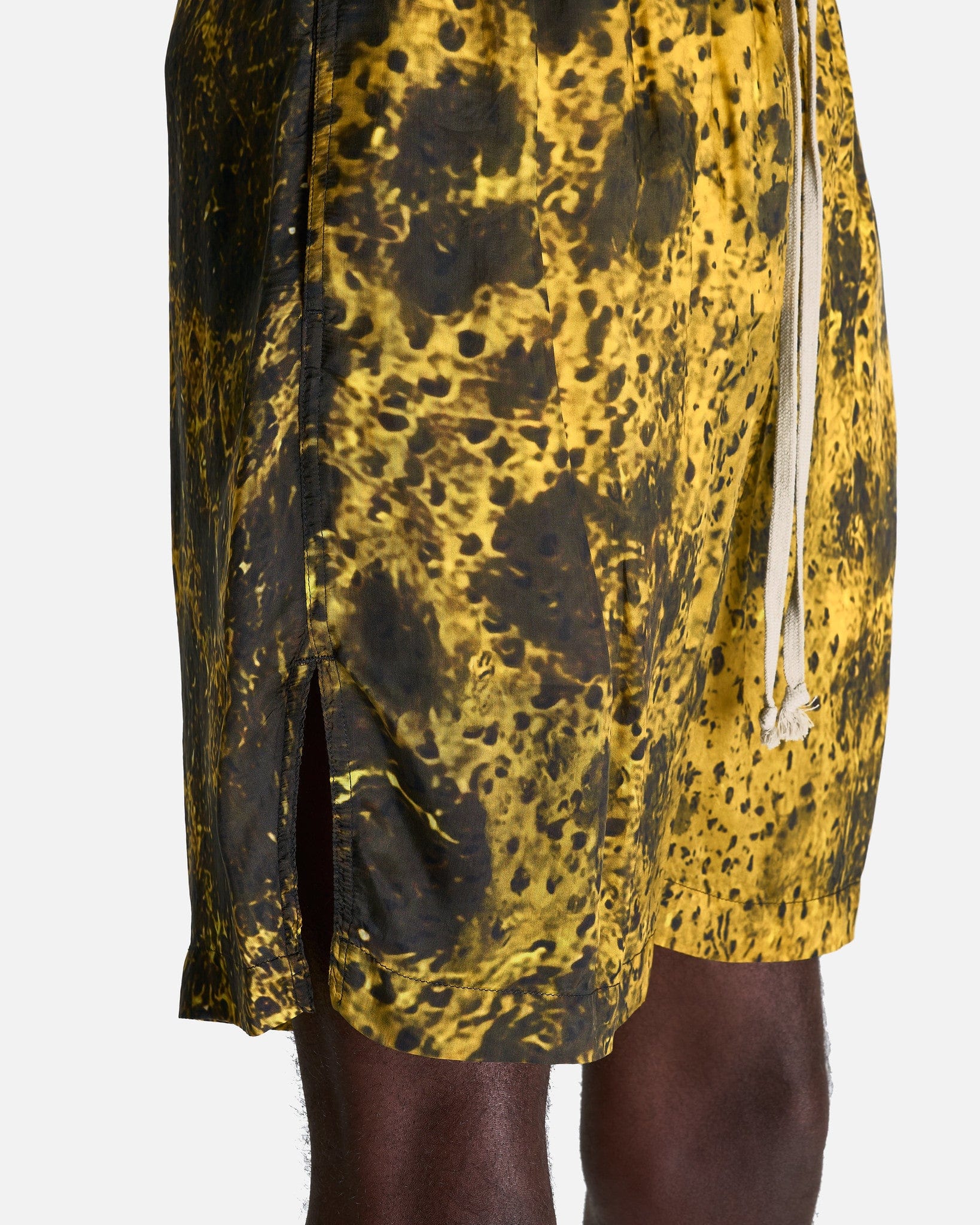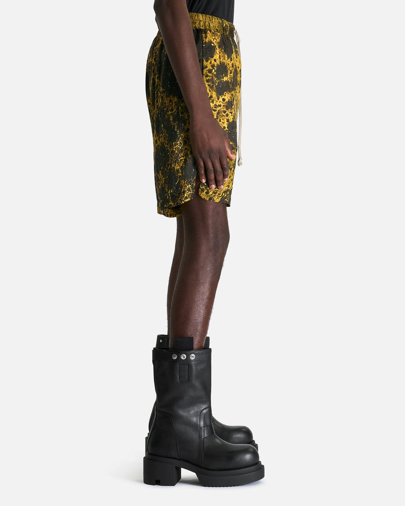 Rick Owens Boxers in Acid Black. These shorts are constructed from cupro and features an elasticized waist with signature drawstrings, side seam pockets and an allover season motif.