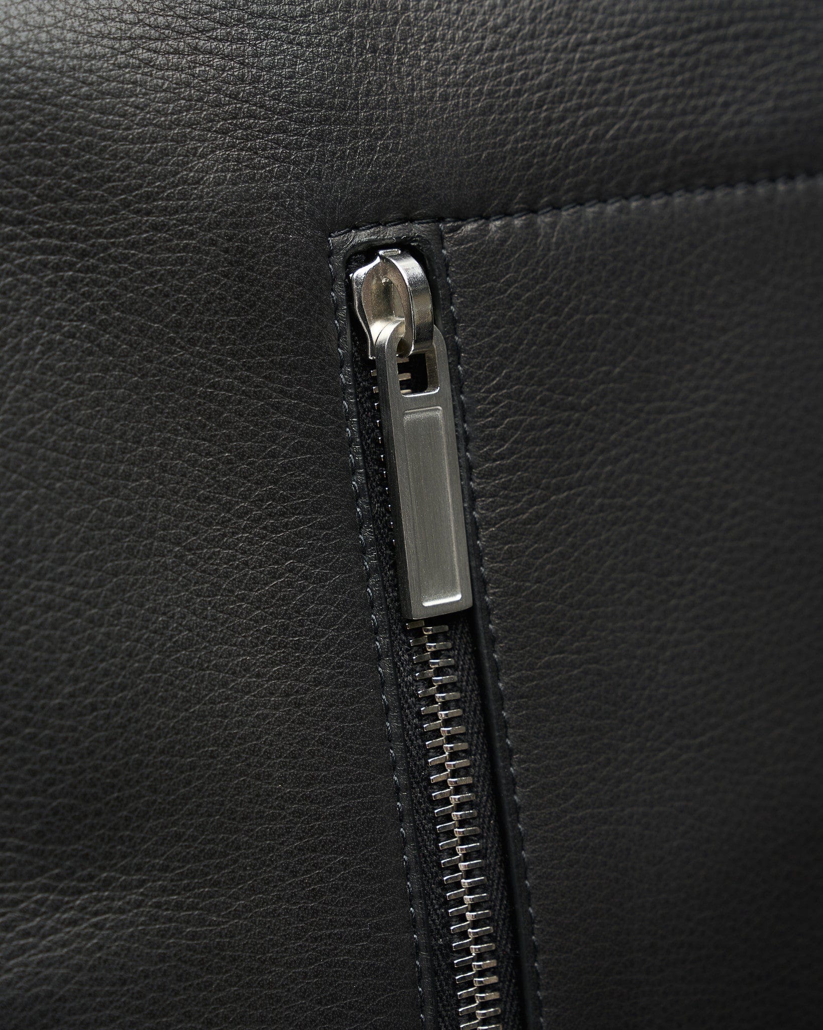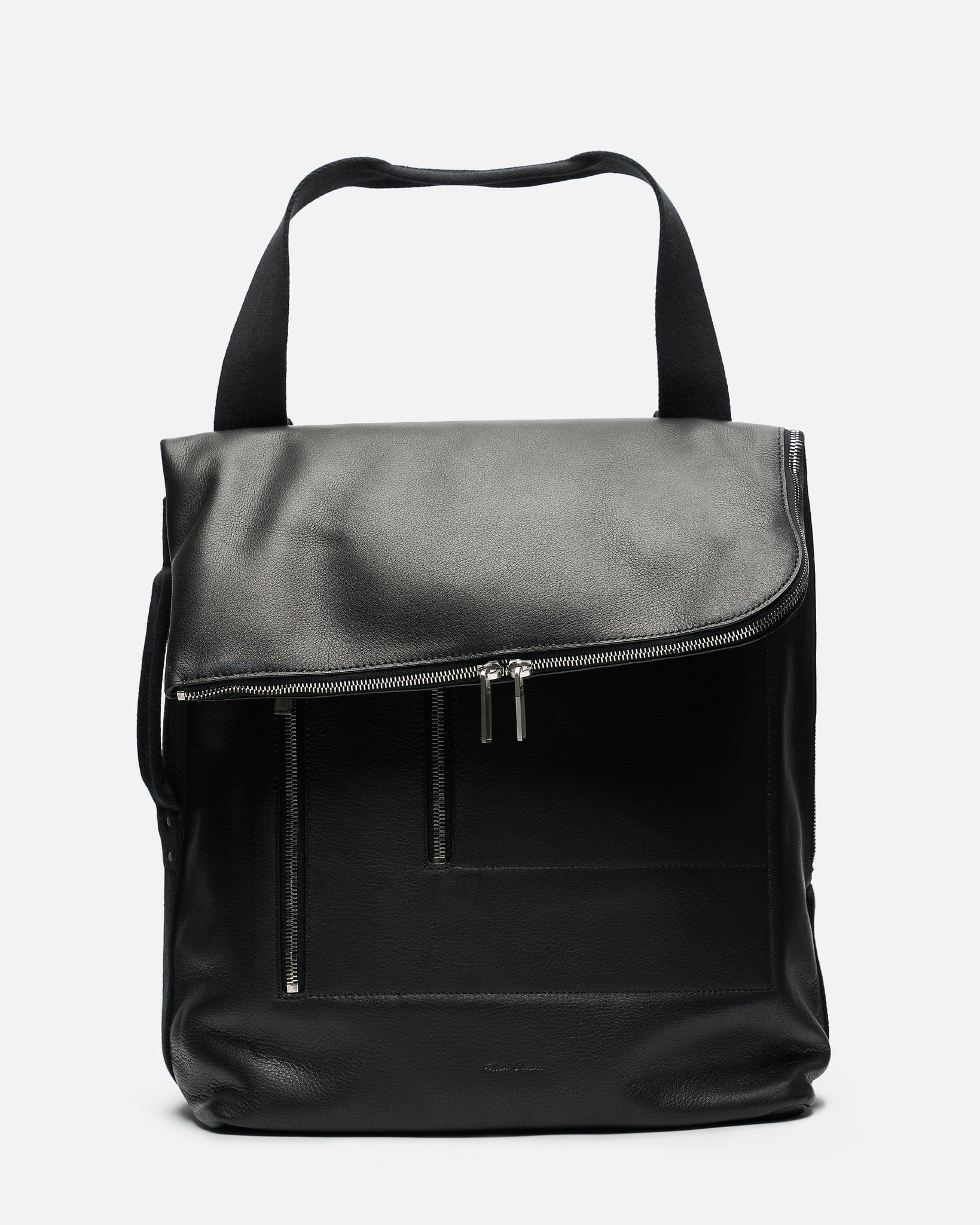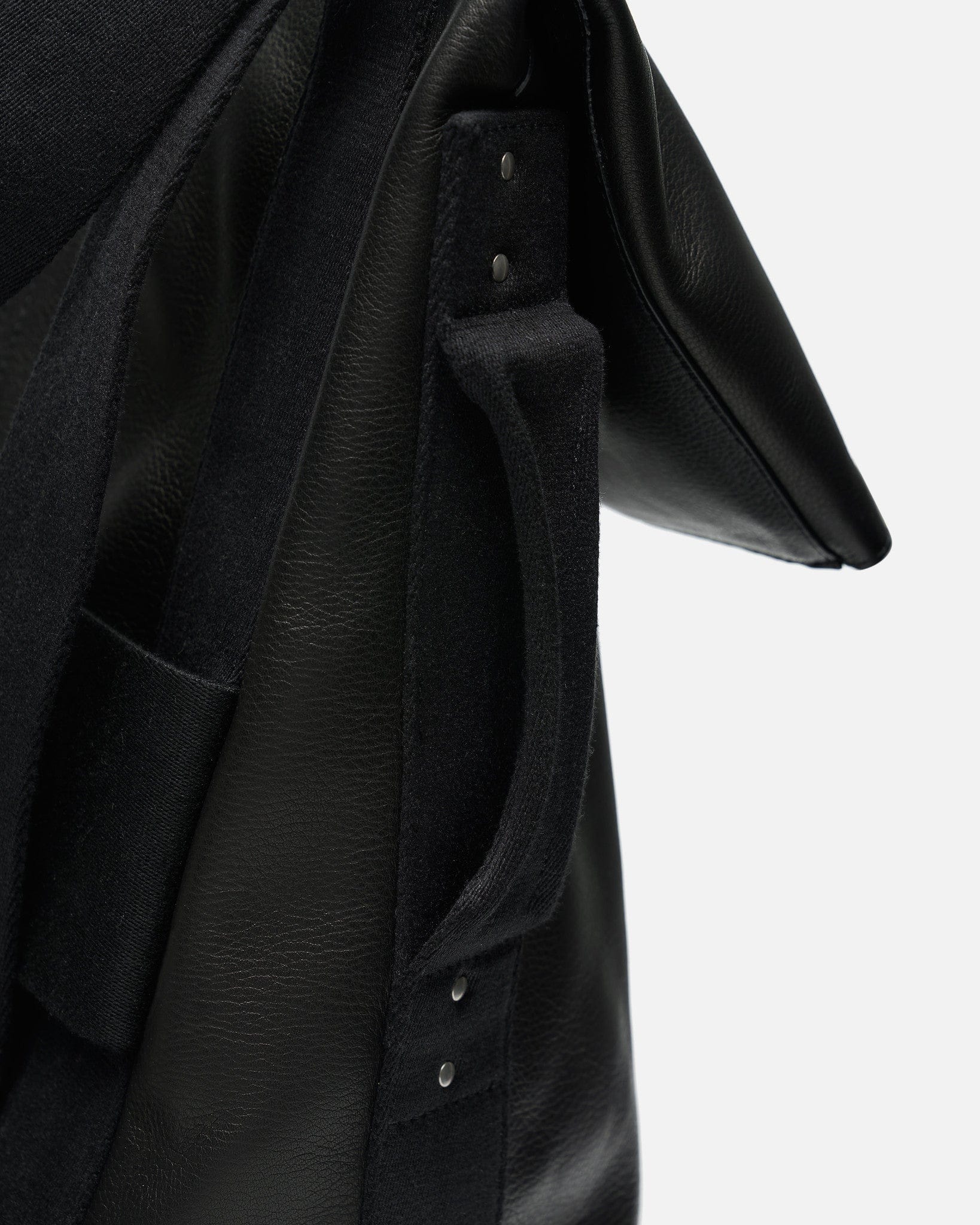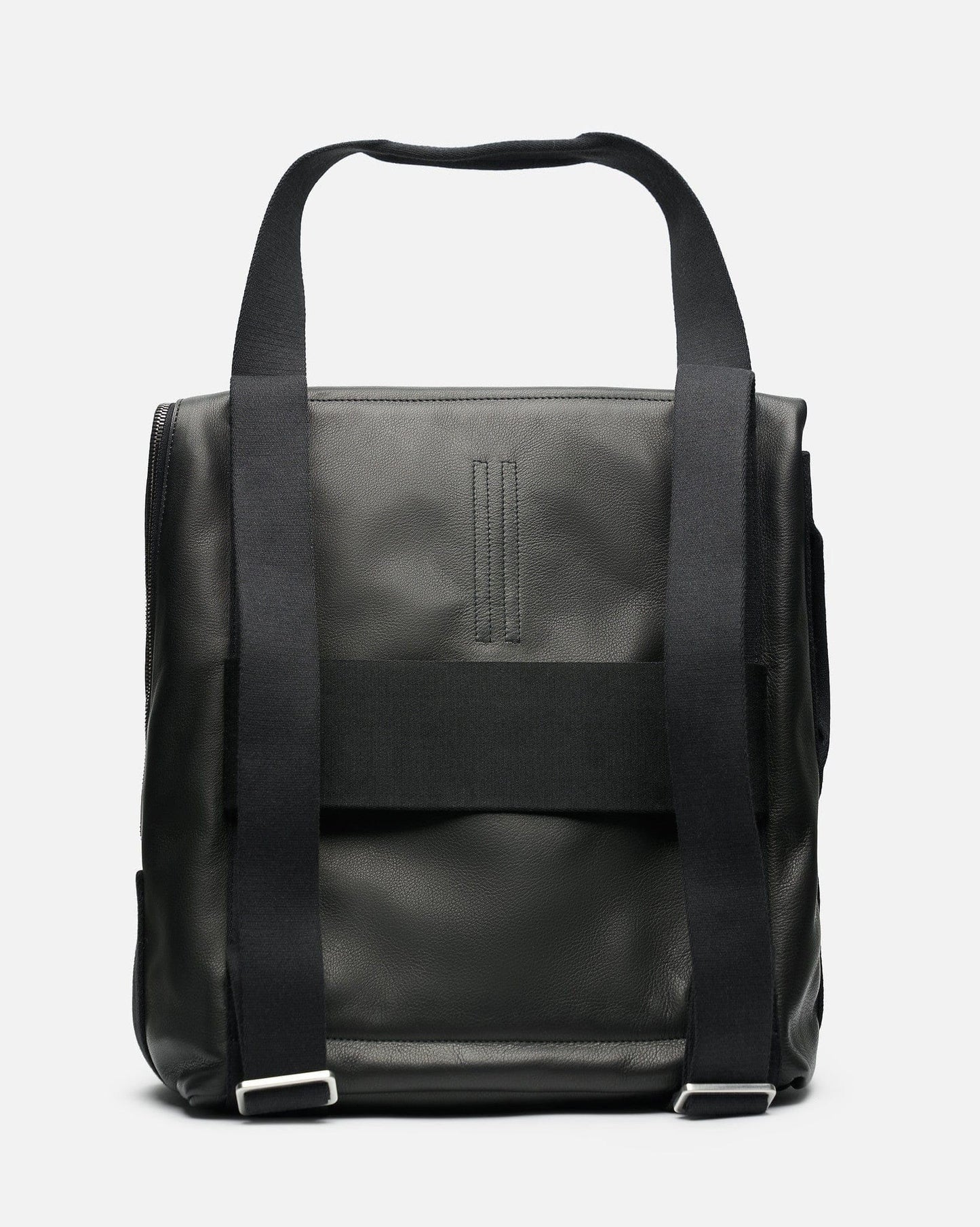 Rick Owens Cargo Backpack in Black/Black. This bag is crafted from calfskin grained leather and features a rolled carry handle, cotton webbing trim throughout, a main two-way zip compartment and secondary zip pockets at the face.