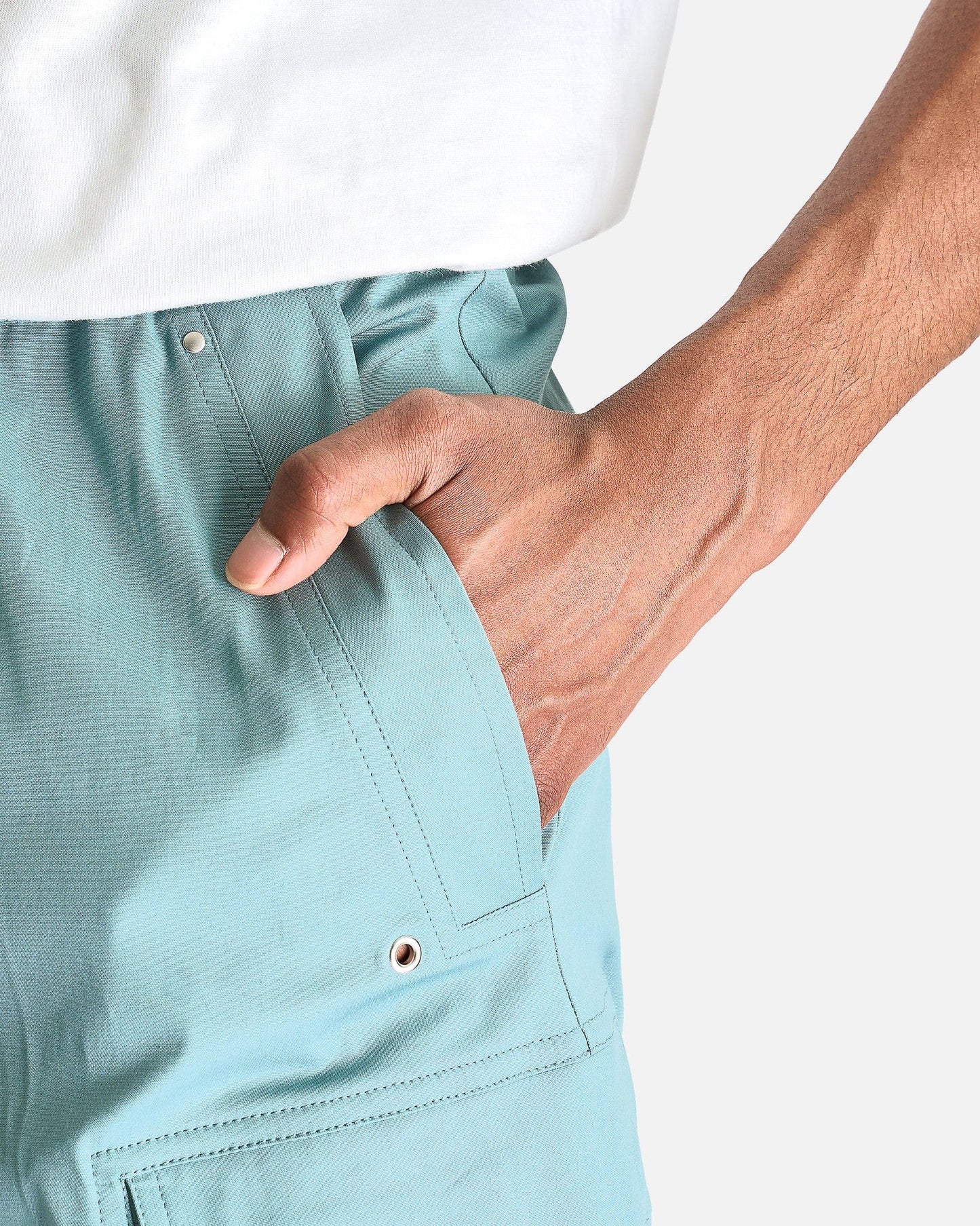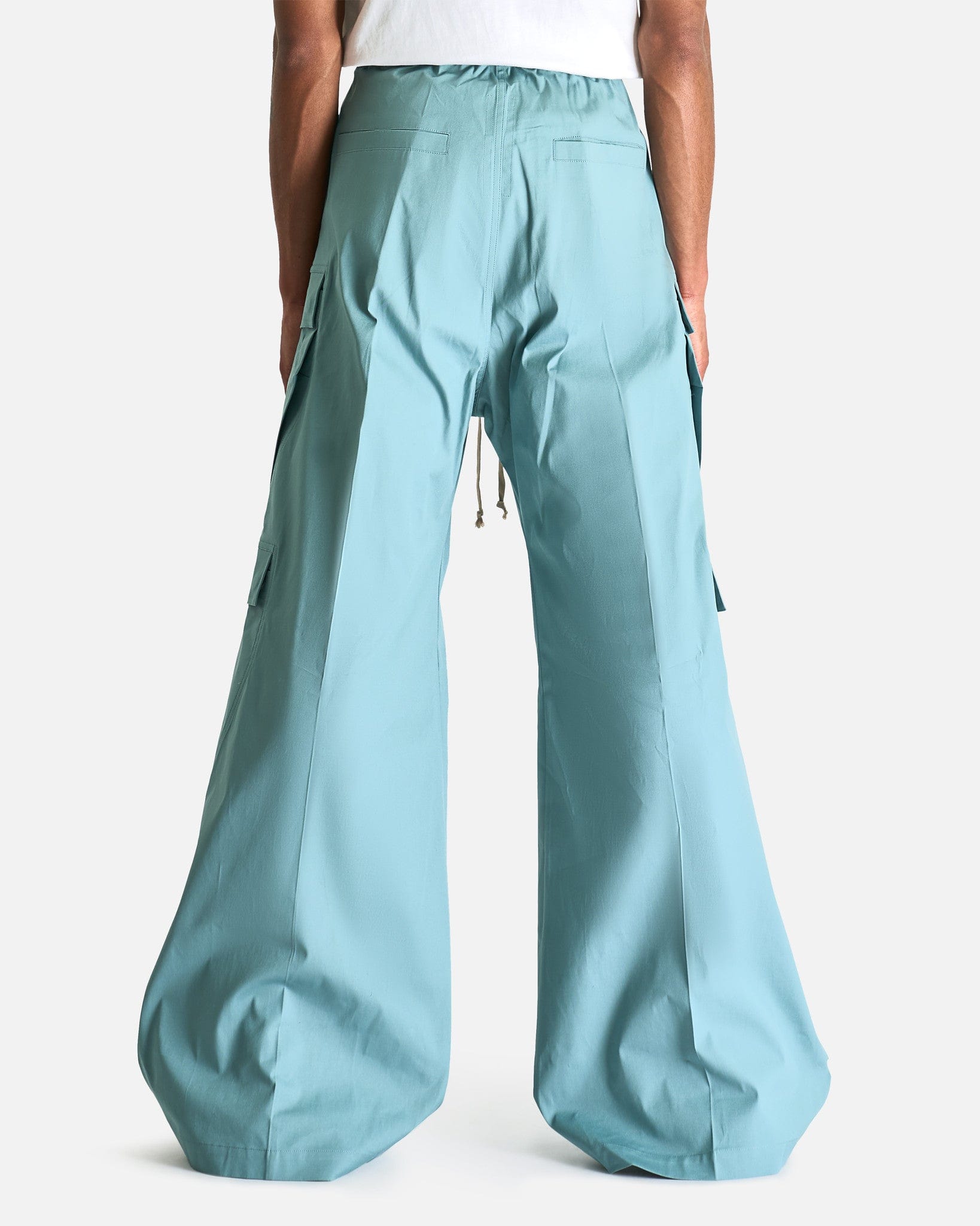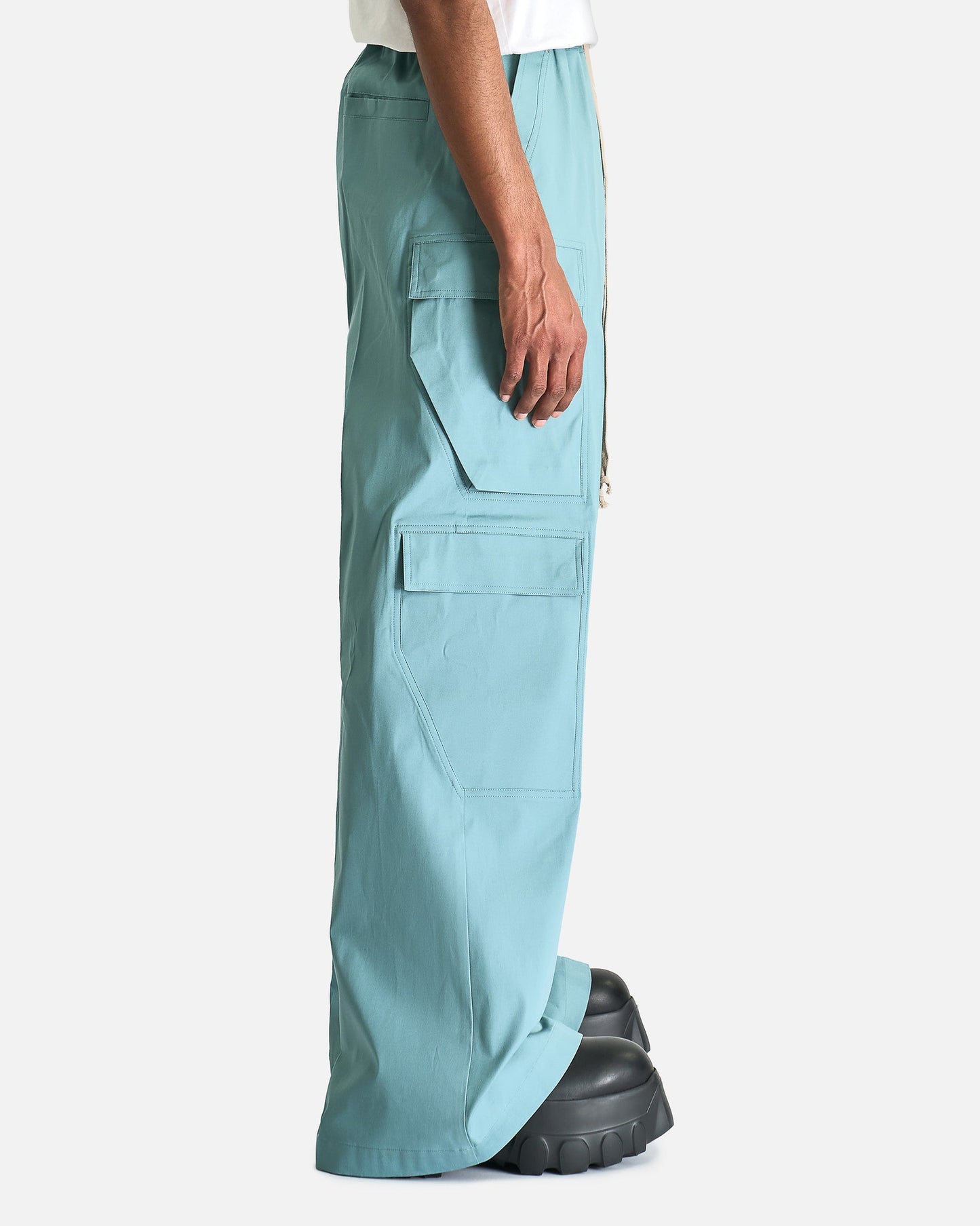 Rick Owens Cargobelas in Mouthwash. These pants are constructed from medium weight cotton poplin and feature an elasticized waist with drawstring, exposed zipper with snap button detail and beveled cargo pockets with snap button closure.