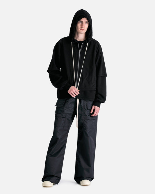 Rick Owens SS24 Lido Creatch Cargo Drawstring in Black. These pants feature an elasticated waist with drawstring, 2 side pockets, 2 overlayed front cargo pockets with side belt straps with signature stitching and 2 back pockets with flaps.