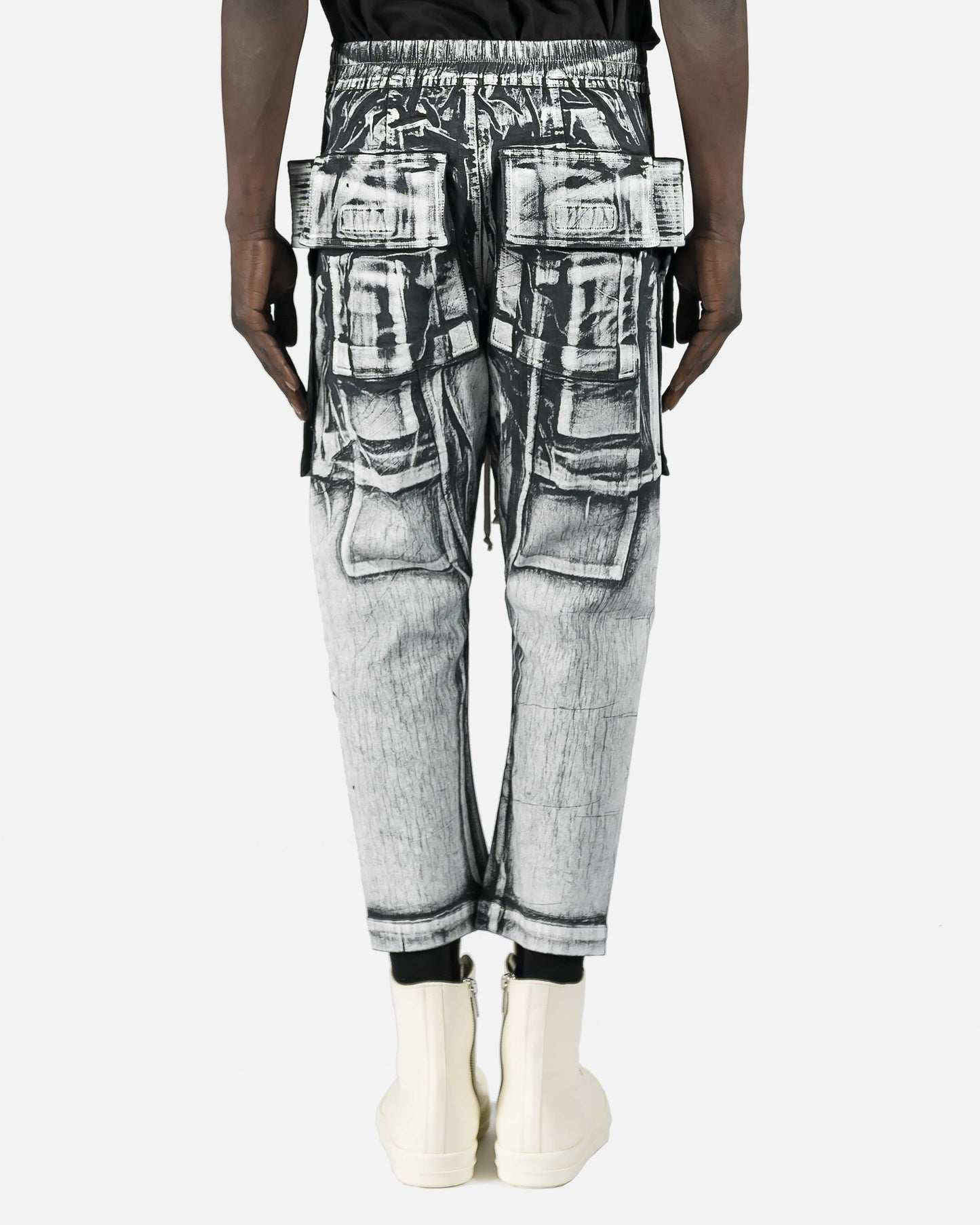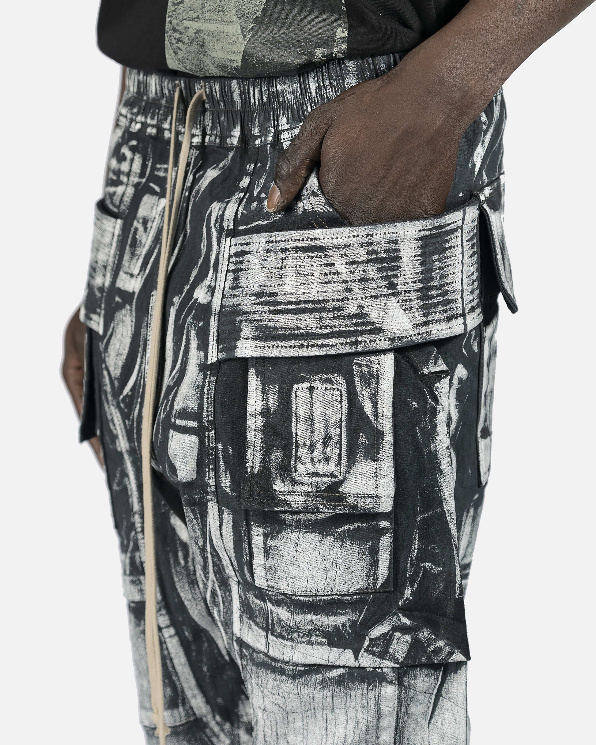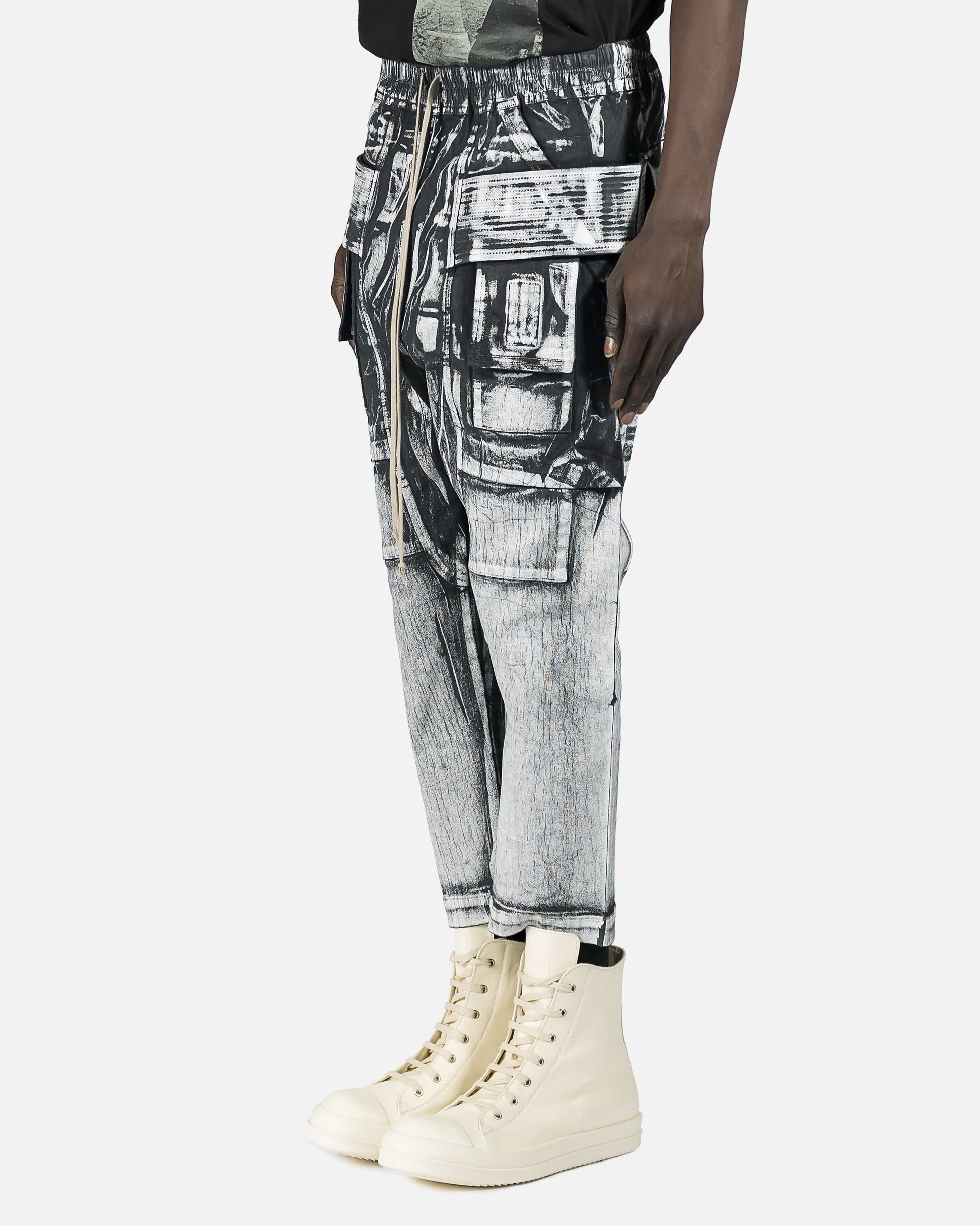 Tapered denim cargo pants in Milk & Black painted effect. Mid-rise. Six-pocket styling. Drawstring at elasticized waistband. Tonal ribbed trim.