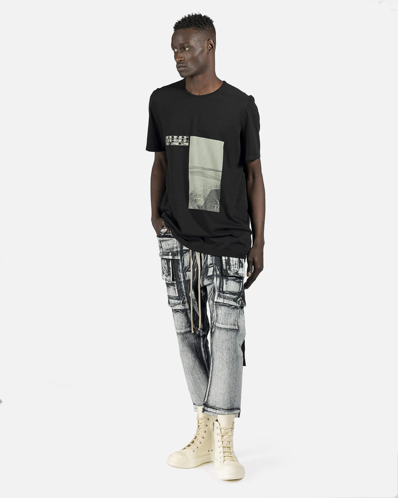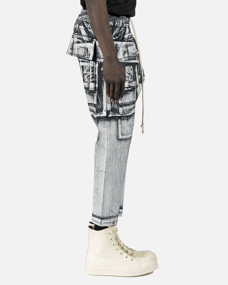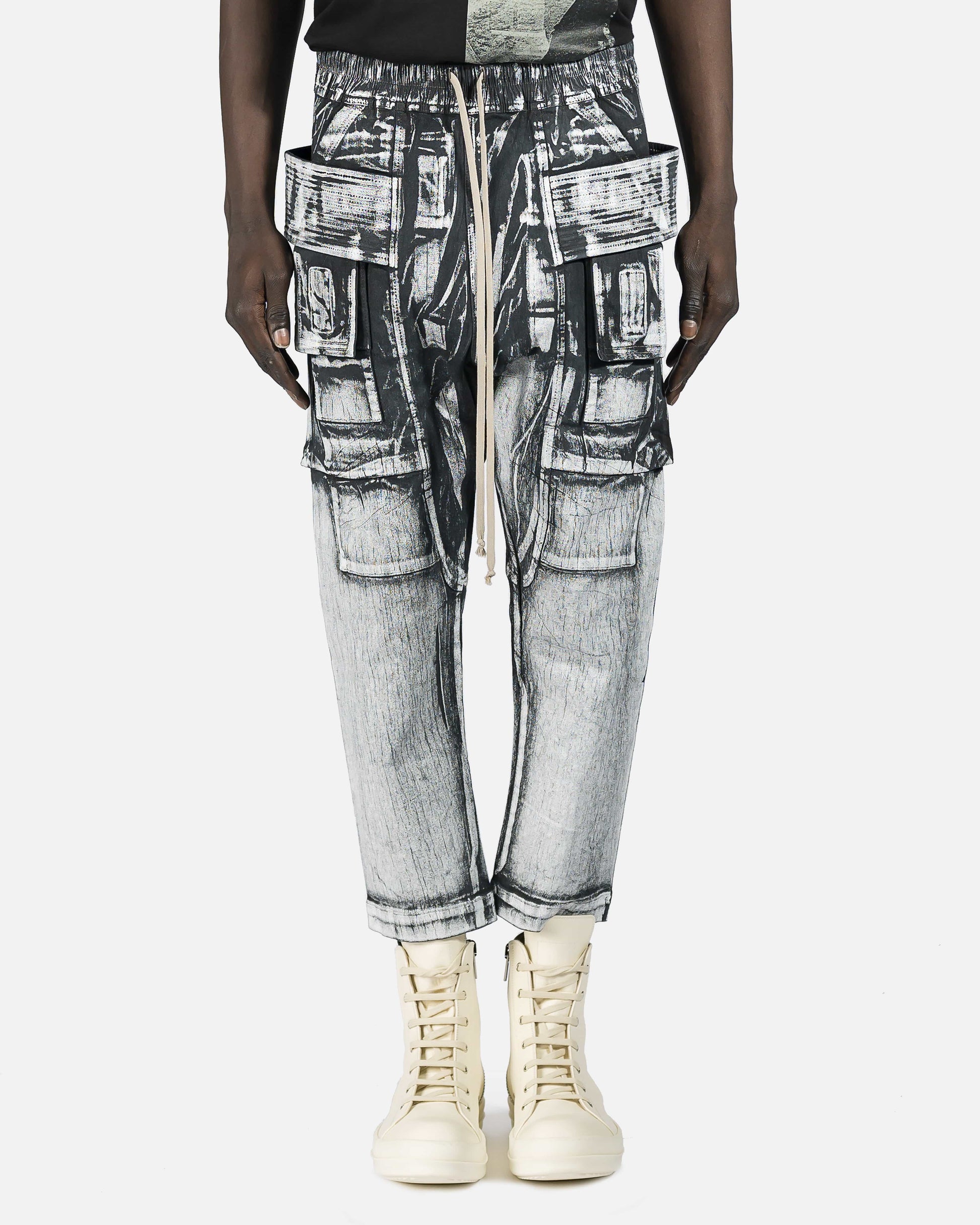 Tapered denim cargo pants in Milk & Black painted effect. Mid-rise. Six-pocket styling. Drawstring at elasticized waistband. Tonal ribbed trim.
