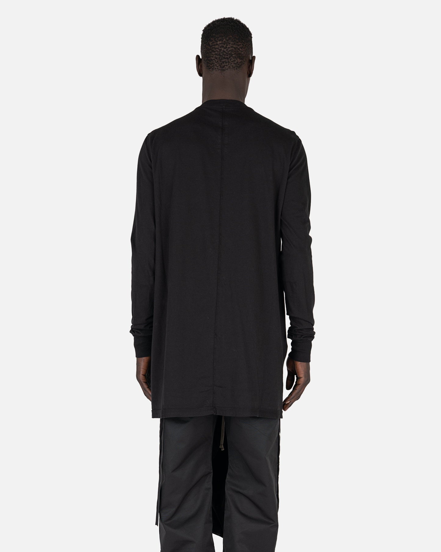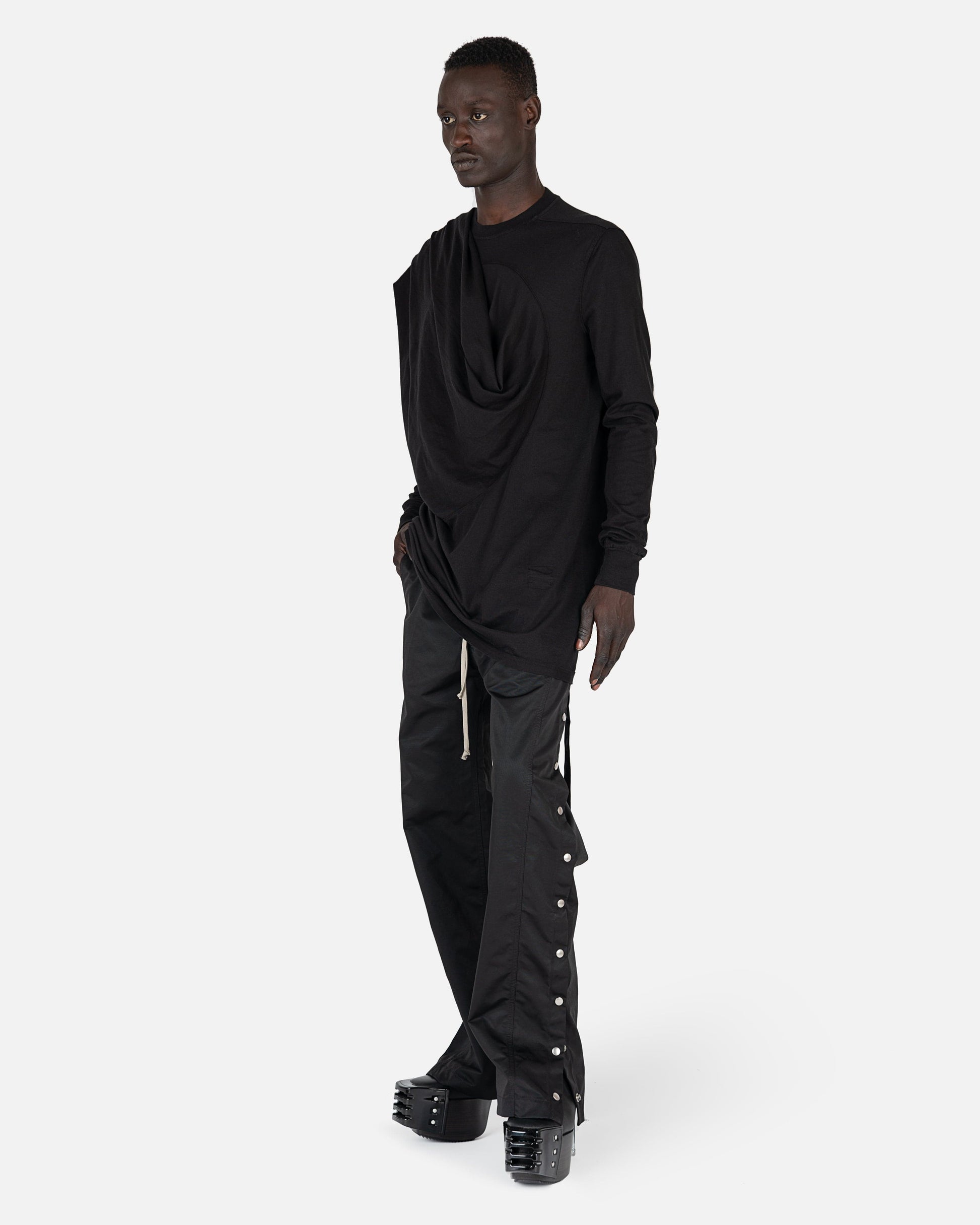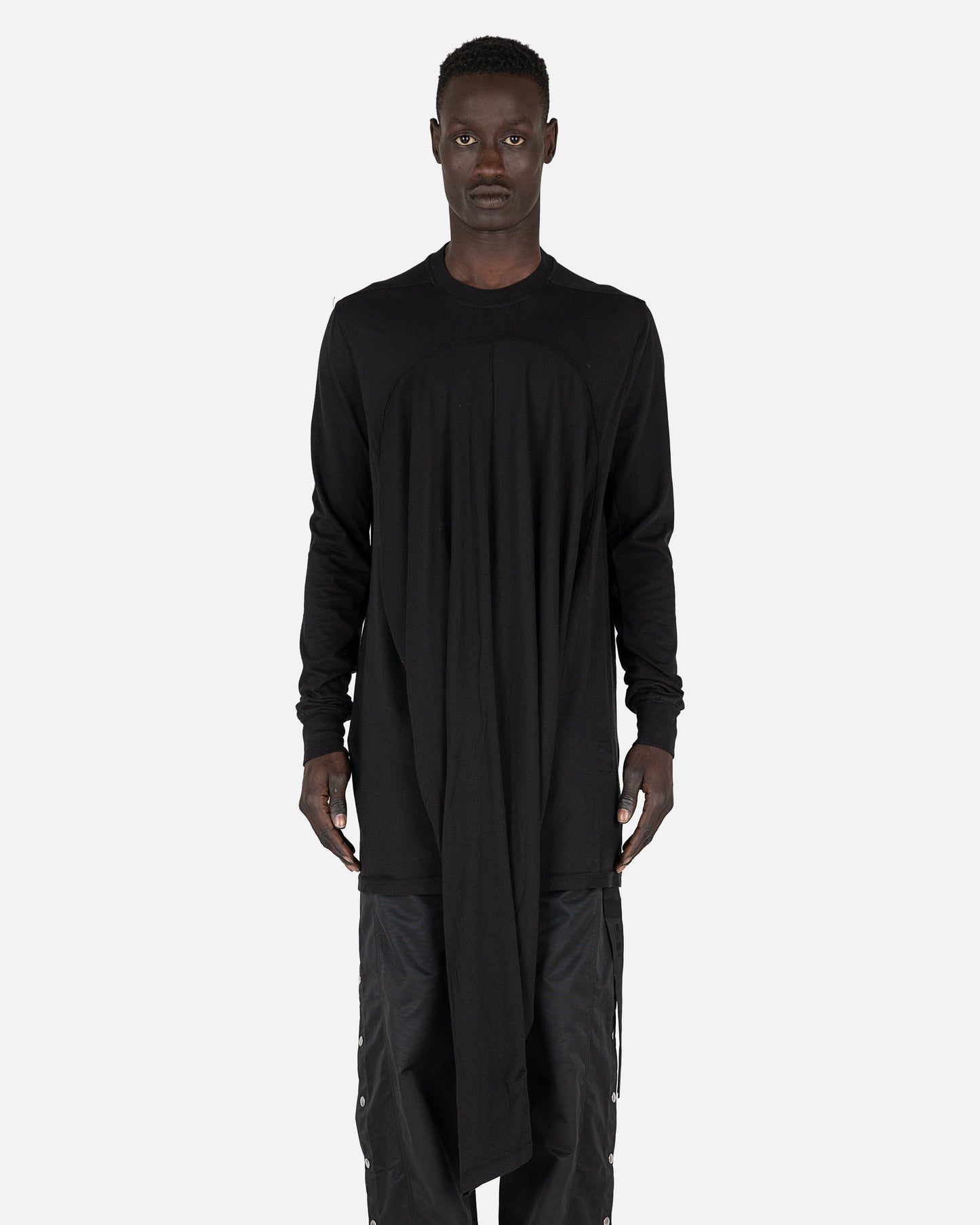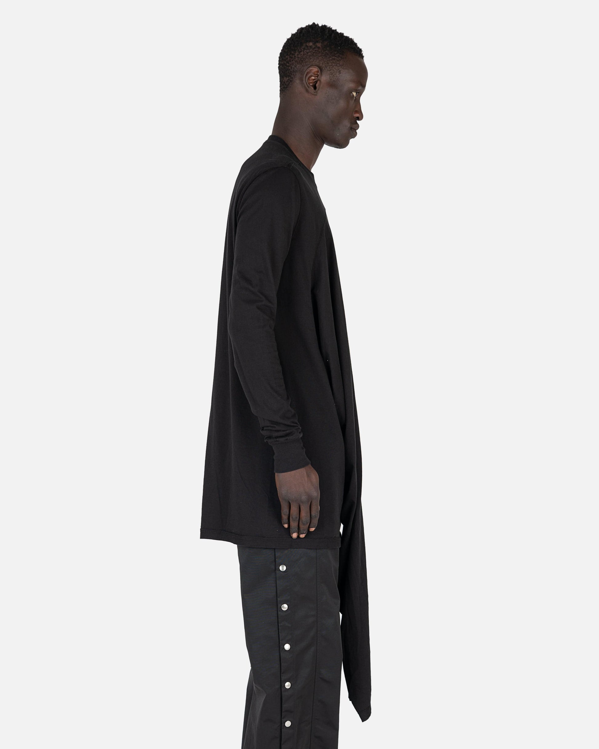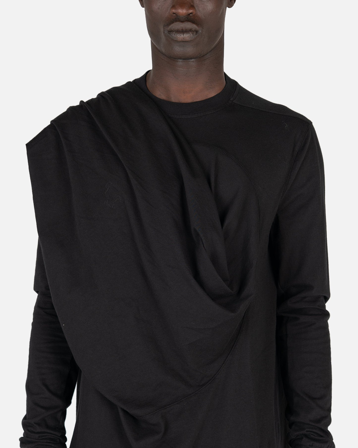 Rick Owens DRKSHDW men's long sleeve draped t-shirt in black. This shirt features a long, hollow draping piece along the front that can be styled in a multitude of ways.