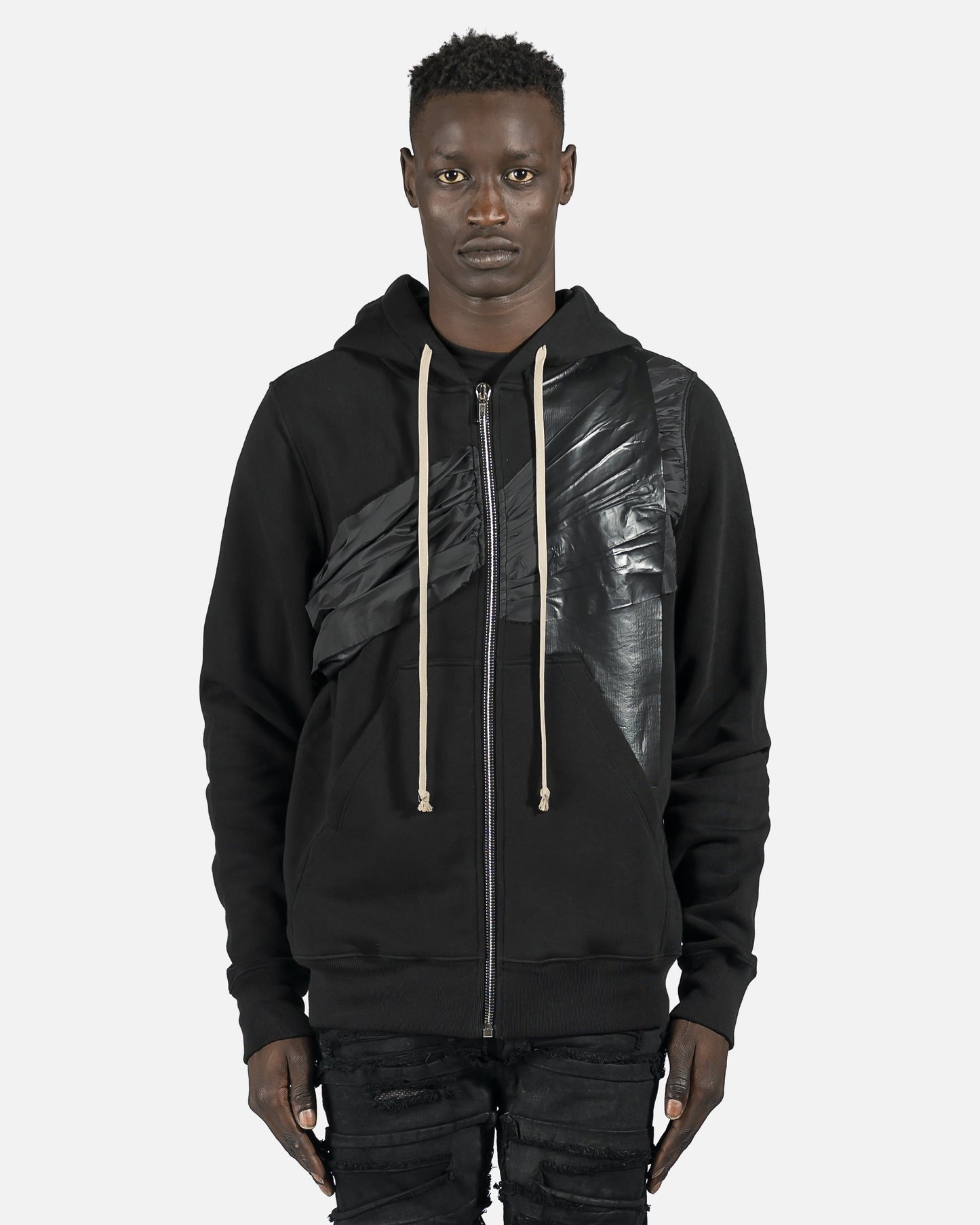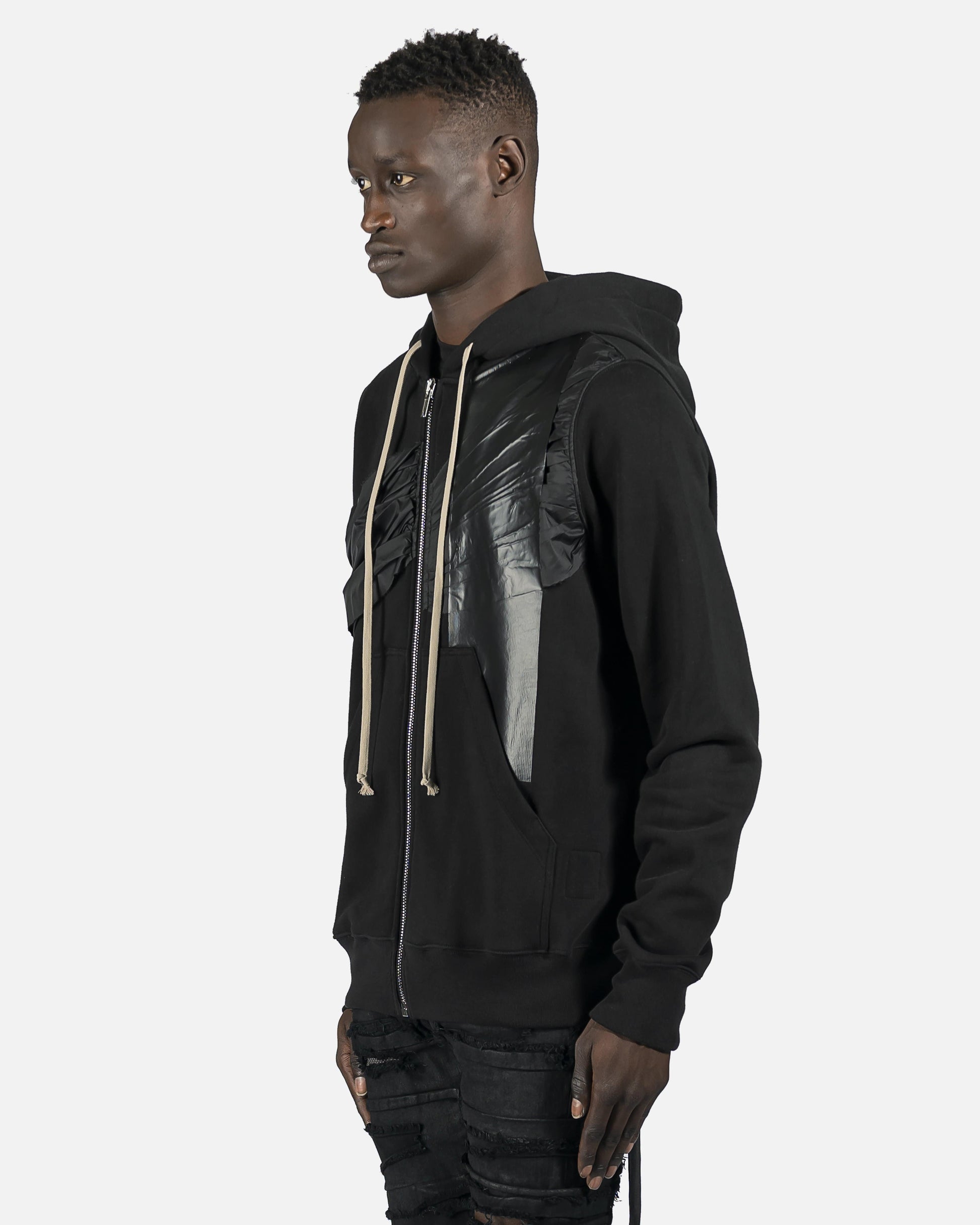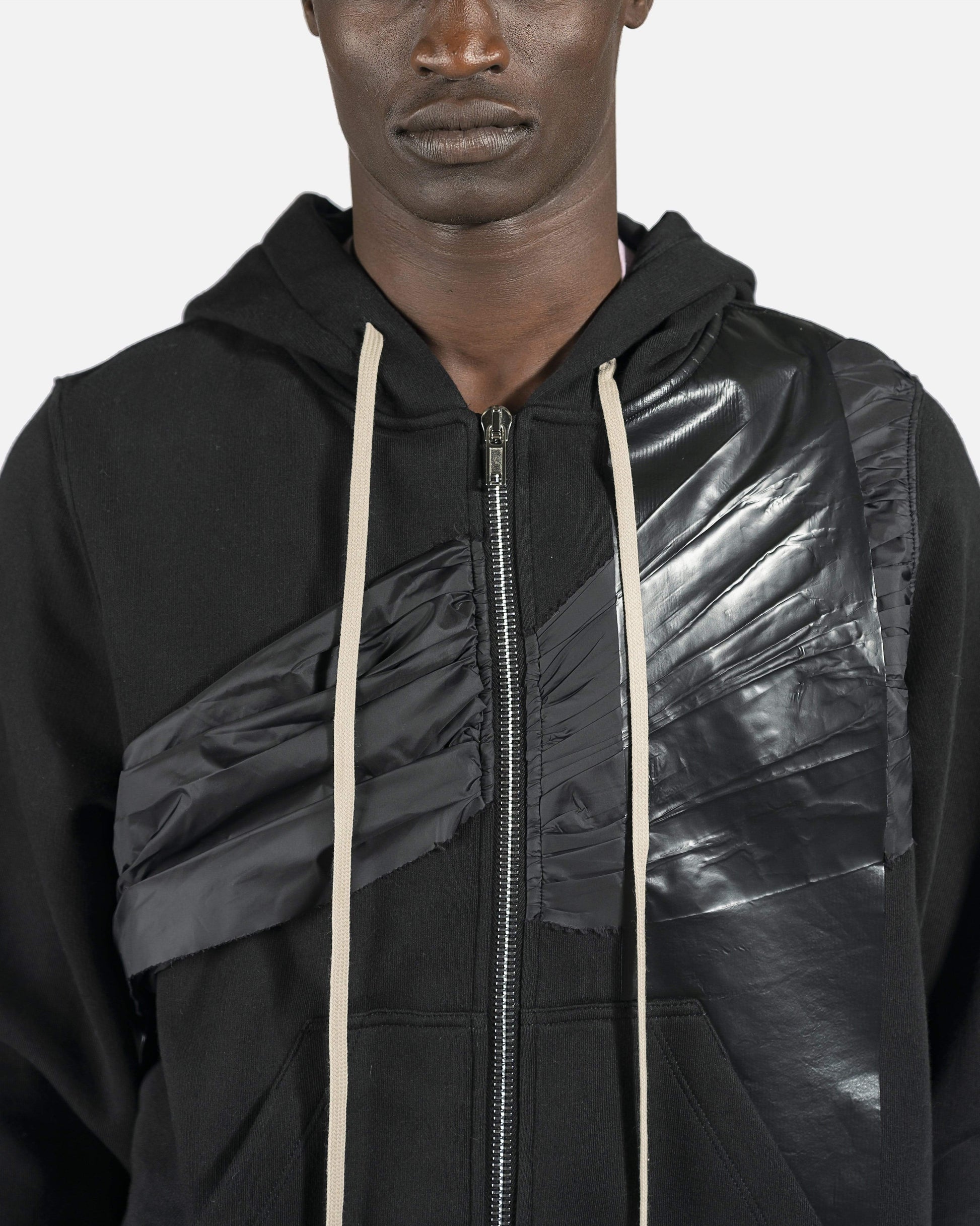 Long sleeve with cotton fleece lining. Nylon and coated embelishments. Natural drawstring at hood and zip closure at front. Patch pockets at waist with rib knit cuffs and hem. Silver-tone hardware.