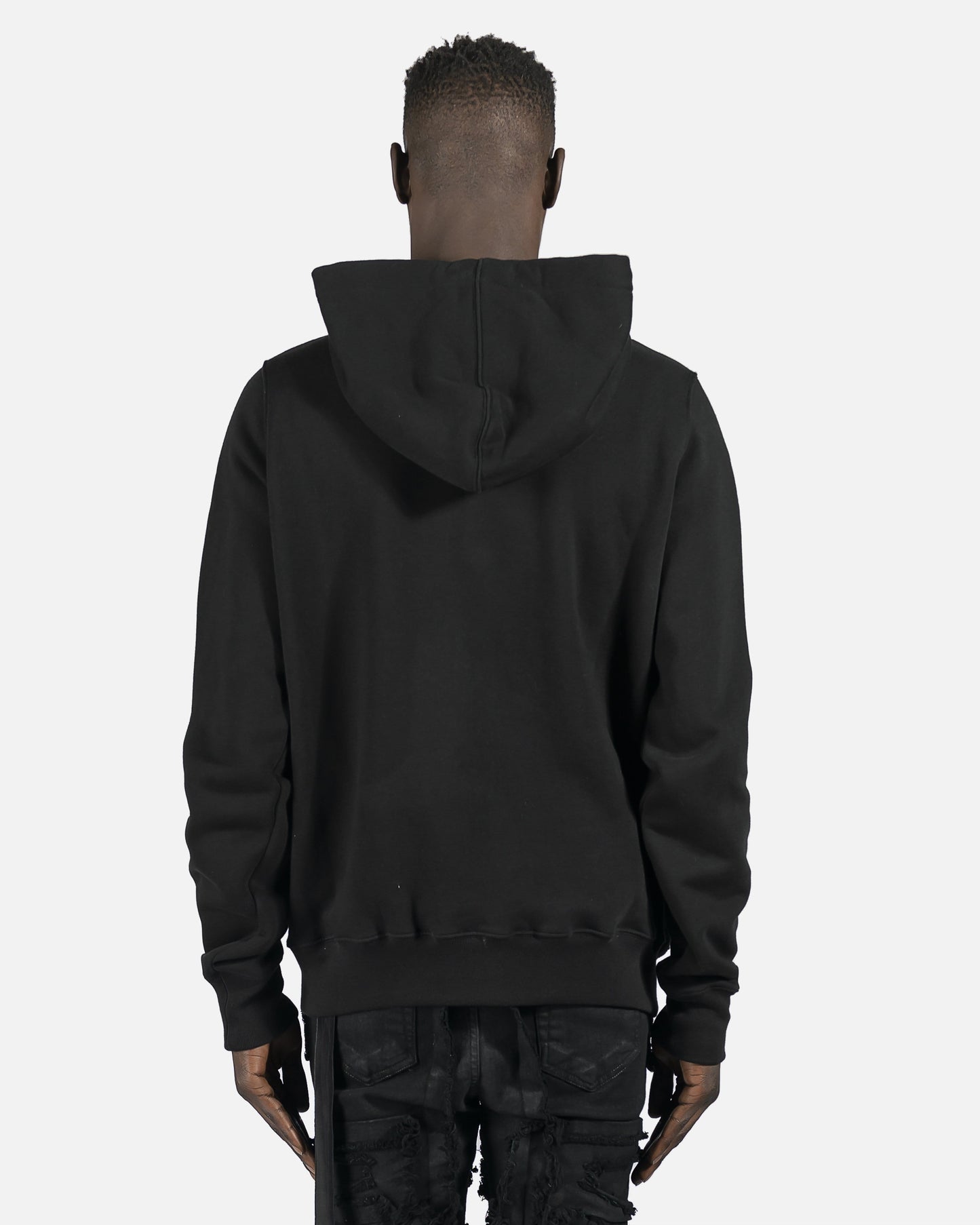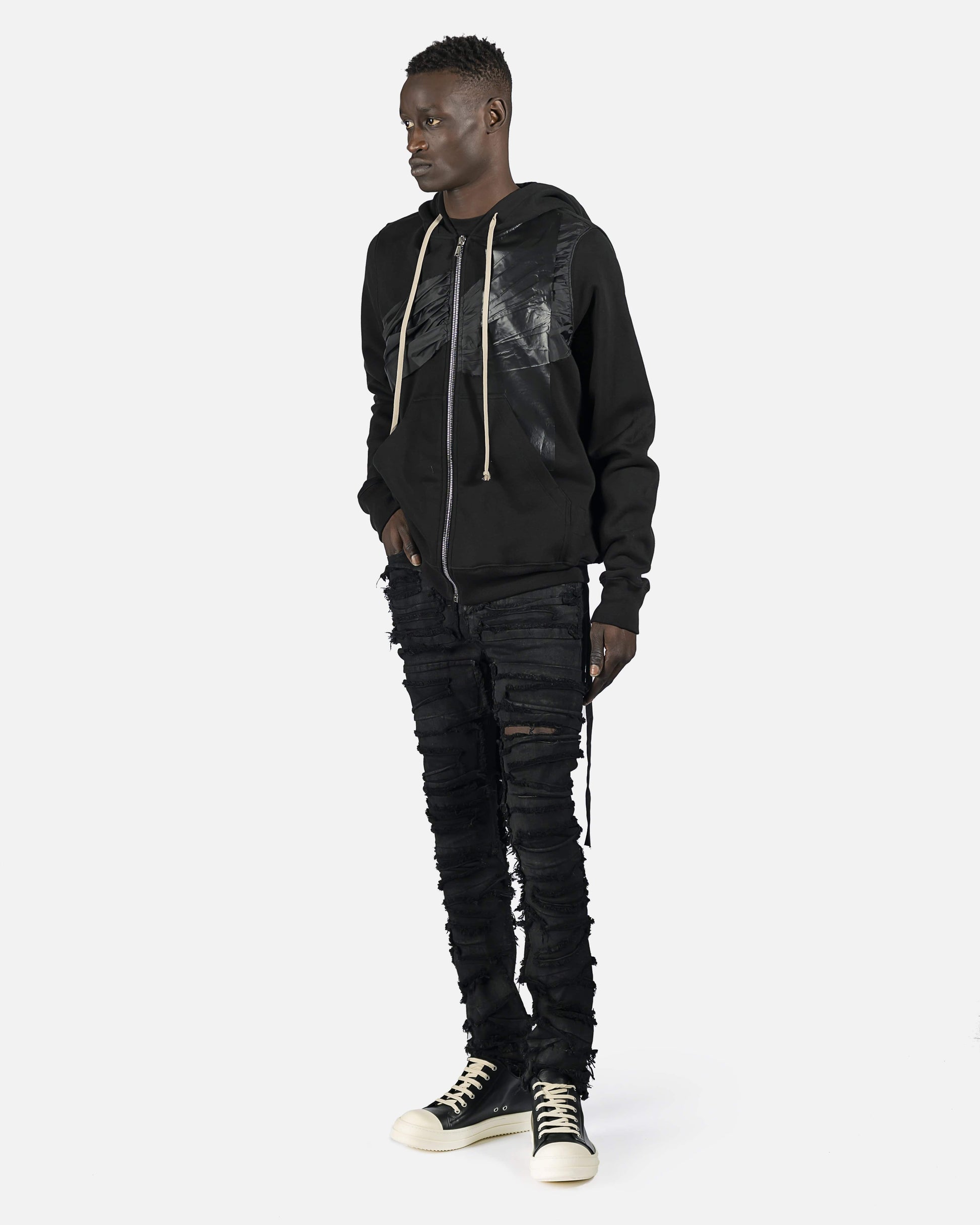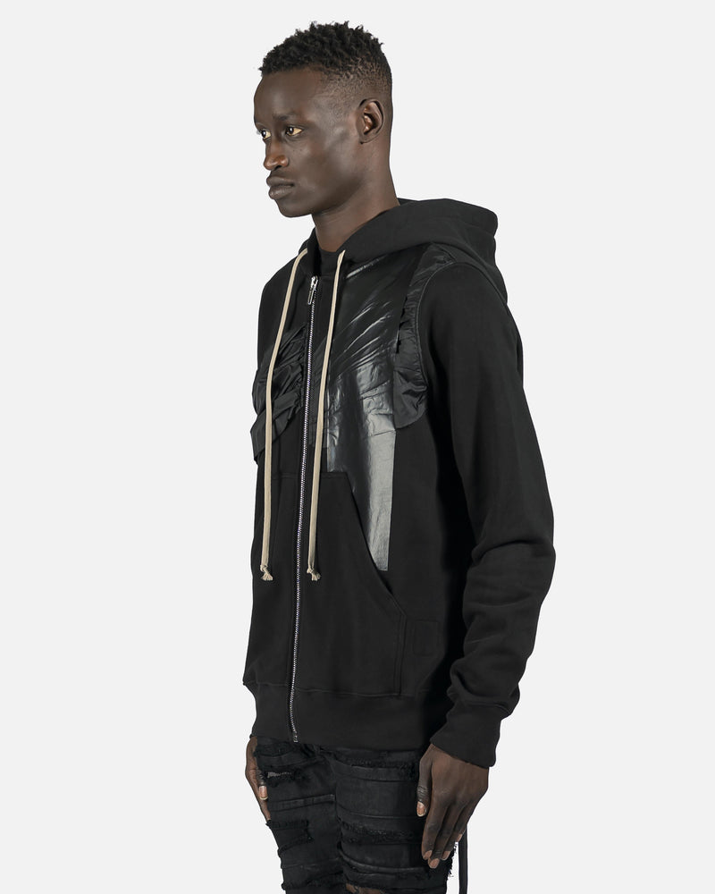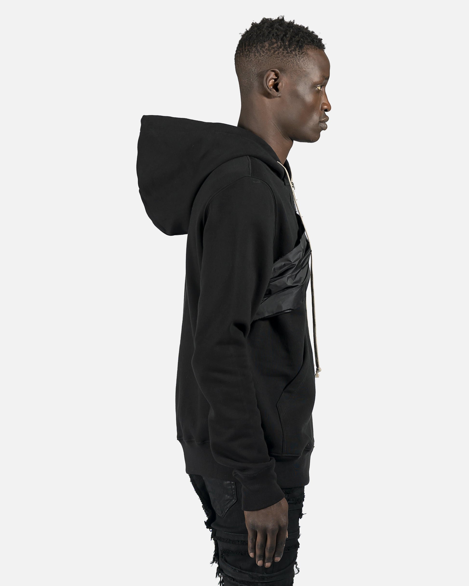 Long sleeve with cotton fleece lining. Nylon and coated embelishments. Natural drawstring at hood and zip closure at front. Patch pockets at waist with rib knit cuffs and hem. Silver-tone hardware.