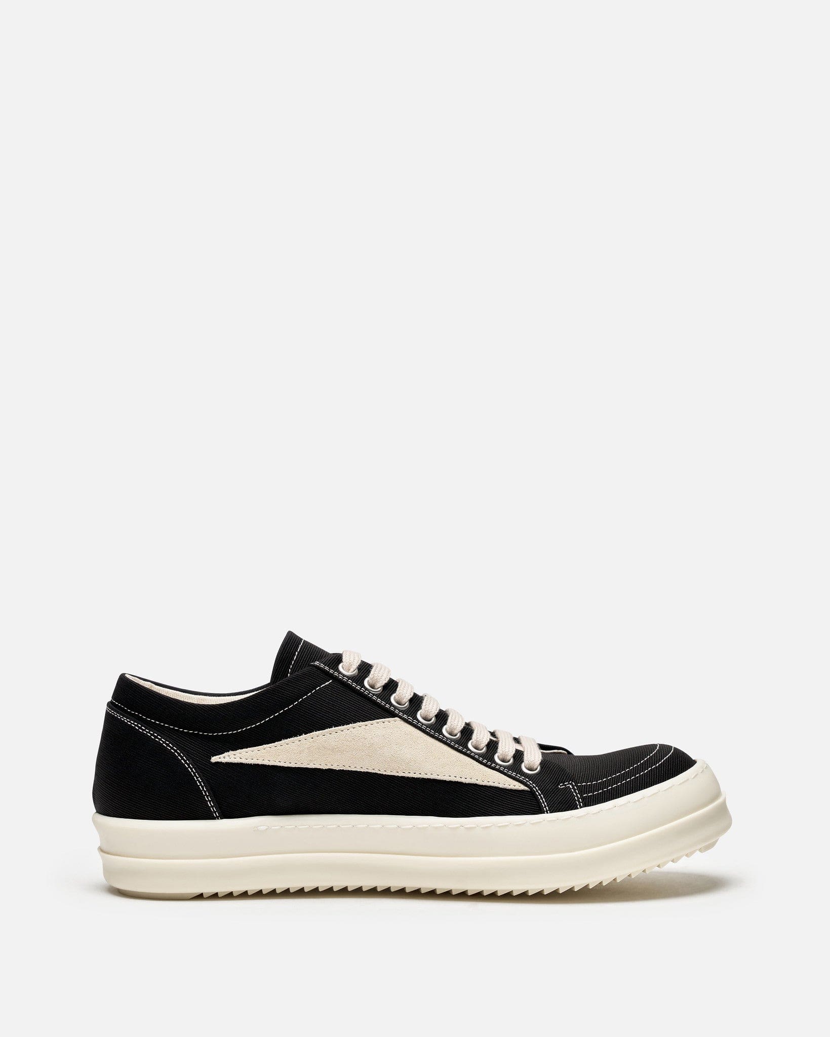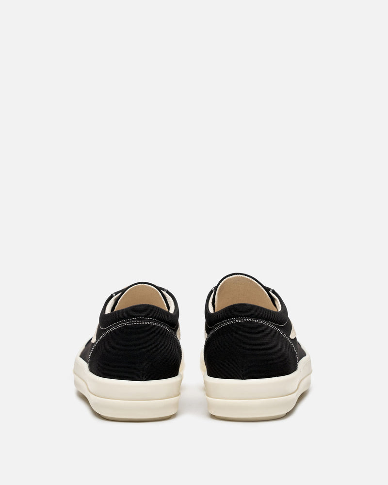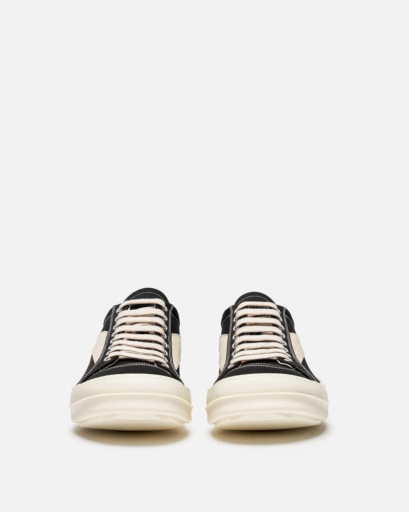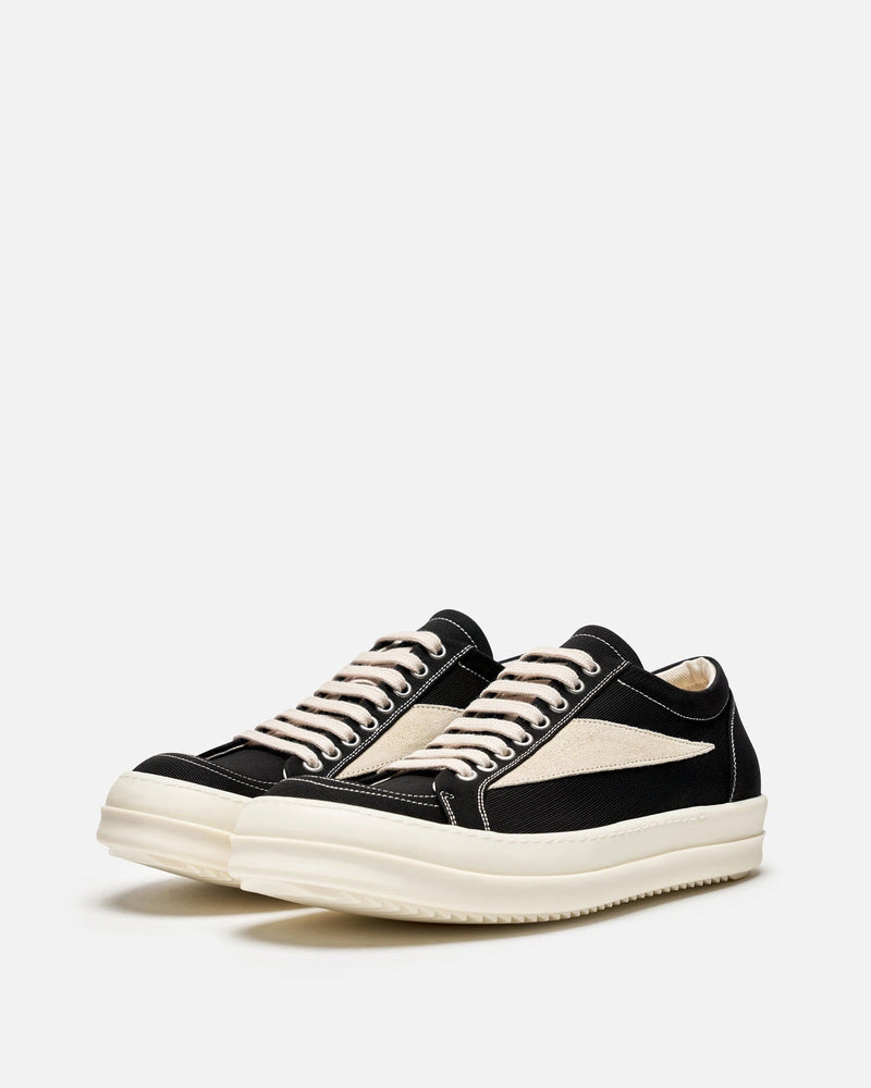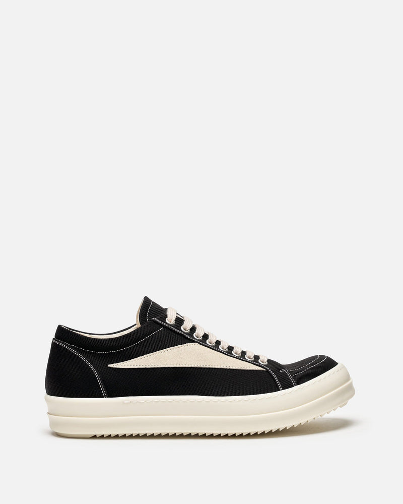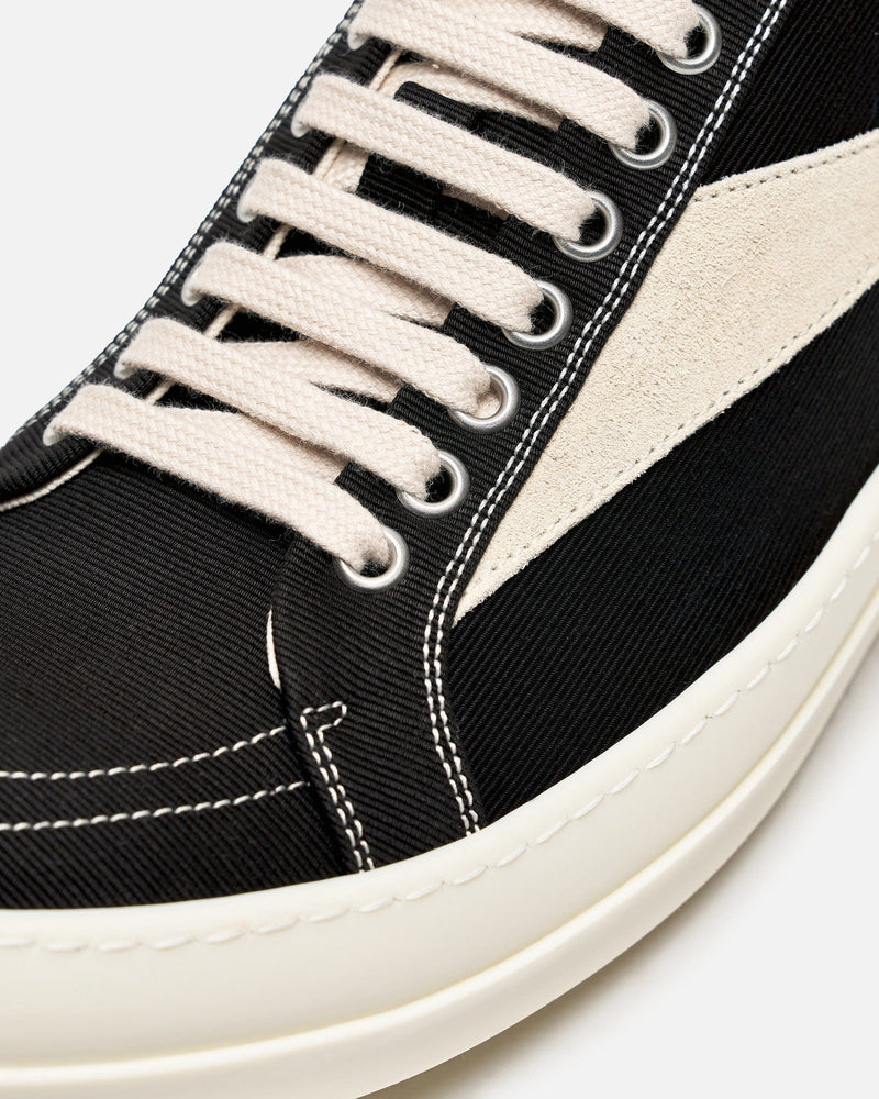 Rick Owens DRKSHDW Lido Vintage Sneakers in Black/Milk/Milk. These shoes feature a lace-up closure, graphic leather applique on the side, round toe and shark tooth soles. The stretch denim is overdyed with a clear foil overlay that creates a waxy touch.