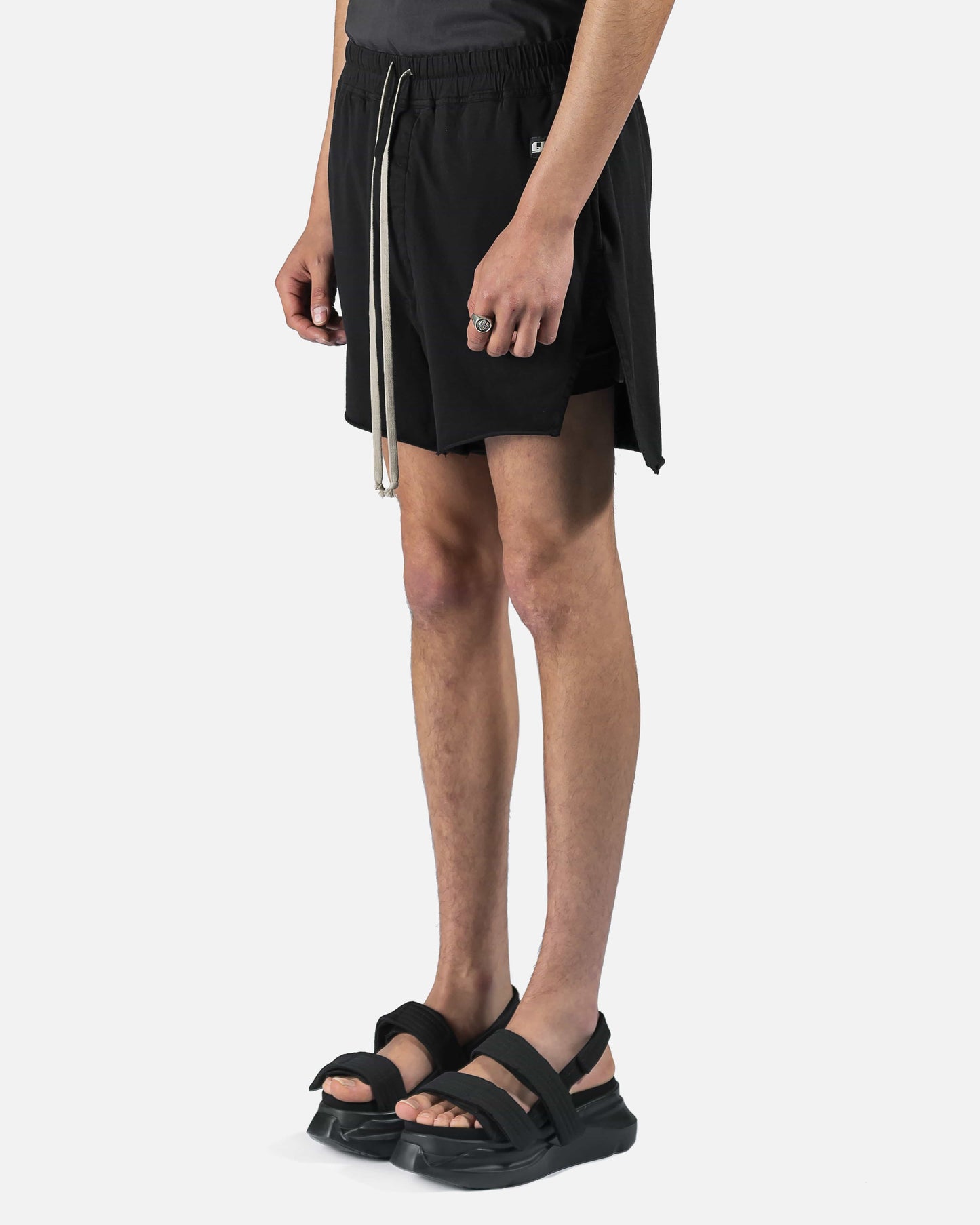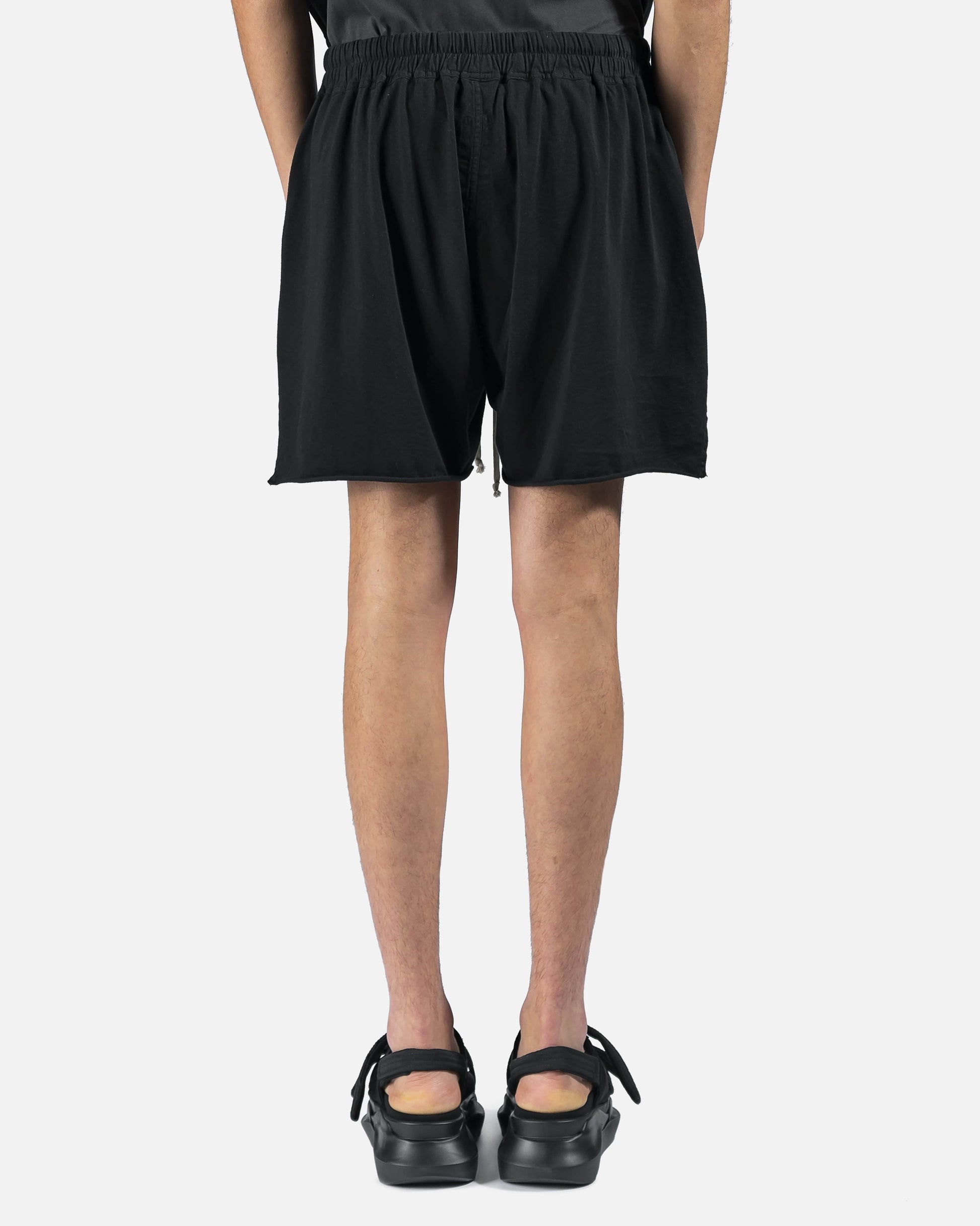 Garment-dyed cotton jersey shorts in black. Mid-rise. Two-pocket styling. Drawstring at elasticized waistband. Tonal extended logo-woven webbing trim at back waistband. Textile logo patch at front. Vented outseams. Raw edge at cuffs. Button-fly. Tonal hardware.