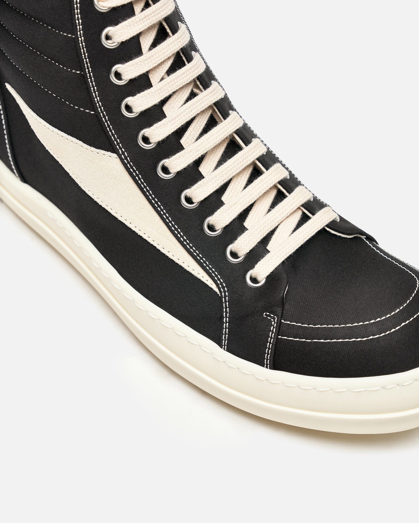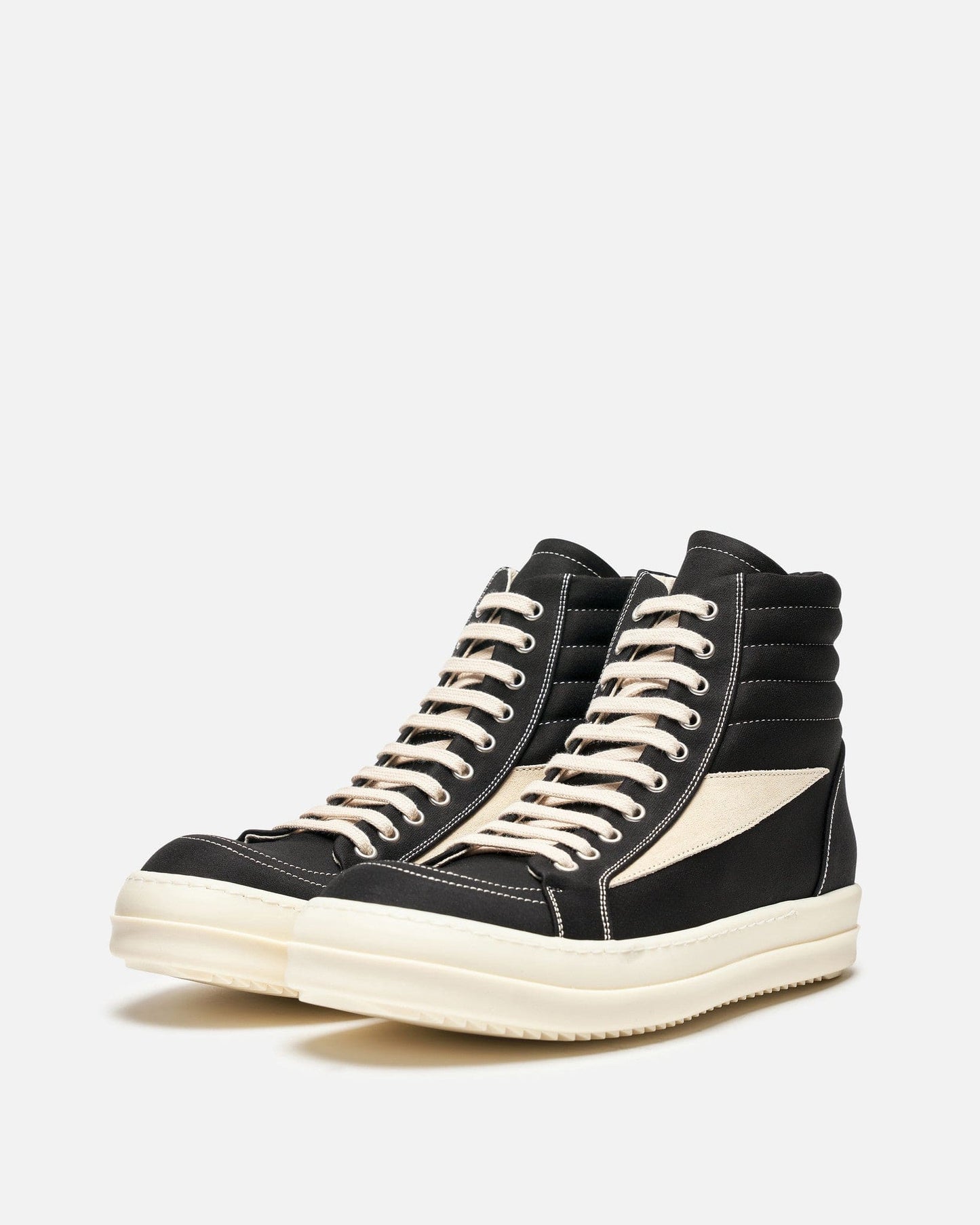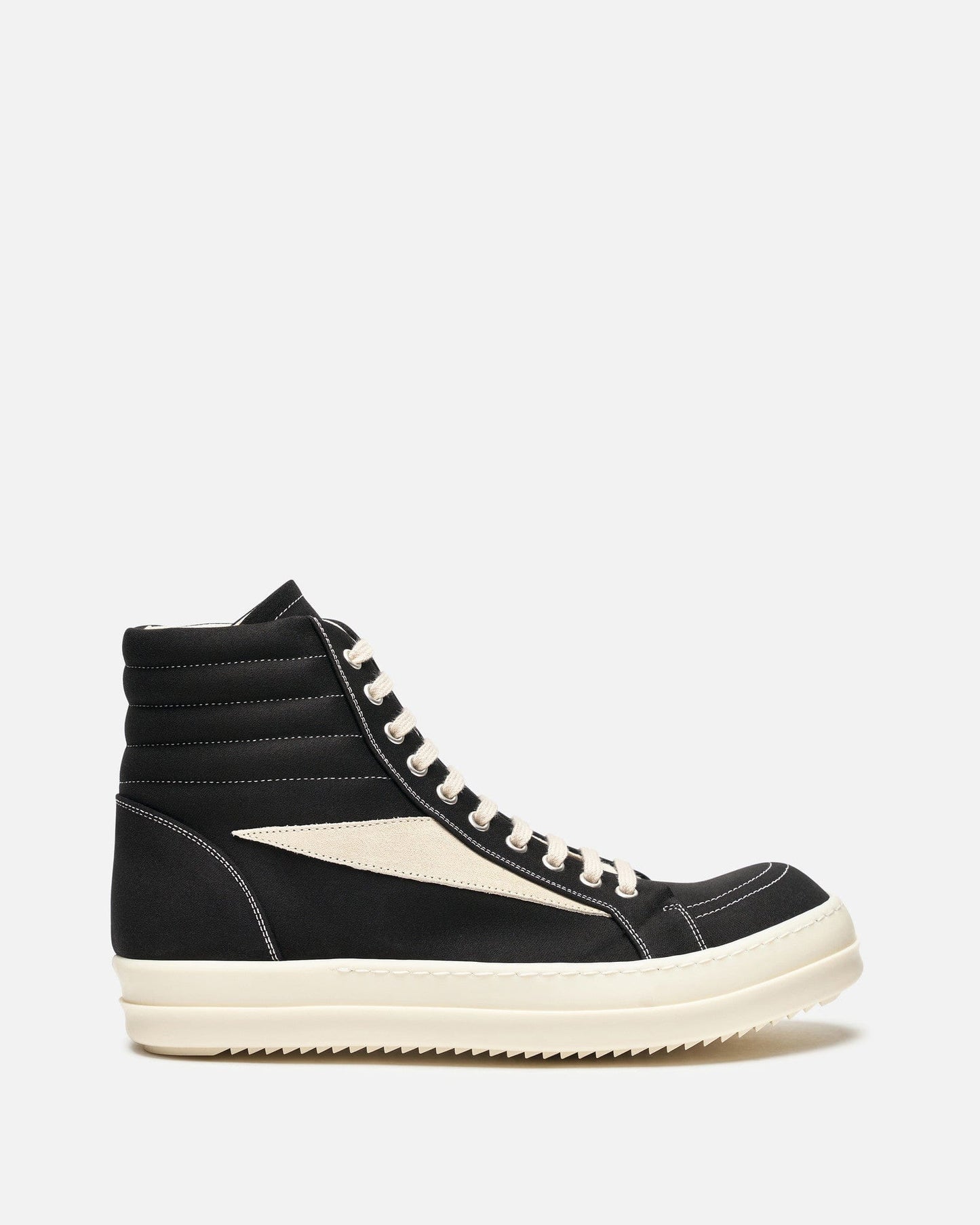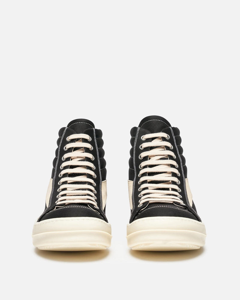 Rick Owens DRKSHDW SS24 Lido Vintage Sneakers High in Black/Milk. These sneakers feature outlined stitching at the heel, padded ankles with contrast stitching, a graphic leather applique on the sides and shark tooth soles.