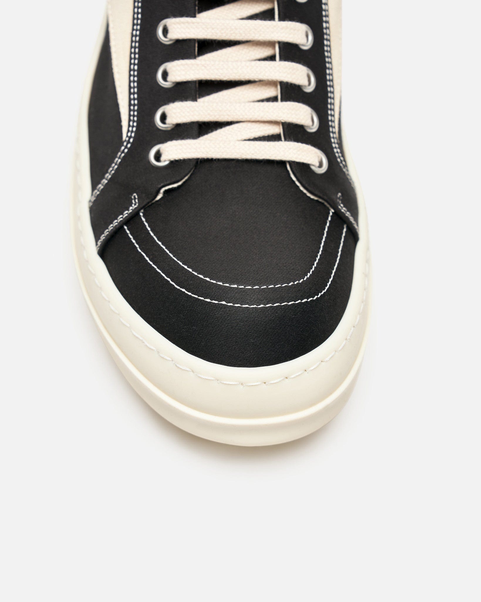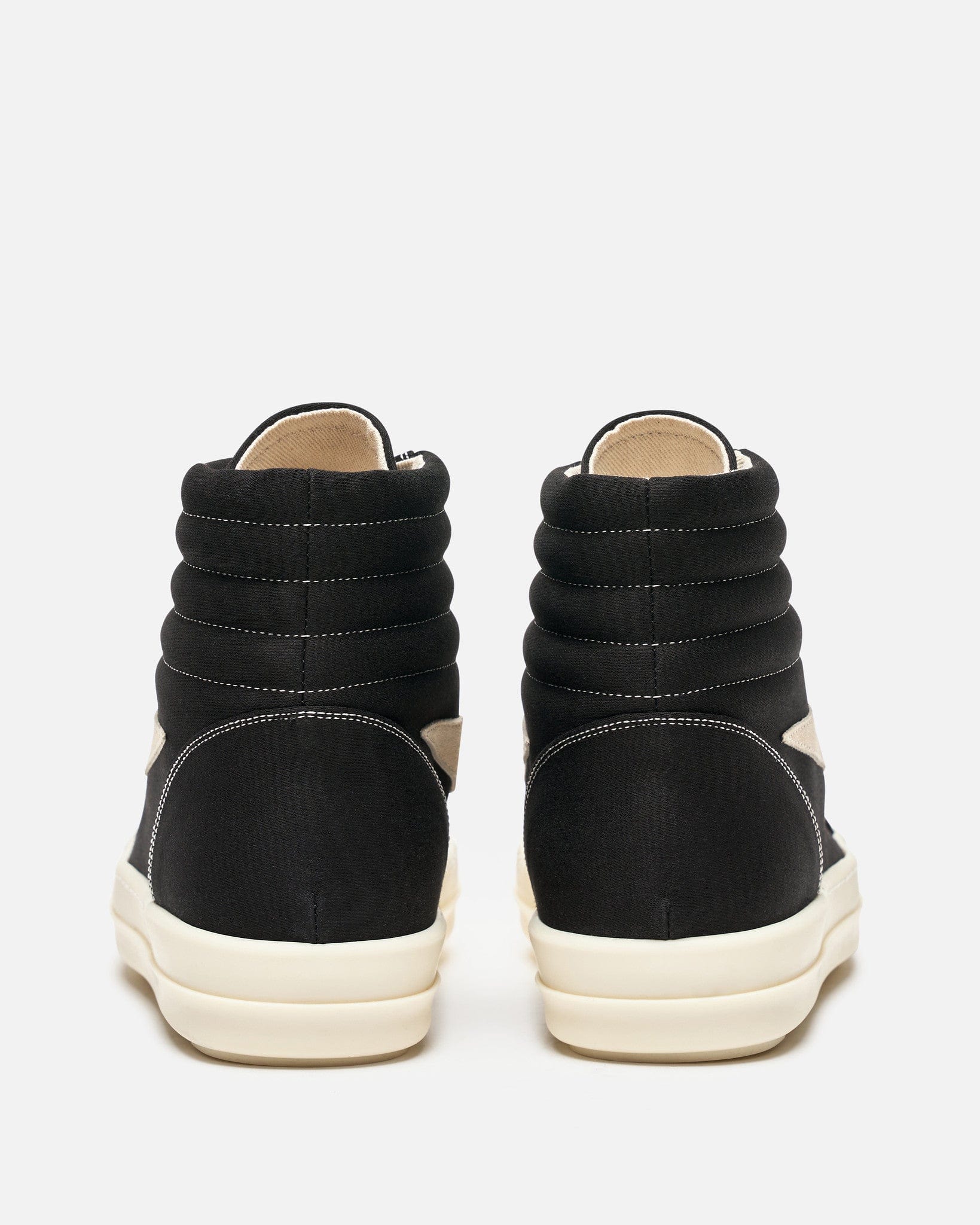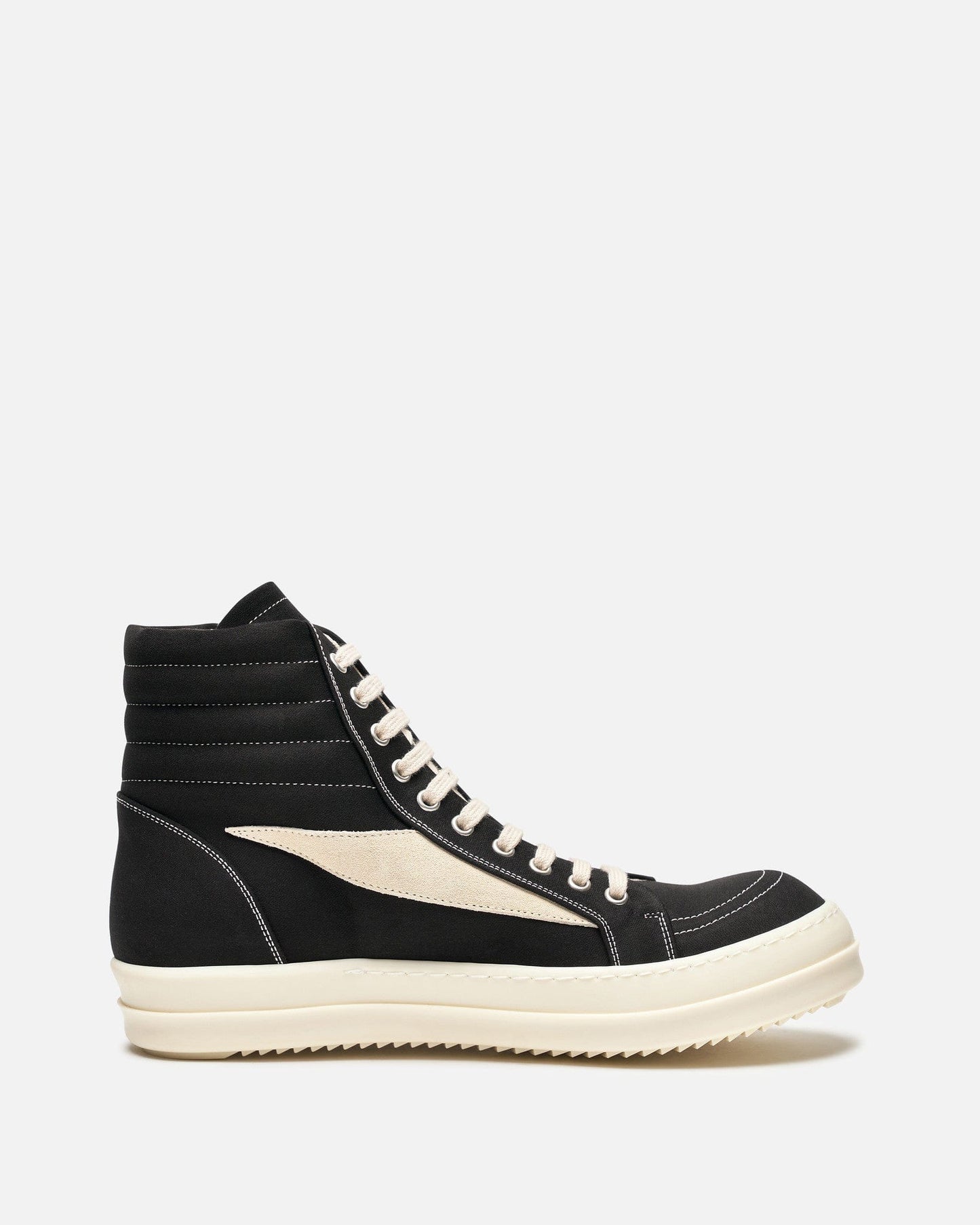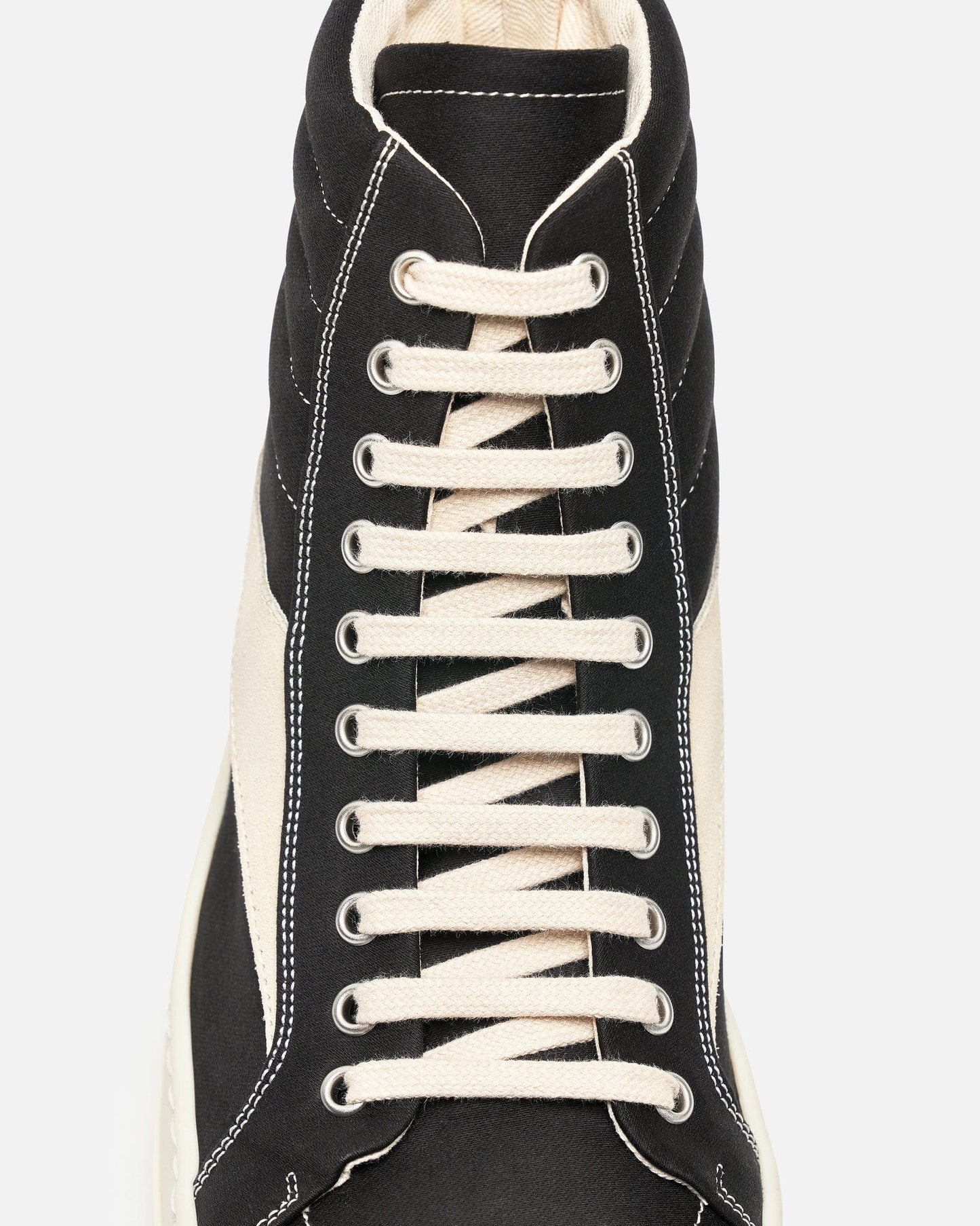 Rick Owens DRKSHDW SS24 Lido Vintage Sneakers High in Black/Milk. These sneakers feature outlined stitching at the heel, padded ankles with contrast stitching, a graphic leather applique on the sides and shark tooth soles.
