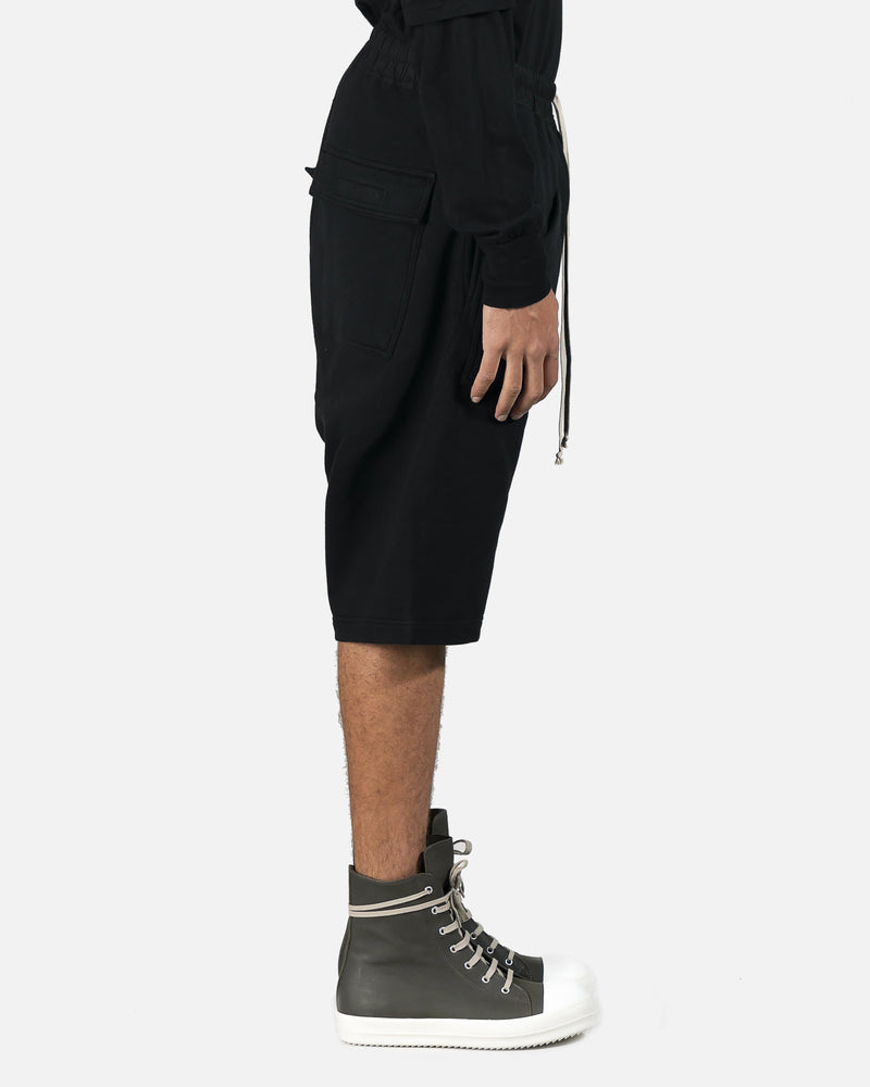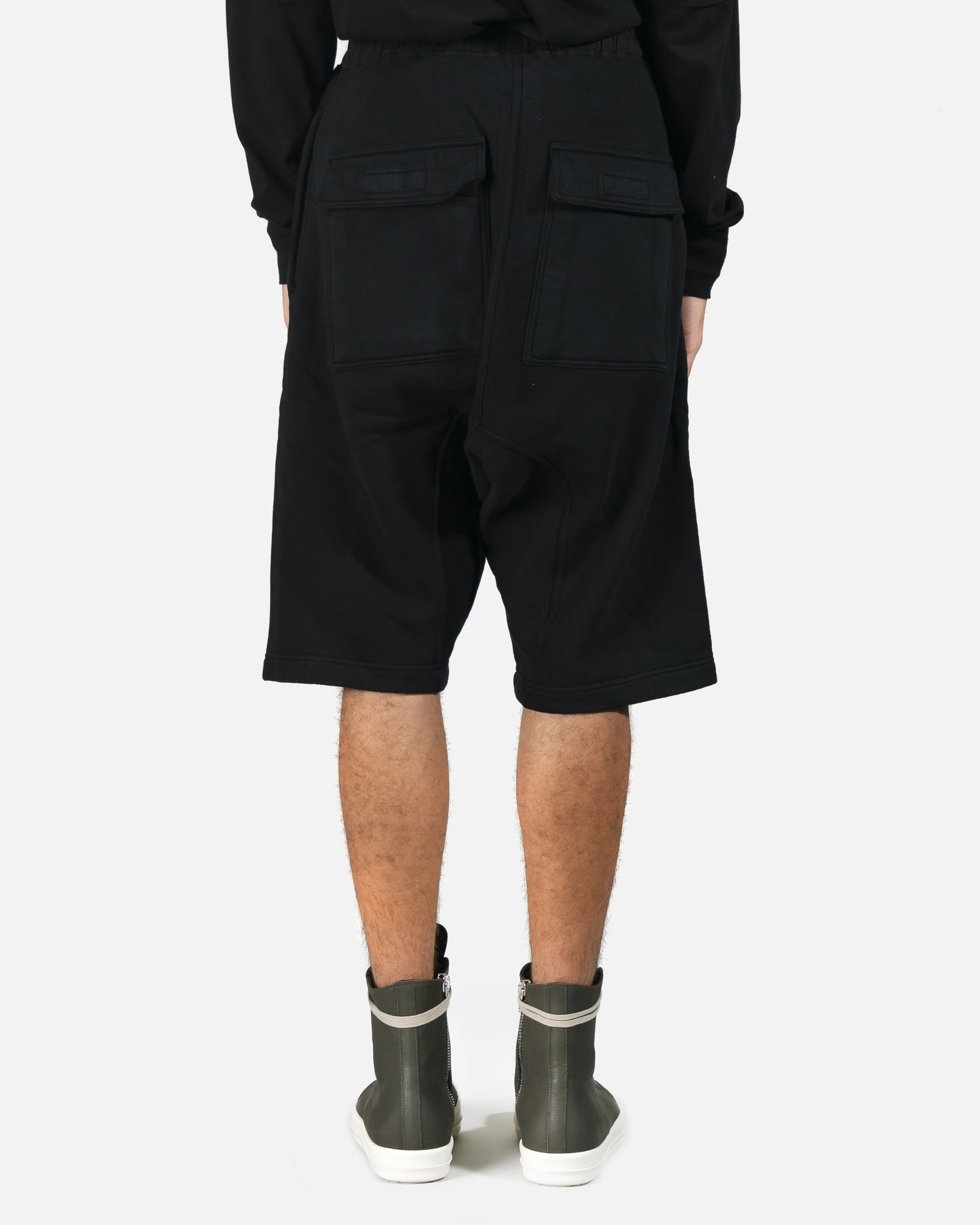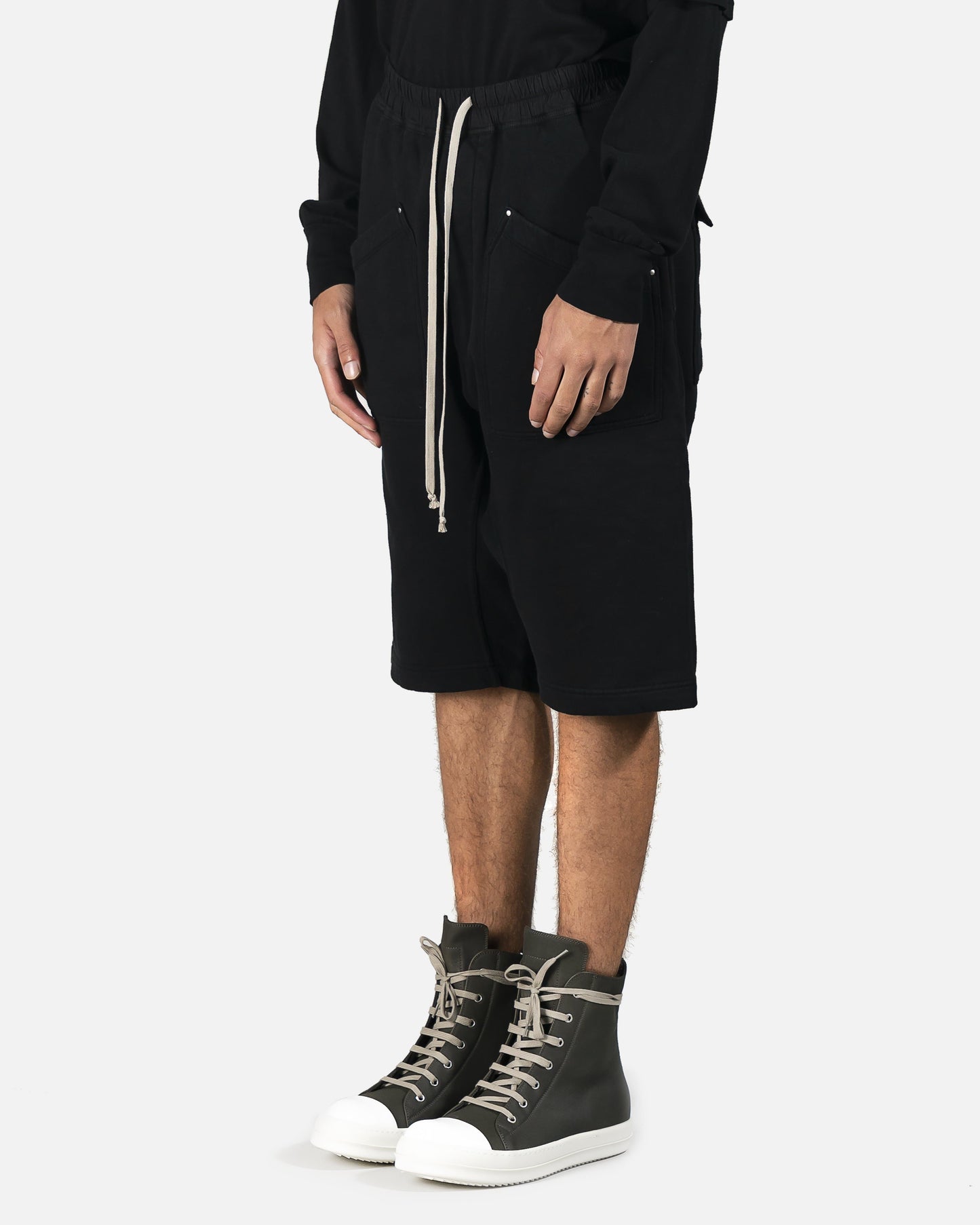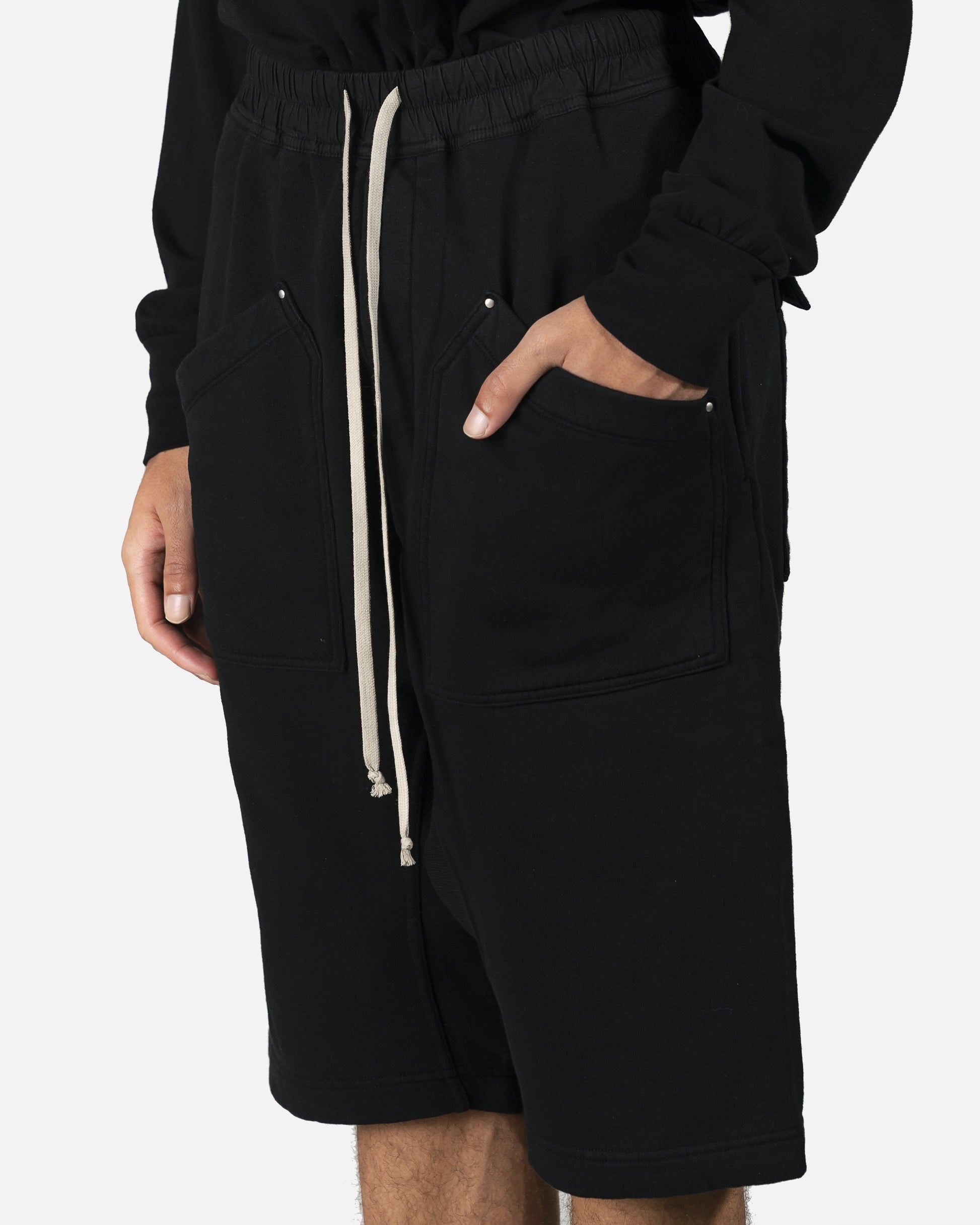 Pod short with four oversized pockets. Breathable black cotton with drop-crotch fit and natural color drawstring detail at waist.