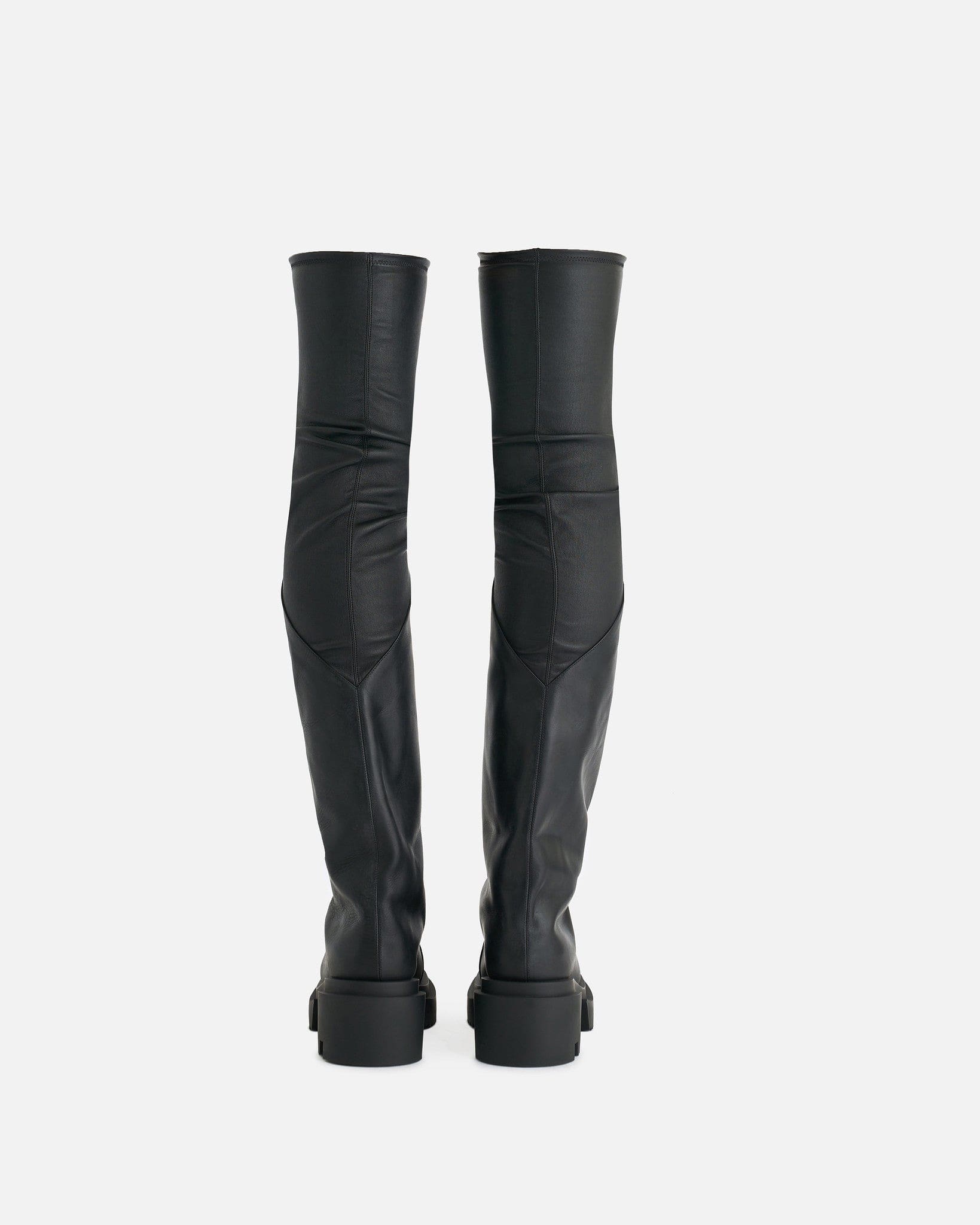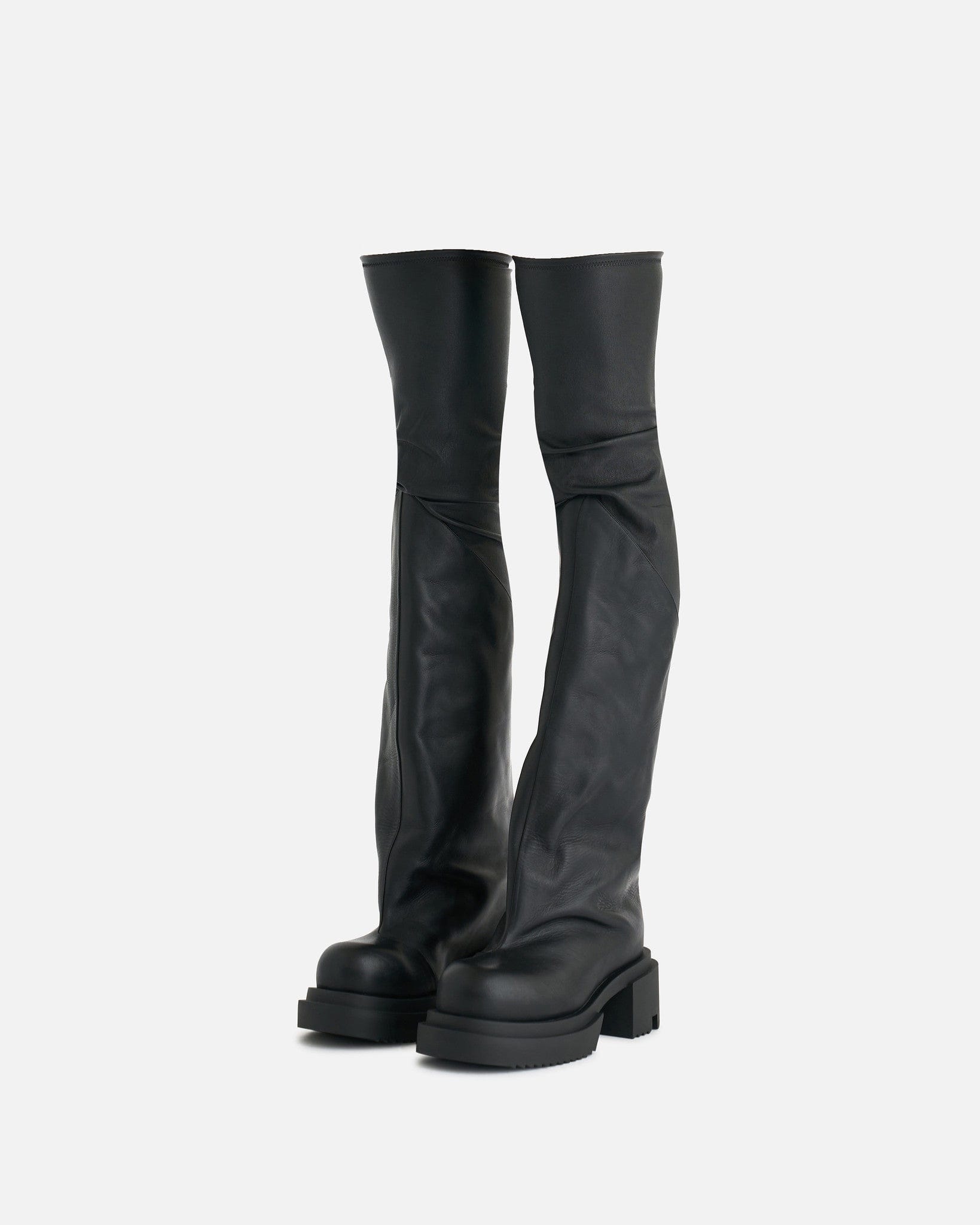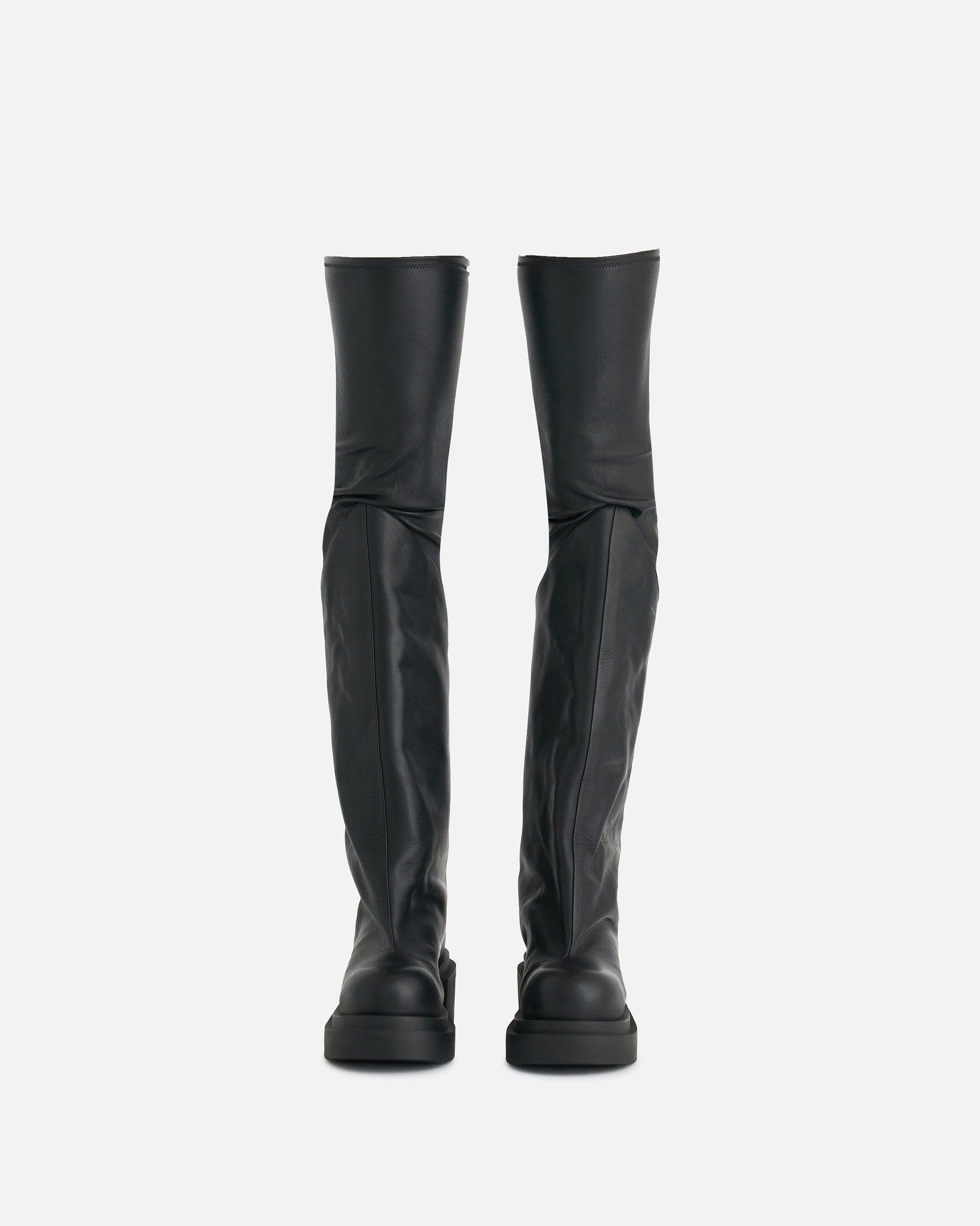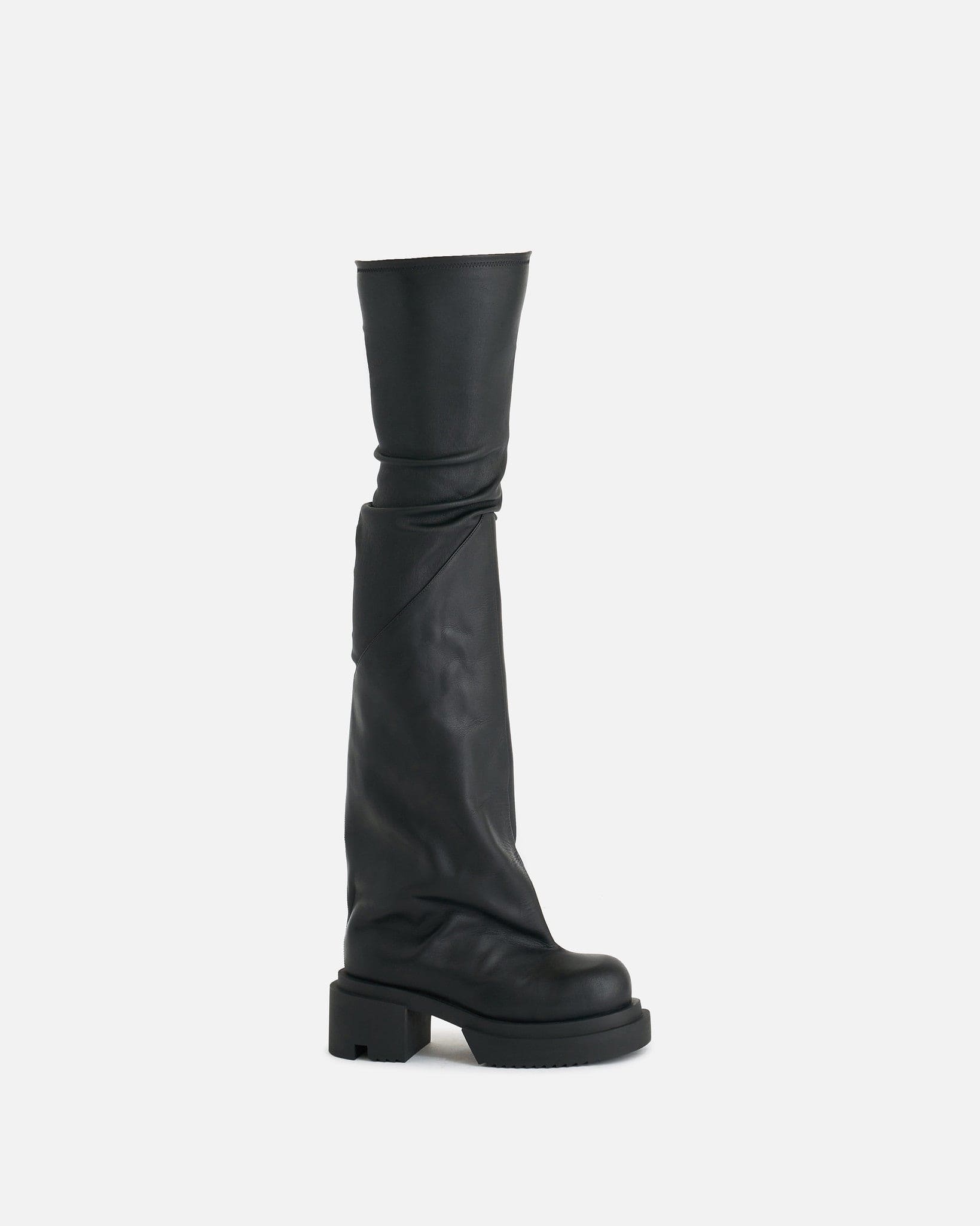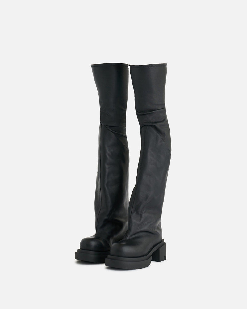 Rick Owens men's thigh high leather boots in black. These lambskin boots have a pull on silhouette, sock upper that widens from the knee to the round toe and a creeper rubber sole.