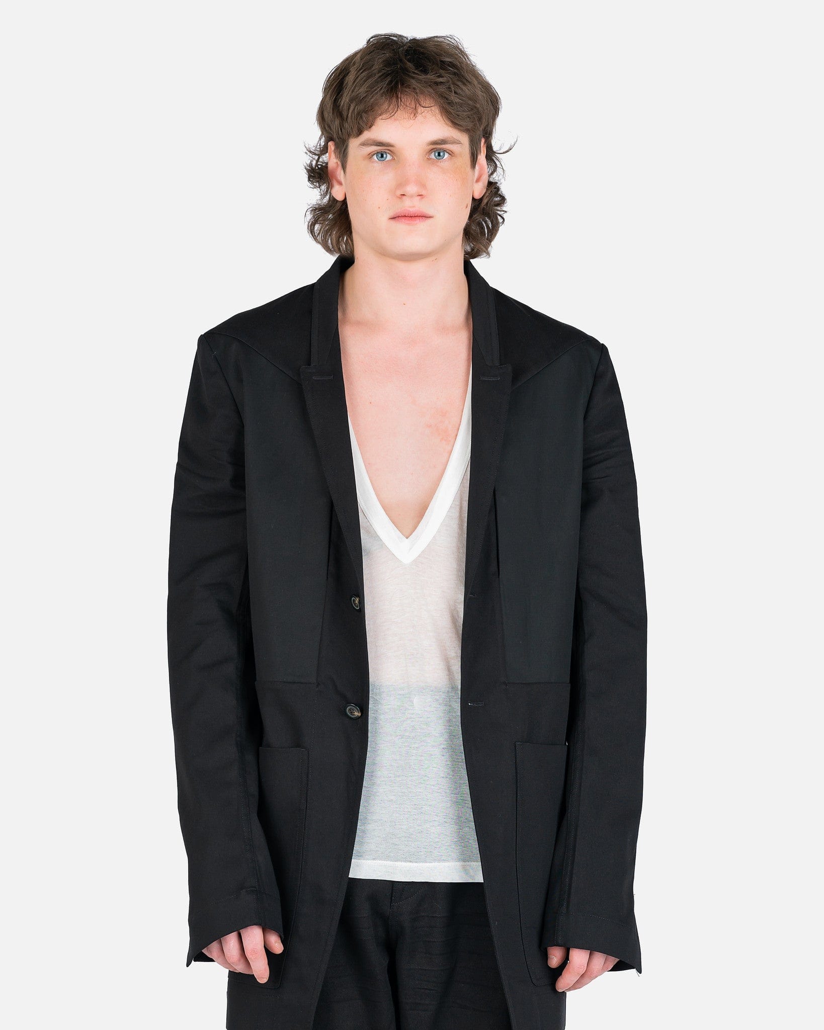 Rick Owens SS22 Fogachine men's Foglido jacket in black. This jacket has a lapel with a deep V neck, secured with front button closure. There are two fogcatcher breast pockets with snap closure and two front patch pockets with an inside zip pocket. The back of the jacket has a center vent and a cotton webbing strap across the yoke, meant to hold a fog machine. The strap features rivet detailing.
