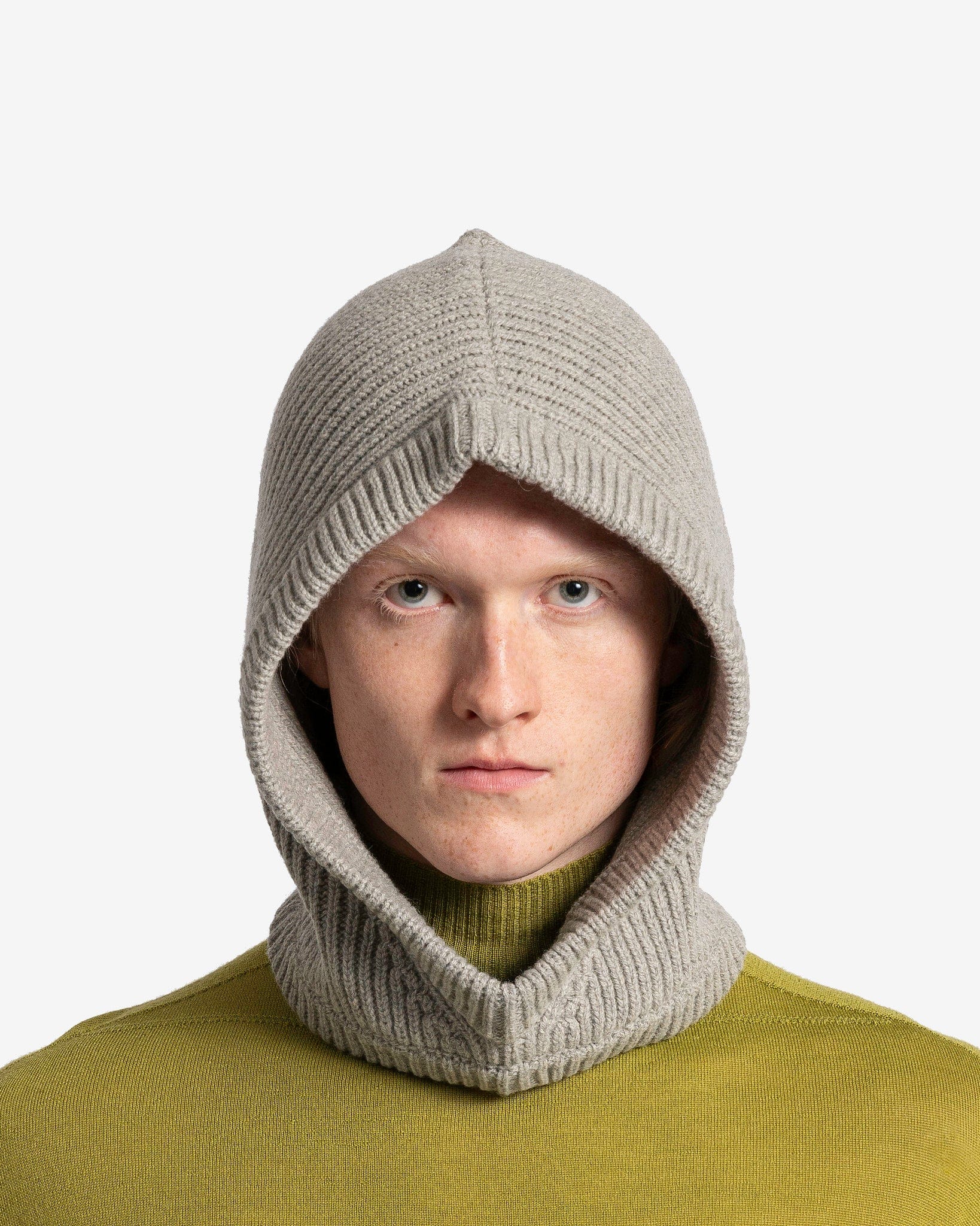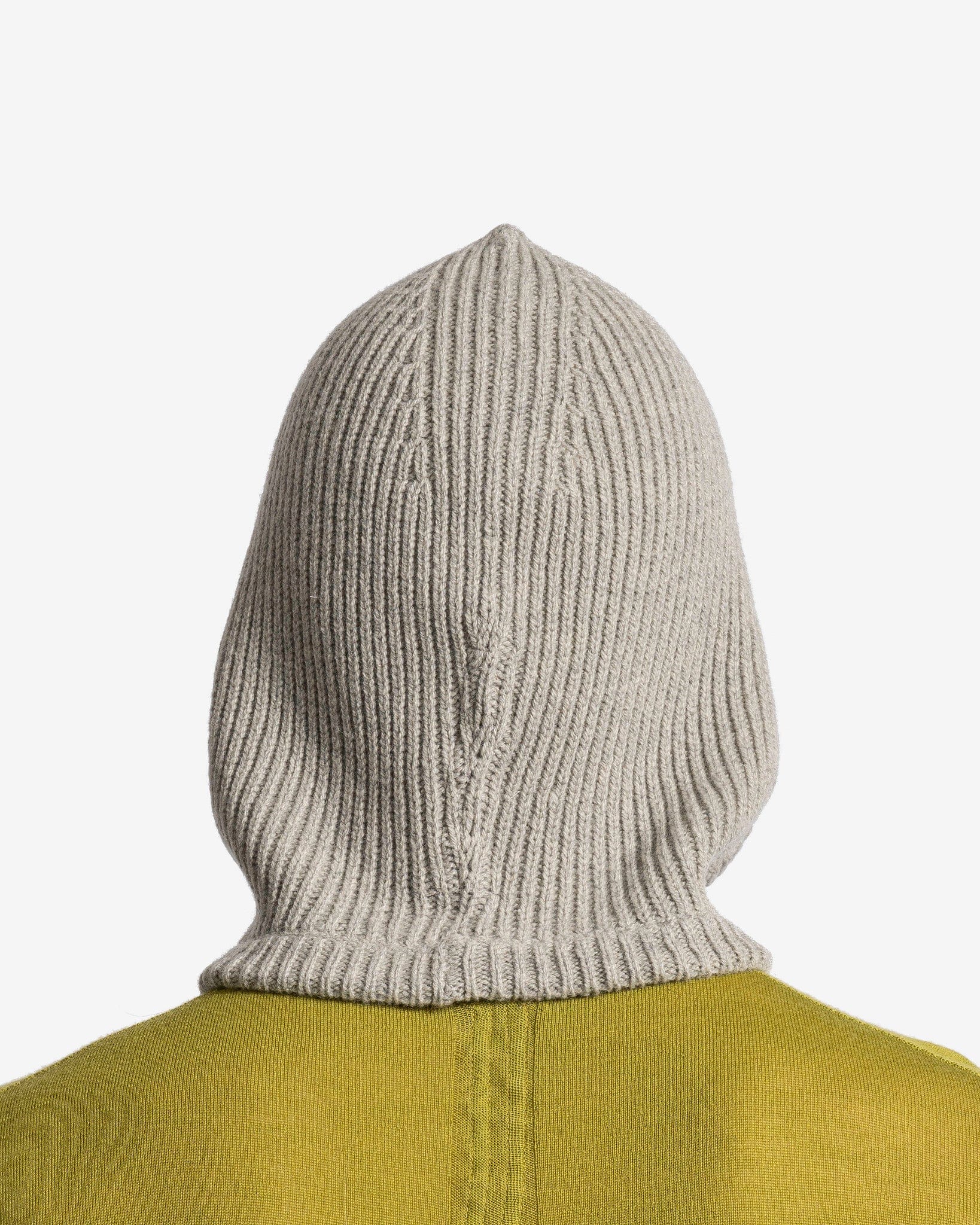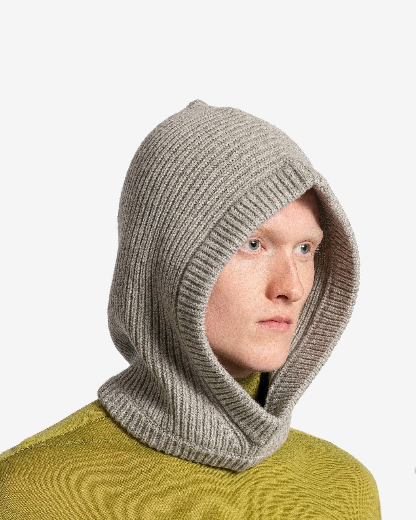 Rick Owens hooded beanie in grey. This cashmere hood is ribbed knit and has a slip on silhouette.