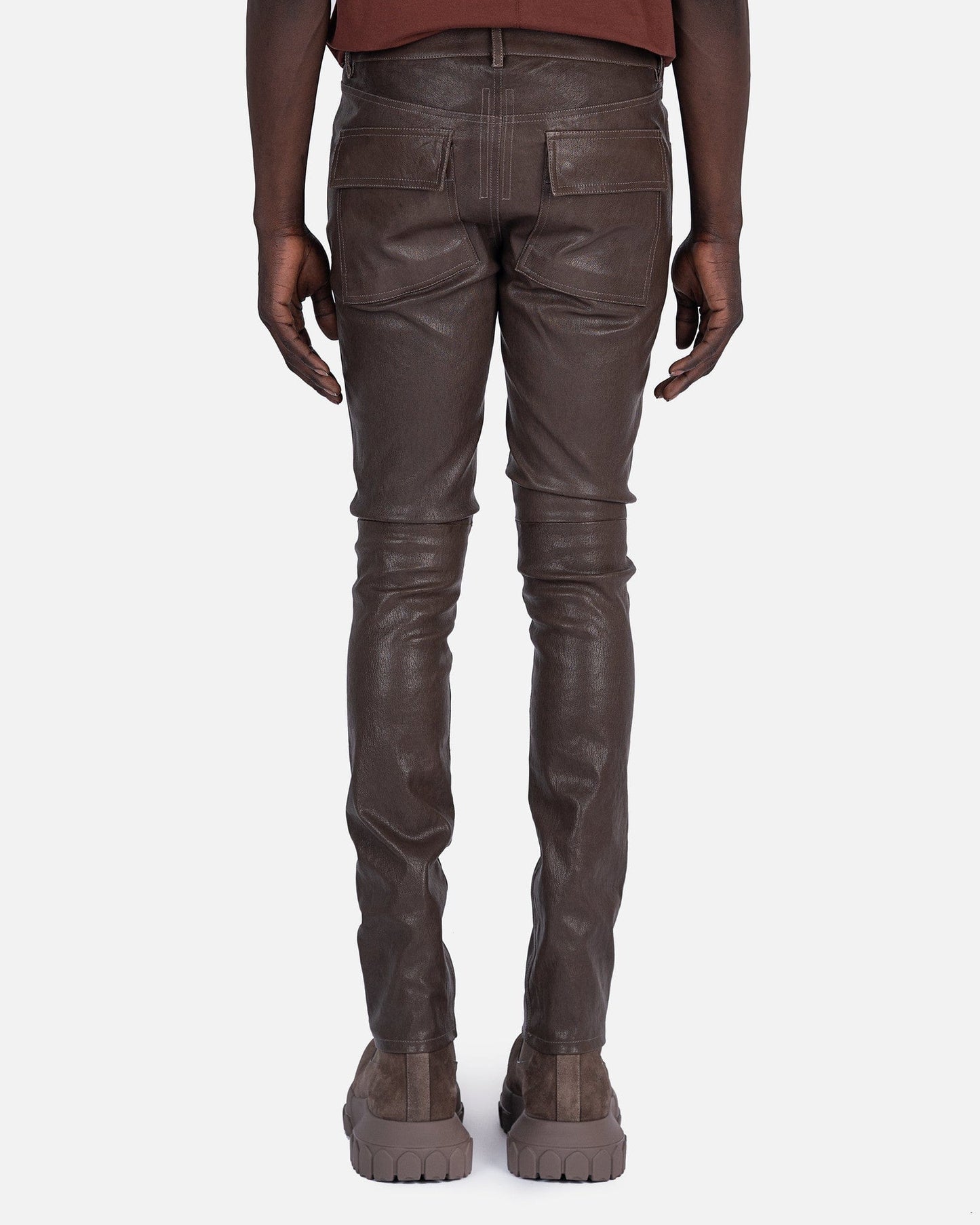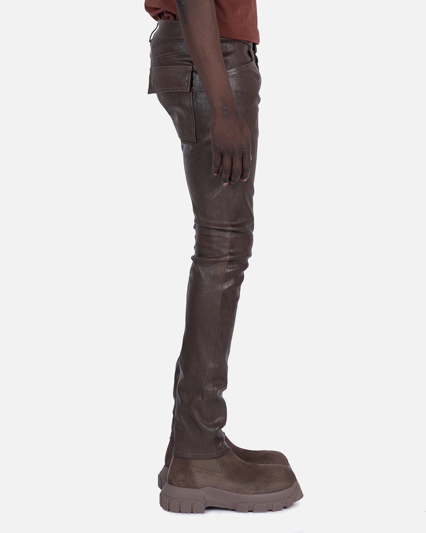 Rick Owens FW22 Strobe leather pants in dust. These tyrone jeans feature a mid-rise cut with a snug fit. They follow the traditional five pocket design with two angular front pockets and two back flap pockets.