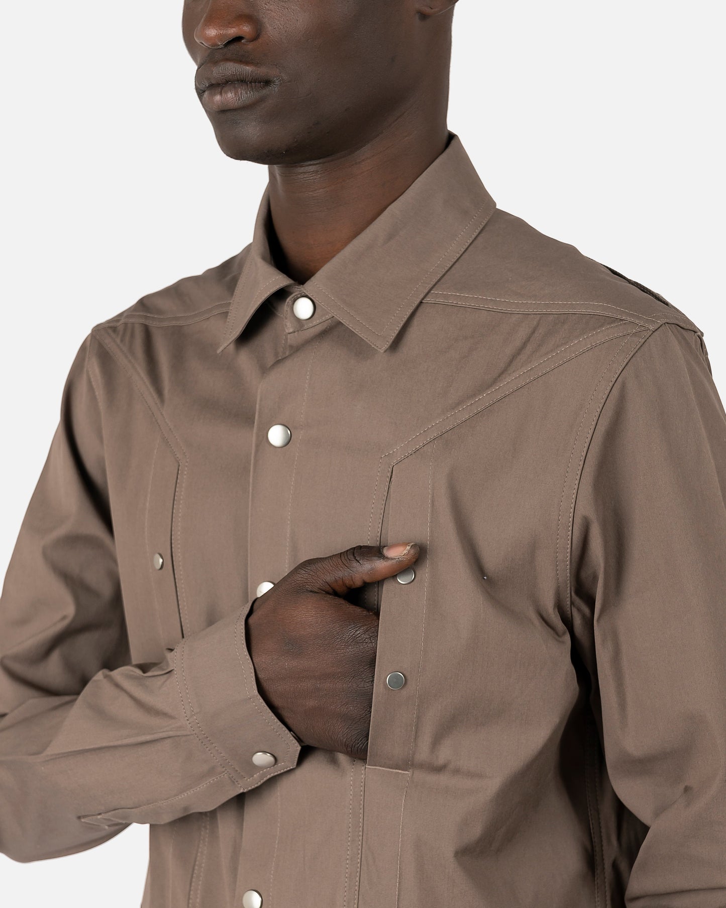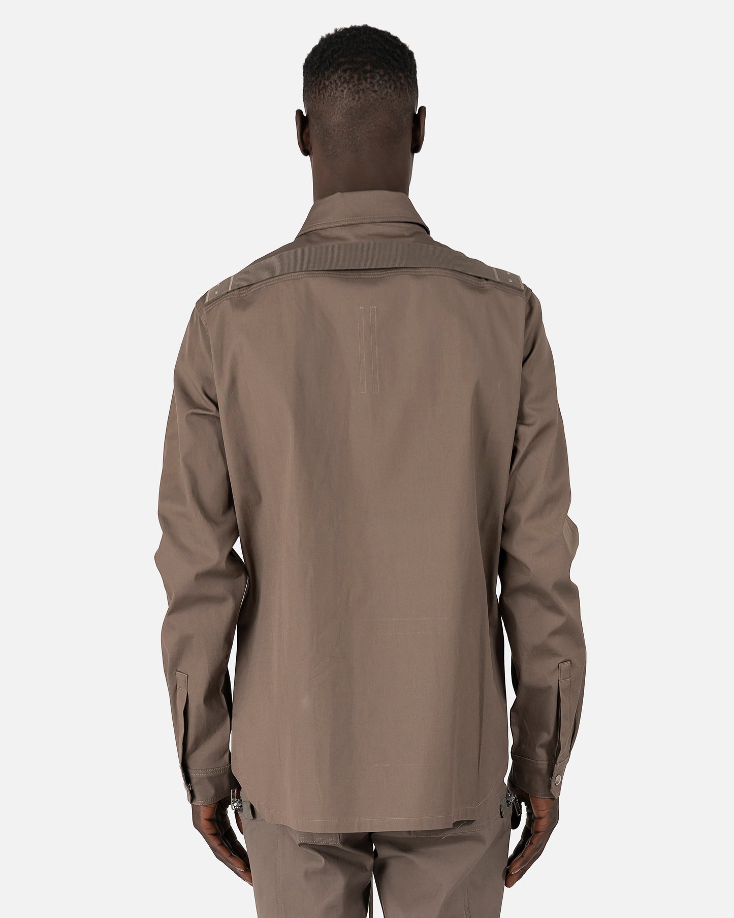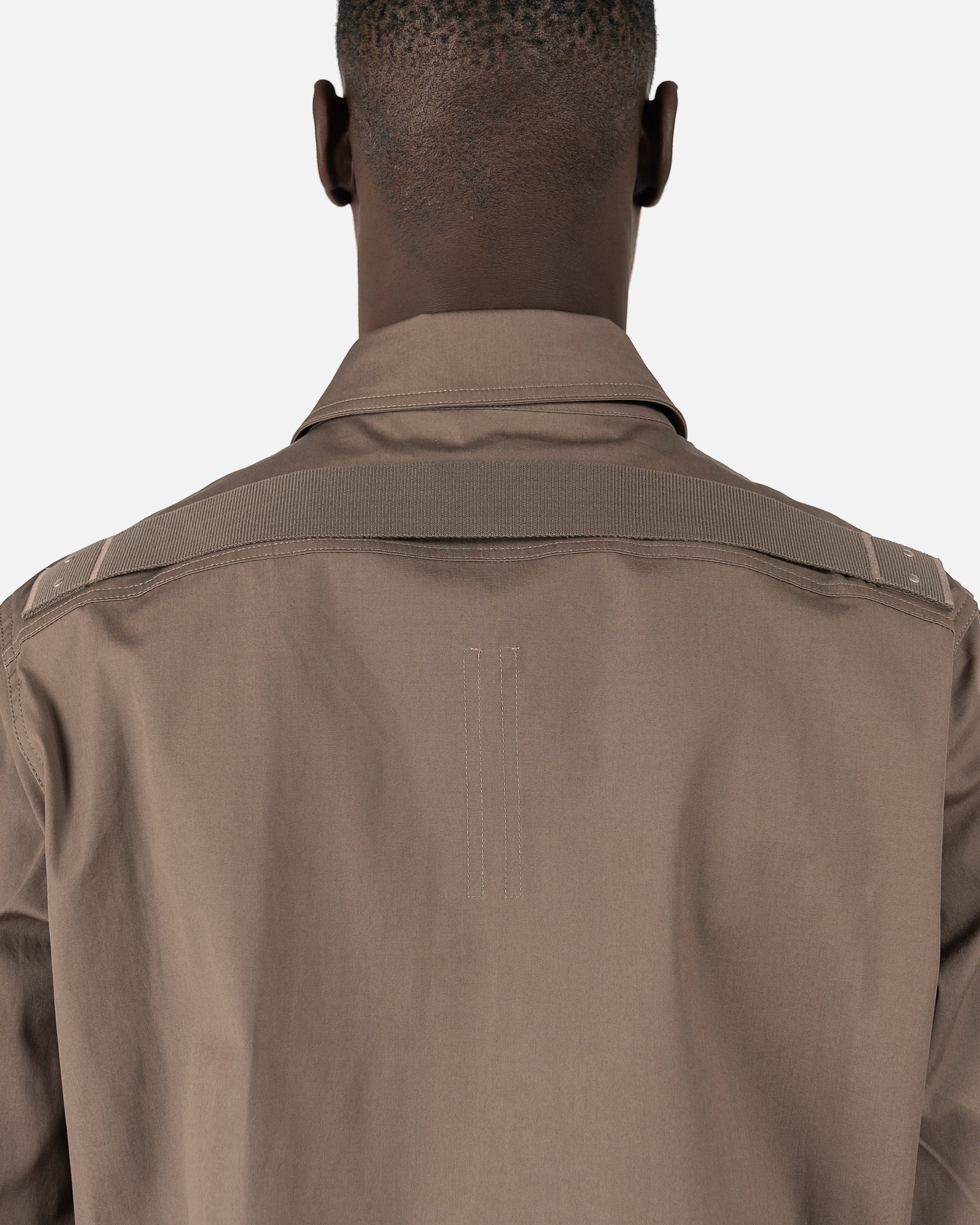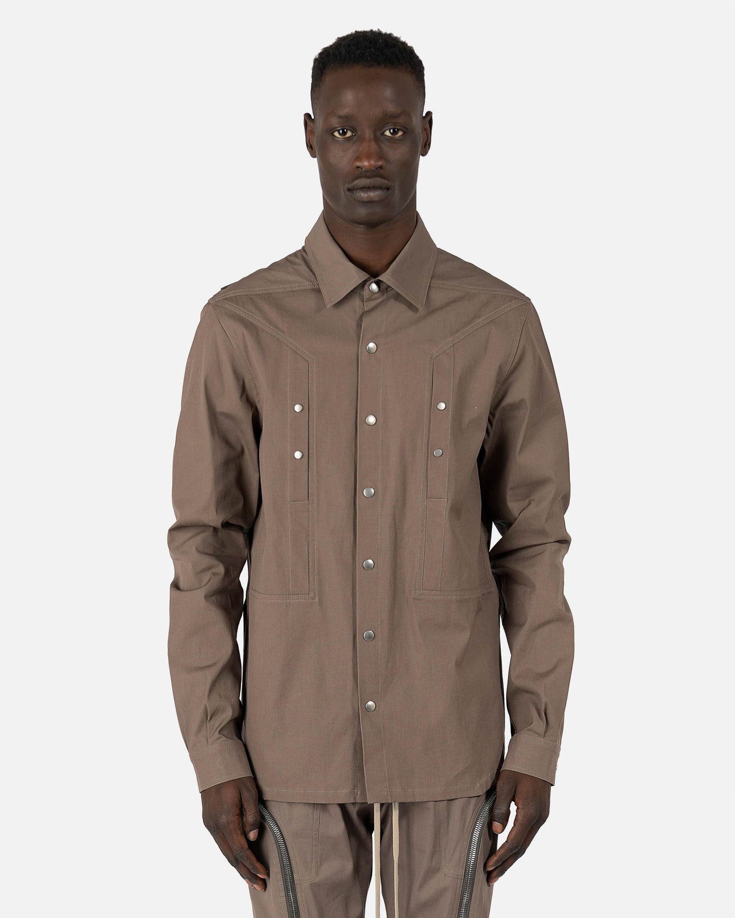 Rick Owens SS22 Fogachine outershirt in dust grey. With front press stud closure in silver, this shirt also has front flap pockets featuring the same studs. This top features a cupro lining and curved hem.