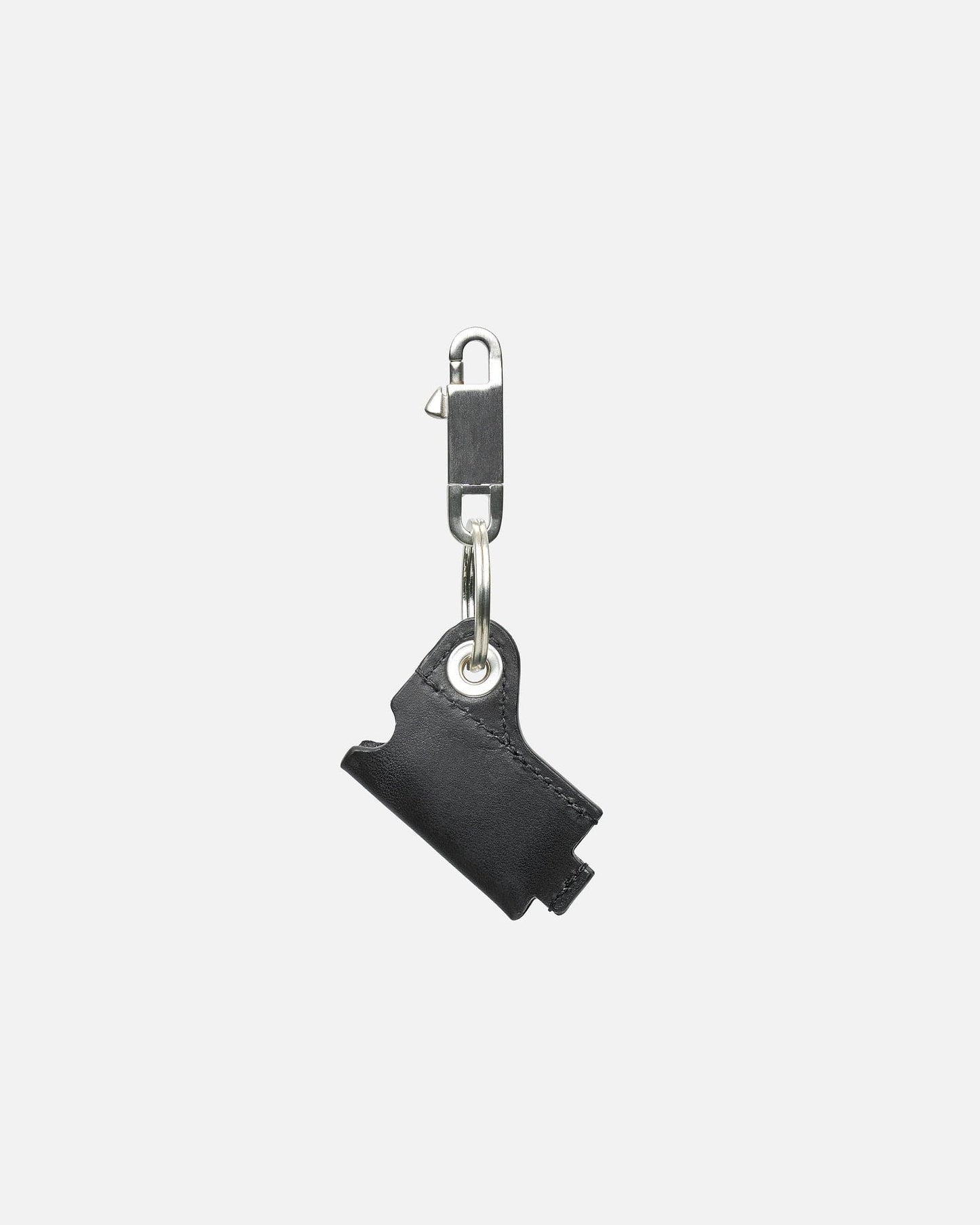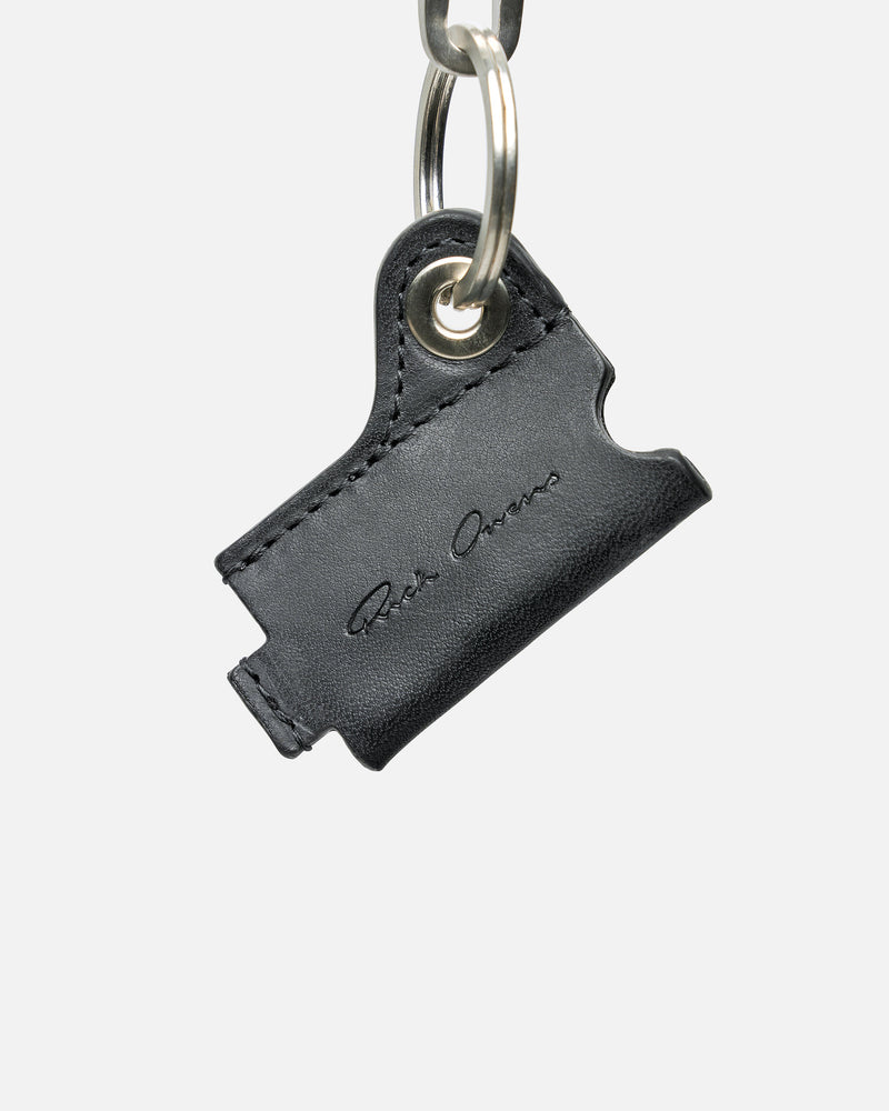 Rick Owens Porterville Mini Lighter Holder in Black. This keyring features a lanyard clasp, silver-toned hardware, metal eyelet and debossed logo on the front.