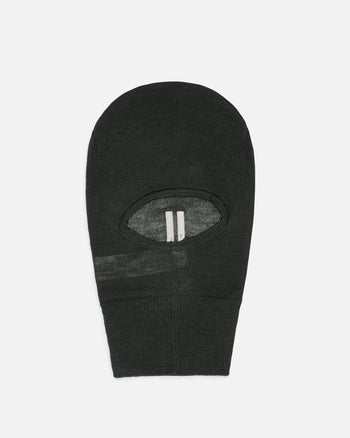Rick Owens Porterville Skull Balaclava in Forest. This balaclava features a wide opening at the front for the eyes and a wide ribbed knit neck.