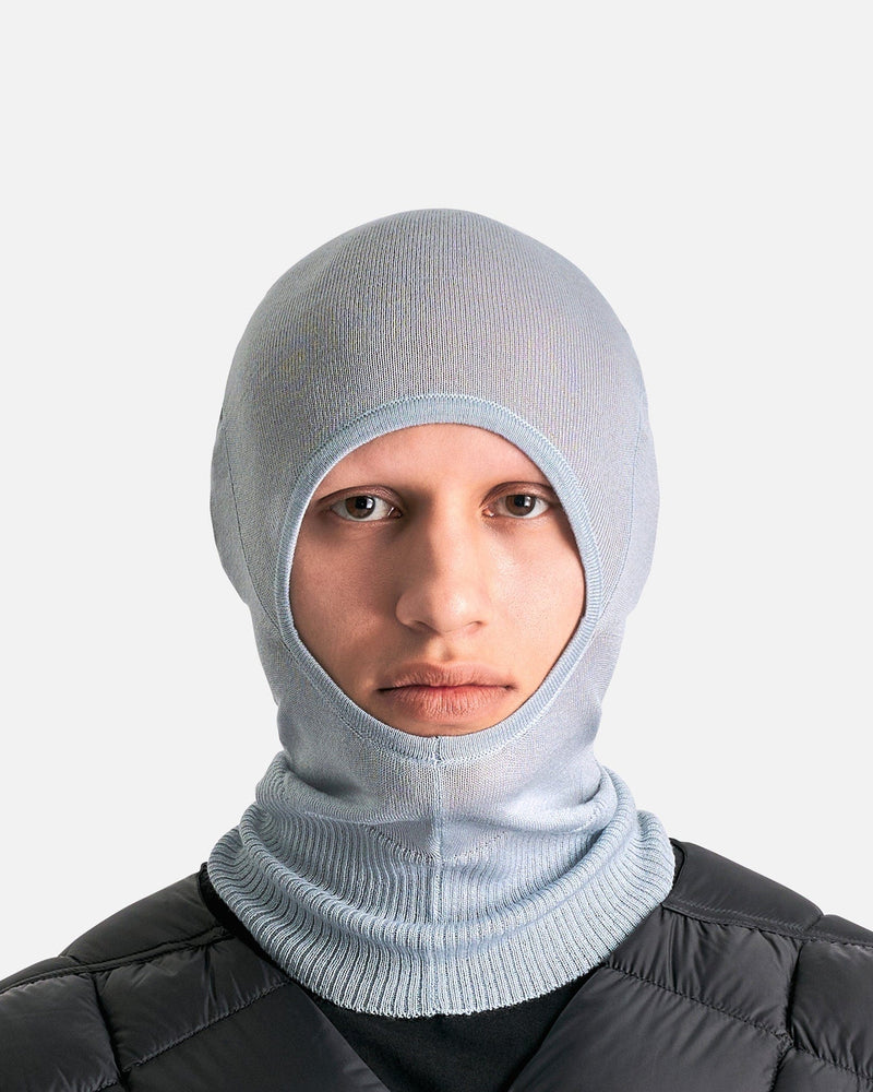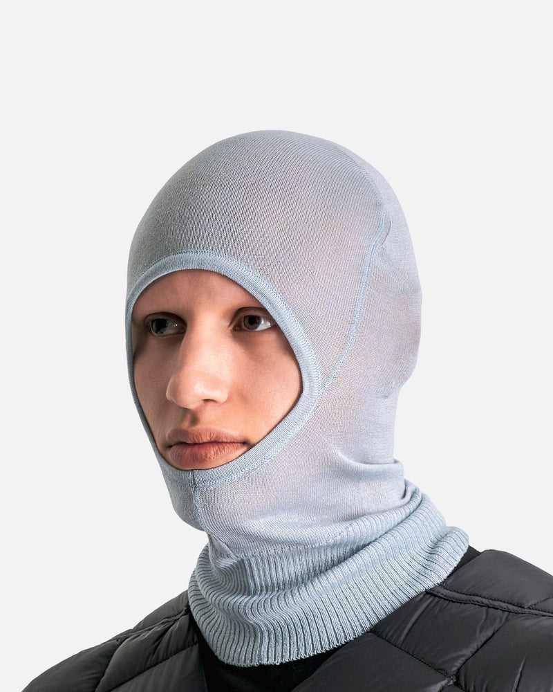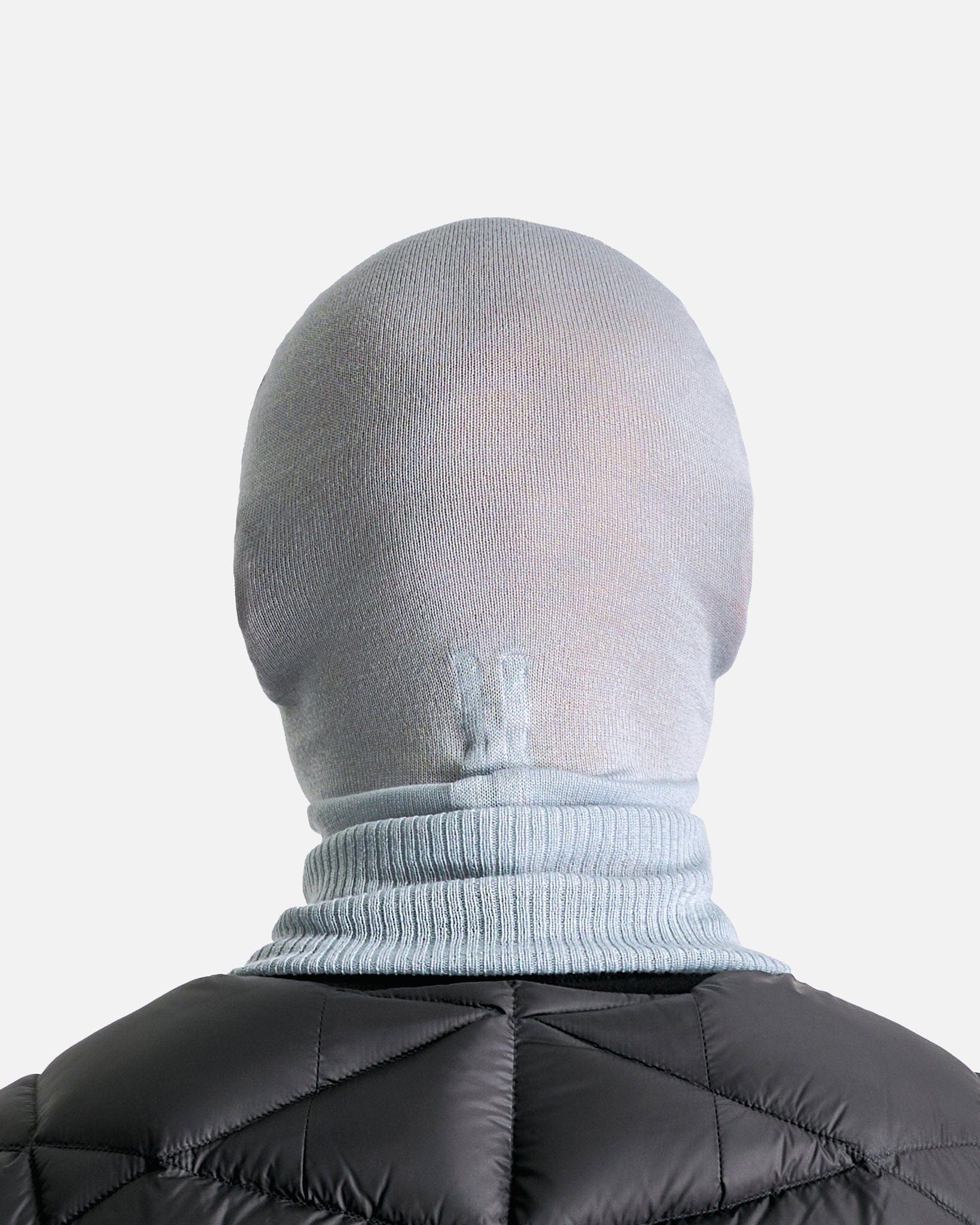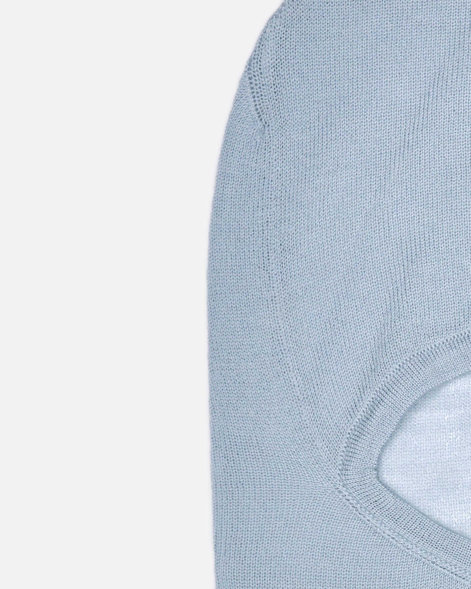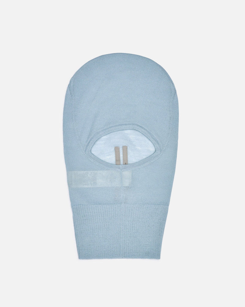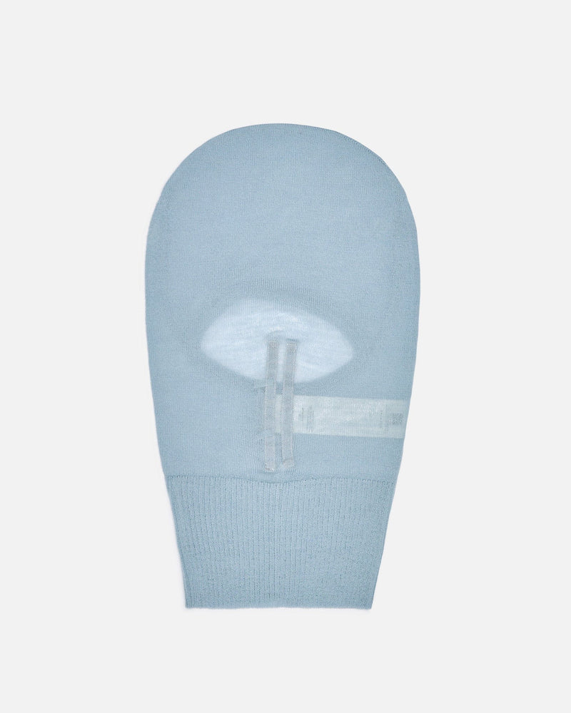 Rick Owens Porterville Skull Balaclava in Pale Blue. This balaclava features a wide opening at the front for the eyes and a wide ribbed knit neck.