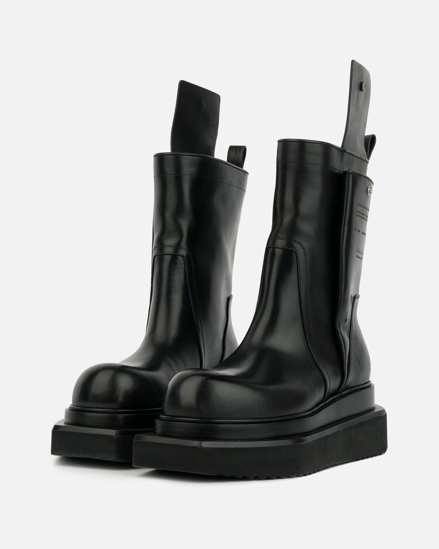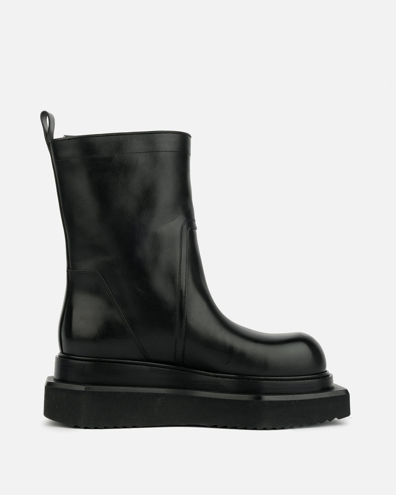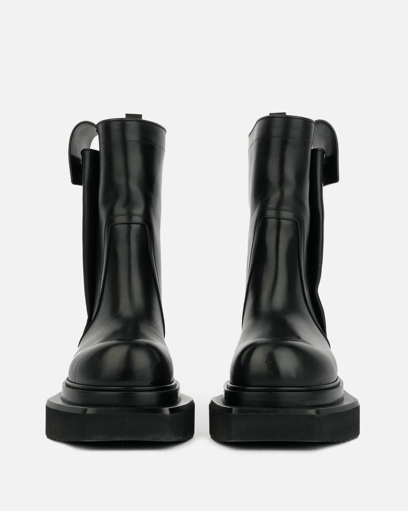 Rick Owens SS22 men's mid-calf calfskin boots in black. These chunky boots have a platform sole that is 3" in height. There is a flap pocket meant to hold a fog machine on the outer side with an embossed logo. The heel features a pull loop for easy wear.